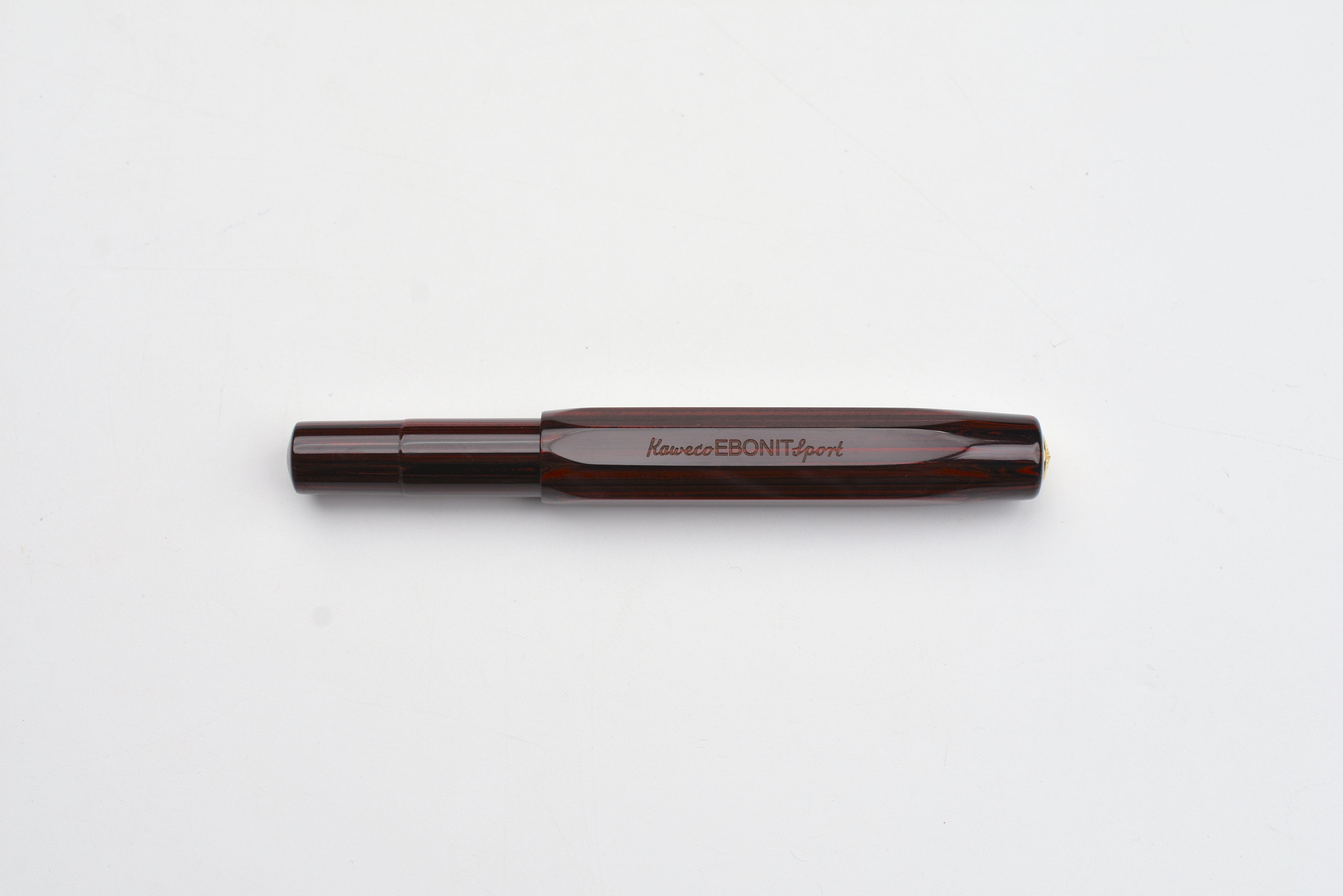 This Kaweco Sport Fountain Pen celebrates Kaweco's 140th Anniversary with the limited edition production of Ebonit (Ebonite in German) Sports! Ebonite is a material made from a natural hardened rubber, created as a substitute for ebony, the African hardwood. Hard rubber has often been the material of choice for producing long-lasting writing instruments for more than 100 years because of its durability and lightweight feel. The marbling and high polished surface showcases a surface that references the appearance of exotic wood, and is complemented by gold plated accents.