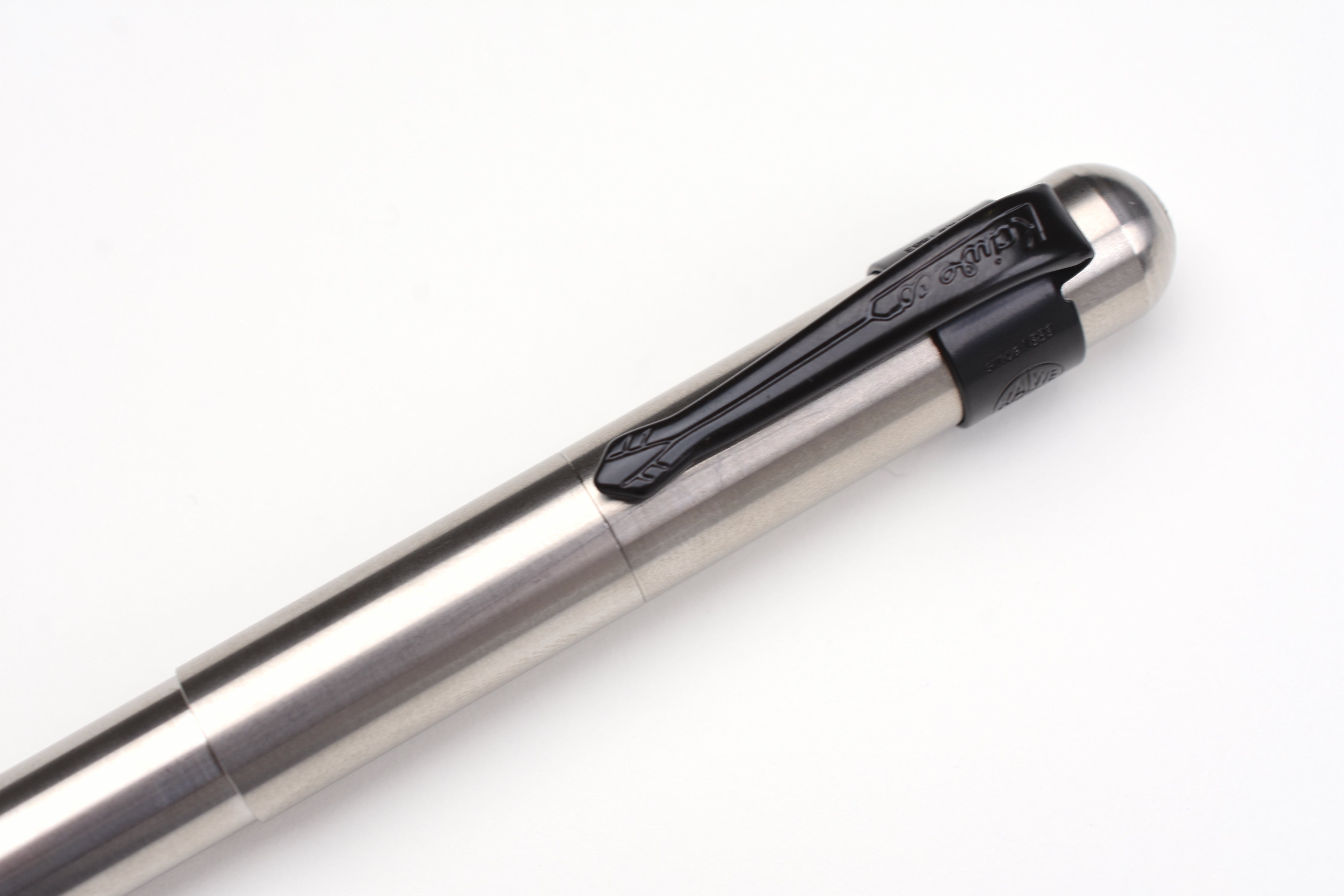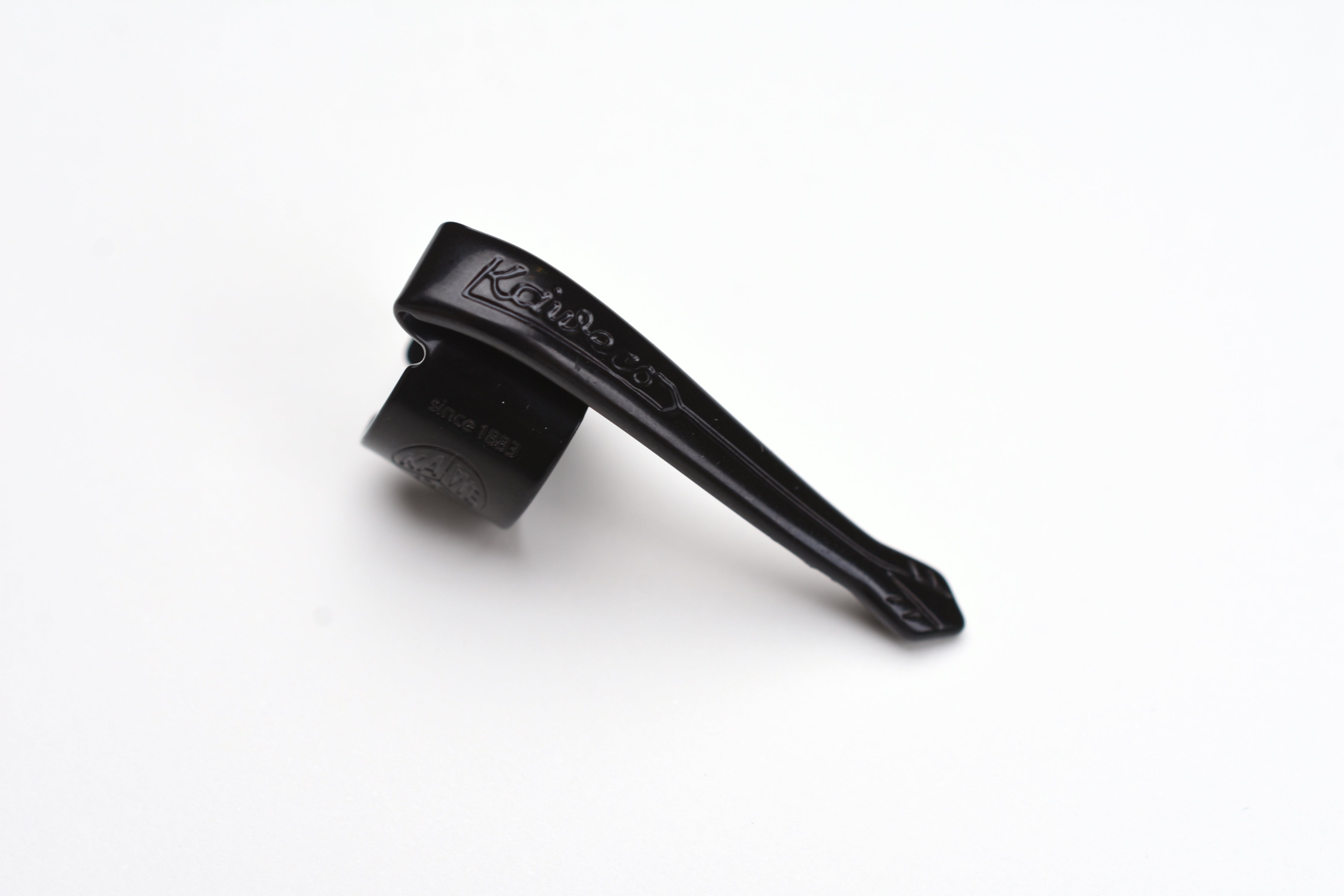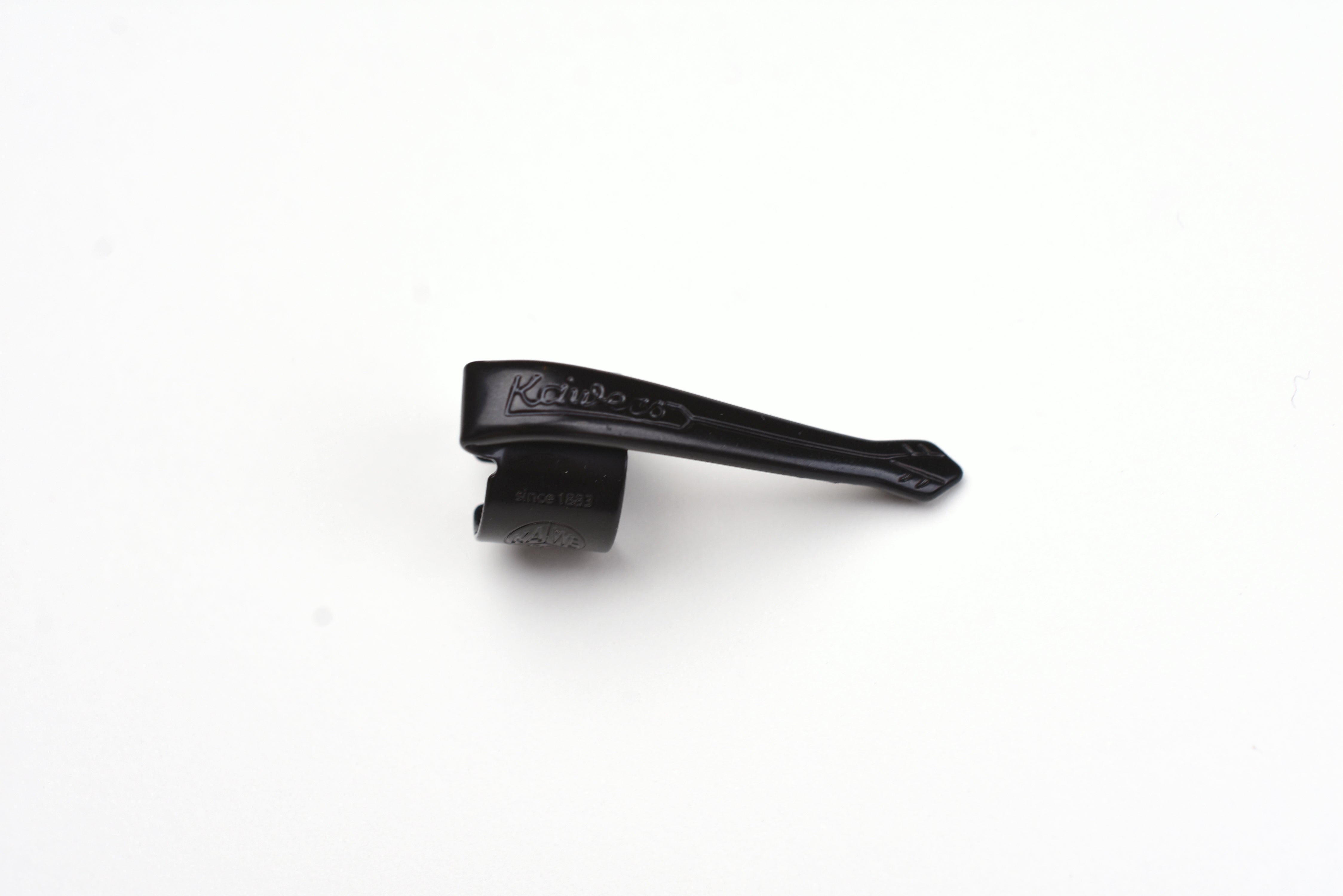 Kaweco Supra Deluxe Clip - Black. Use this Kaweco Clip with any Kaweco Supra fountain pen by sliding it onto the cap of the pen. The addition of the clip allows you to clip your pen to your shirt pocket, attach it to a pen holder on a notebook, and securely store your pen however you want. A Kaweco logo is engraved on the side of the clip and Kaweco is engraved on the clip surface along with other embellishments. The clip portion itself is curved, giving the clip an elegant look.