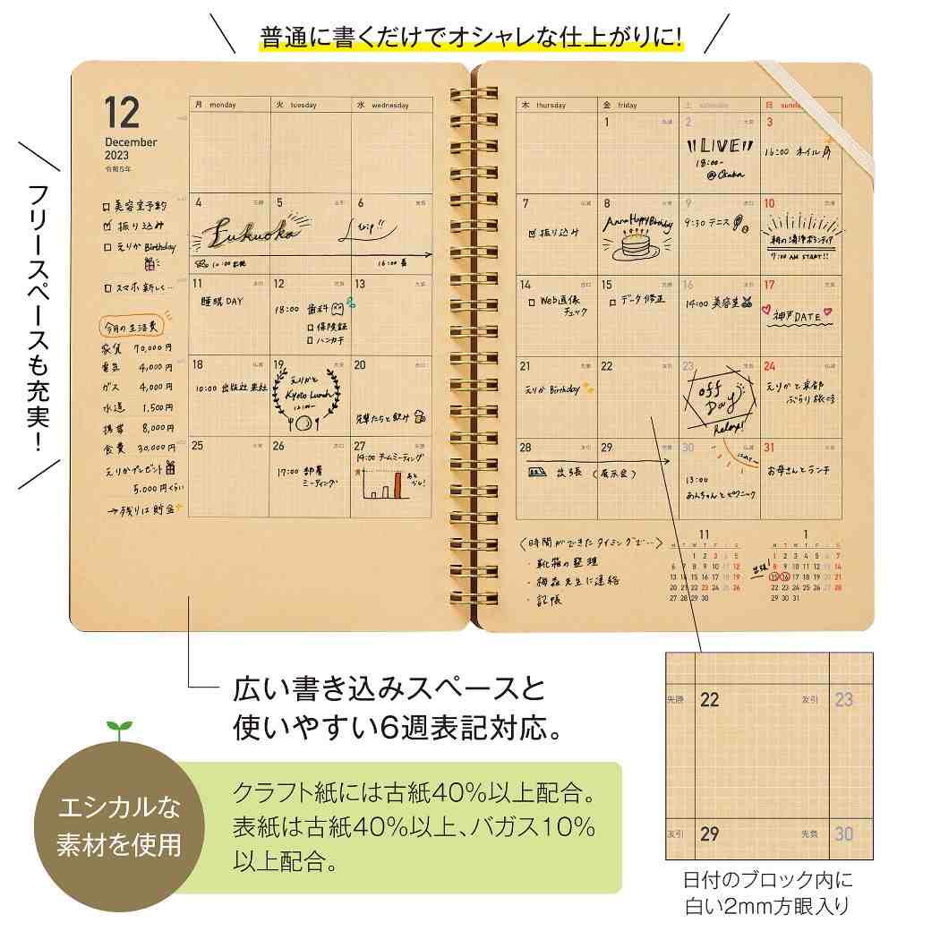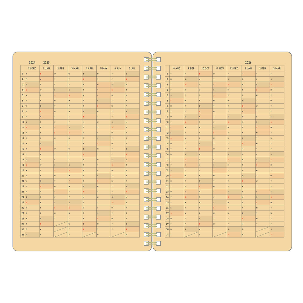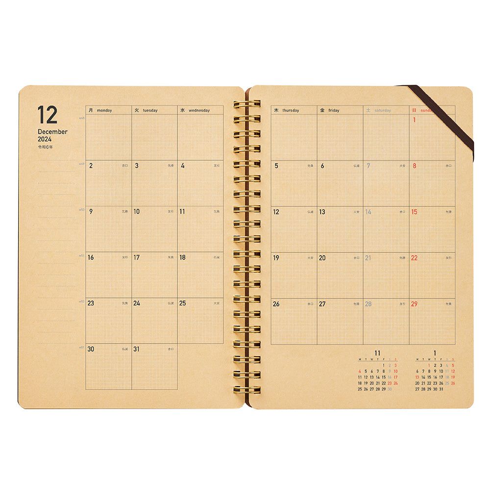 The Kraft Work Diary from Kleid is a spiral-bound planner that uses recycled paper. It comes with a 2025 and 2026 yearly overview, 2026 yearly plan, monthly schedule pages and note pages with Kleid's signature 2mm grid. In the monthly schedule, each date square comes with the 2mm grid lines for maximum organization. The planner is lightweight and the B6 size makes it convenient to bring around with you. Some useful features include an elastic band on the top corner, which can be used as a bookmark or a pen holder, and a double-sided pocket on the last page.
