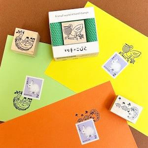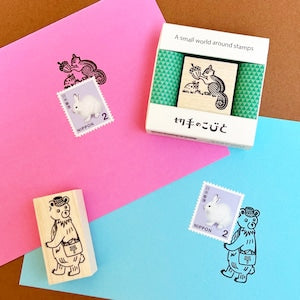 Kobito Stamps are rubber stamps made to decorate around postage stamps. They feature characters that interact with a black square which is where a postage stamp should be placed. When sending out letters, postcards, or invitations, these decorations can be used in combination with postage stamps to personalize your message.