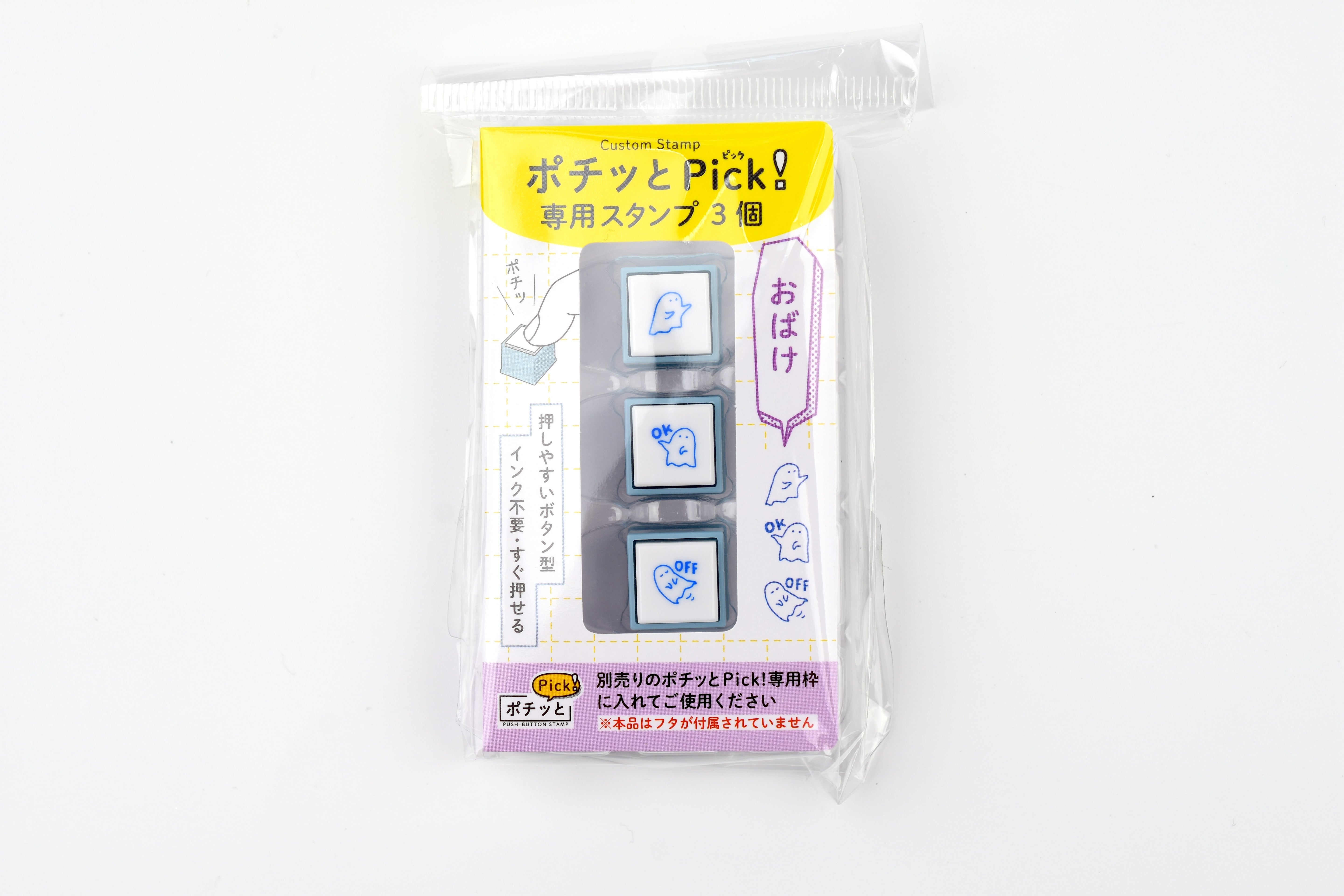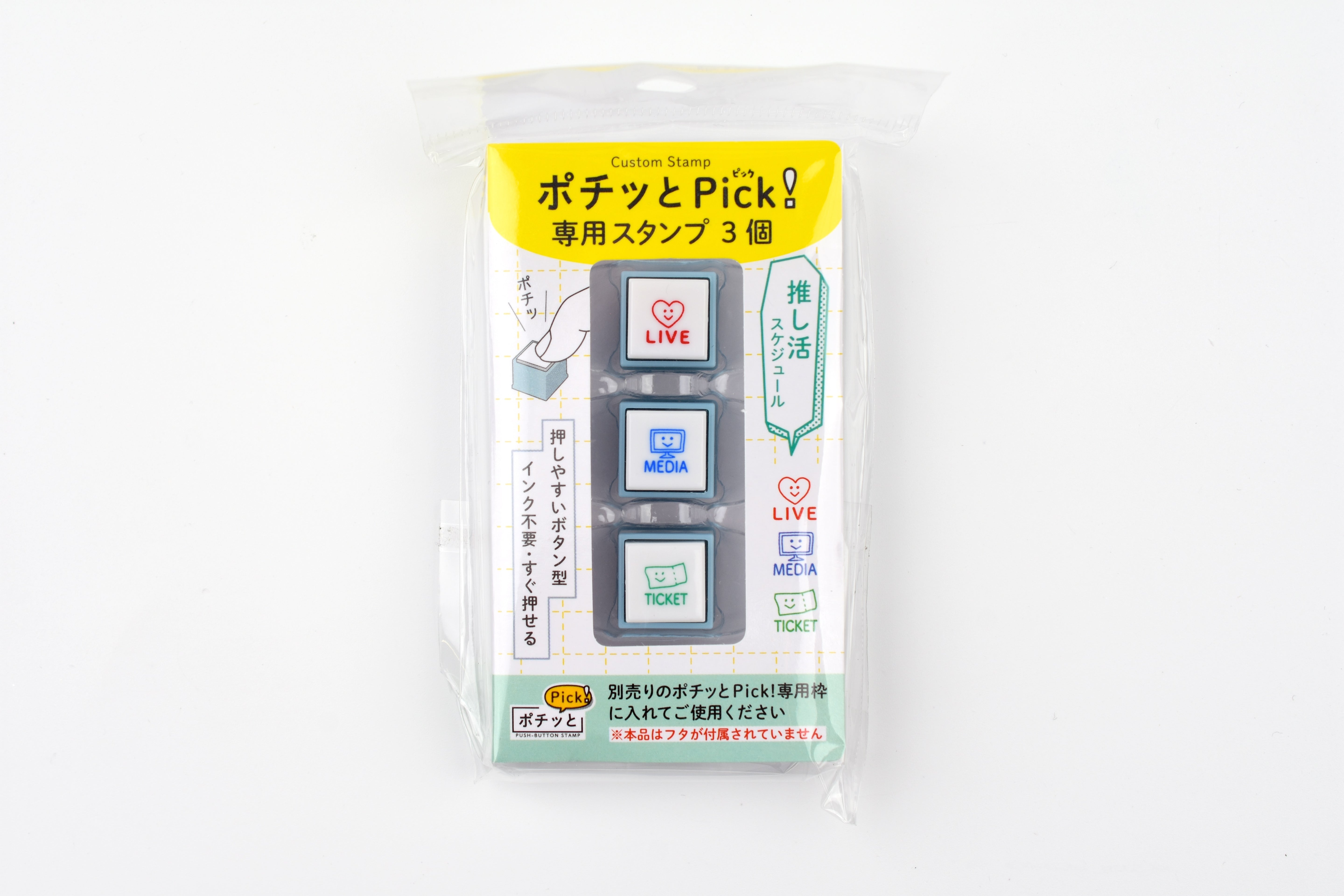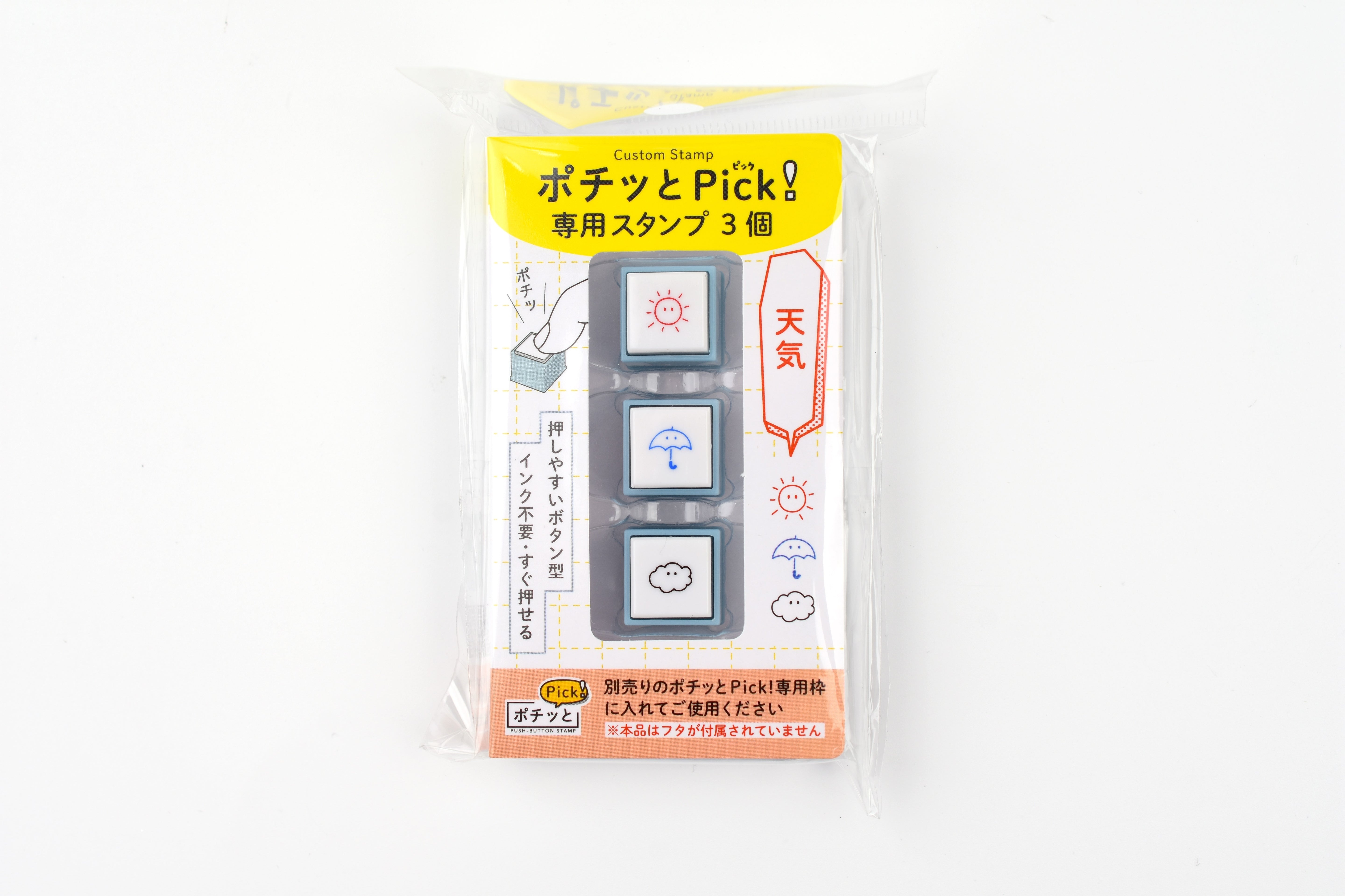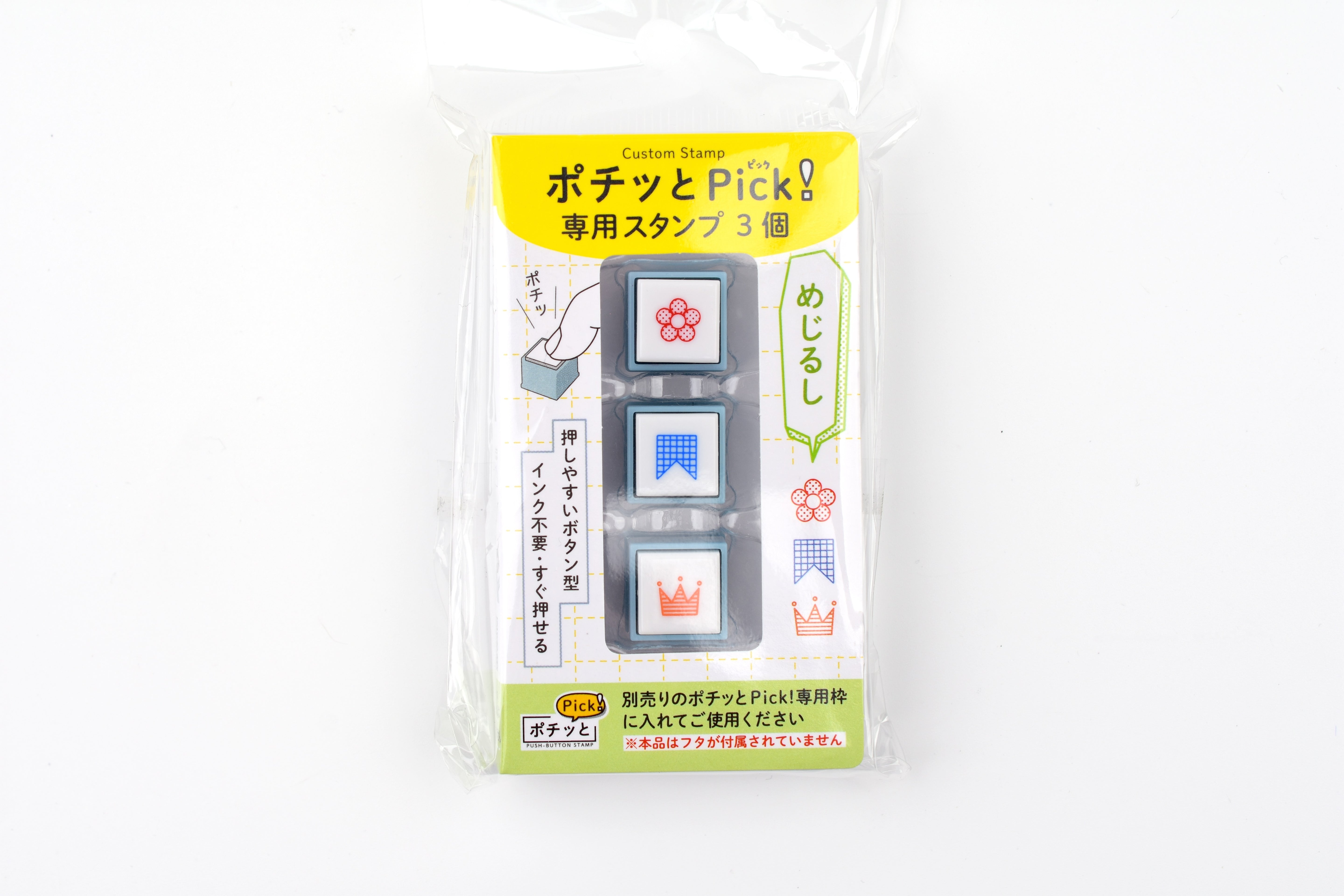 The Pochitto Pick! Push-button stamp now comes in a new format: a 3-pack of exclusive stamps and a separate exclusive frame (with case) that holds up to six stamps. These self-inking stamps can be pressed like a button to apply designs easily and cleanly to paper.