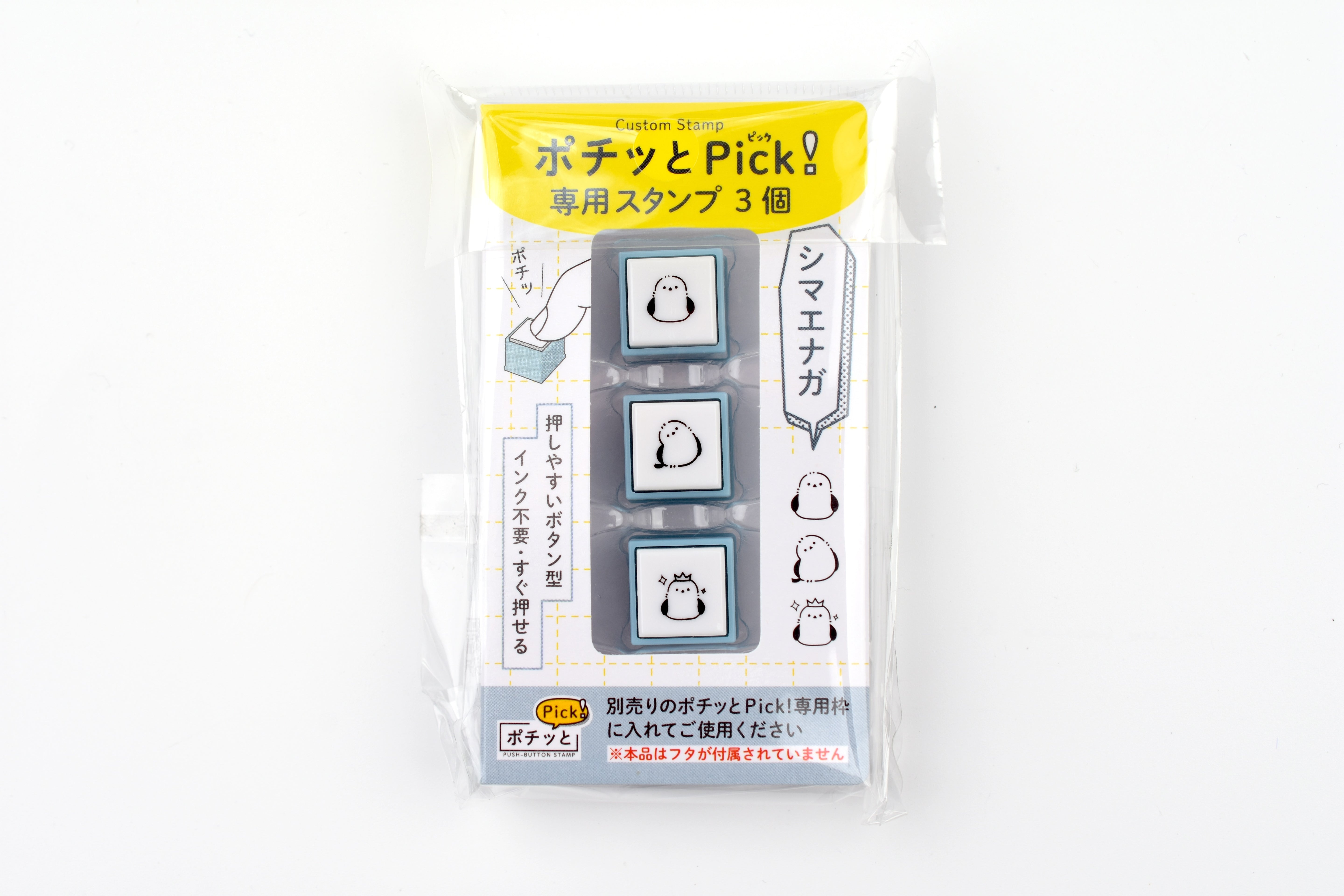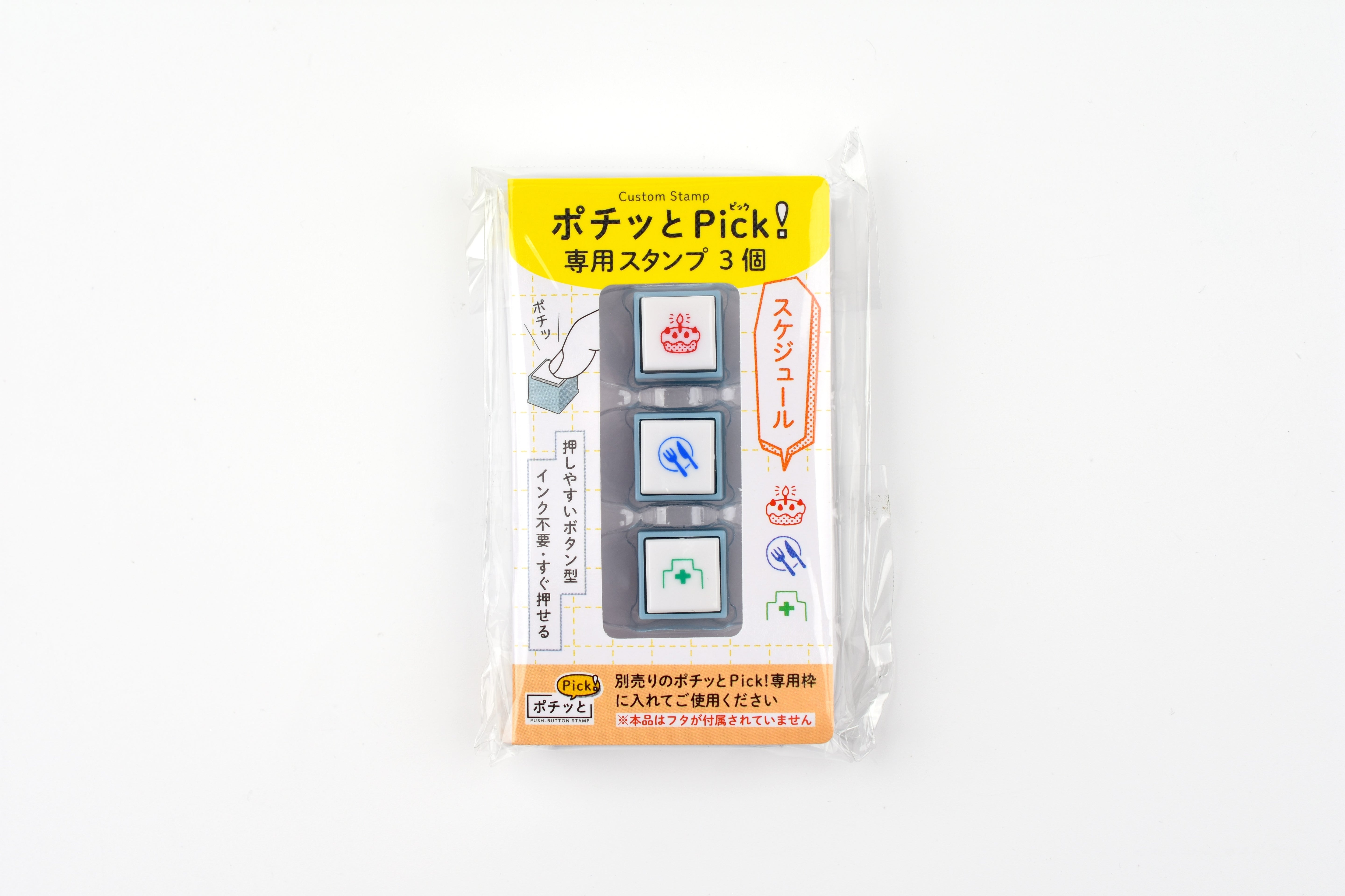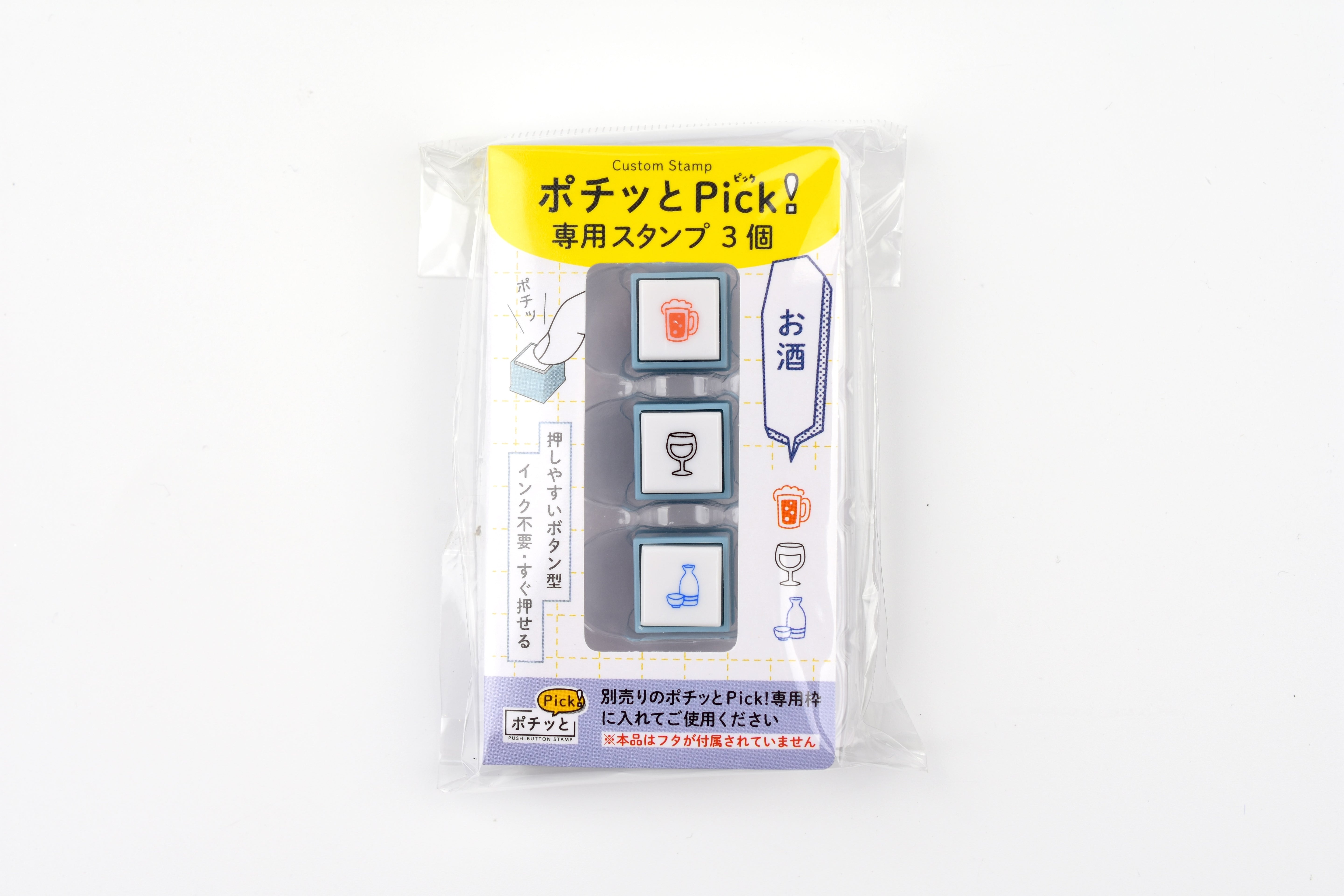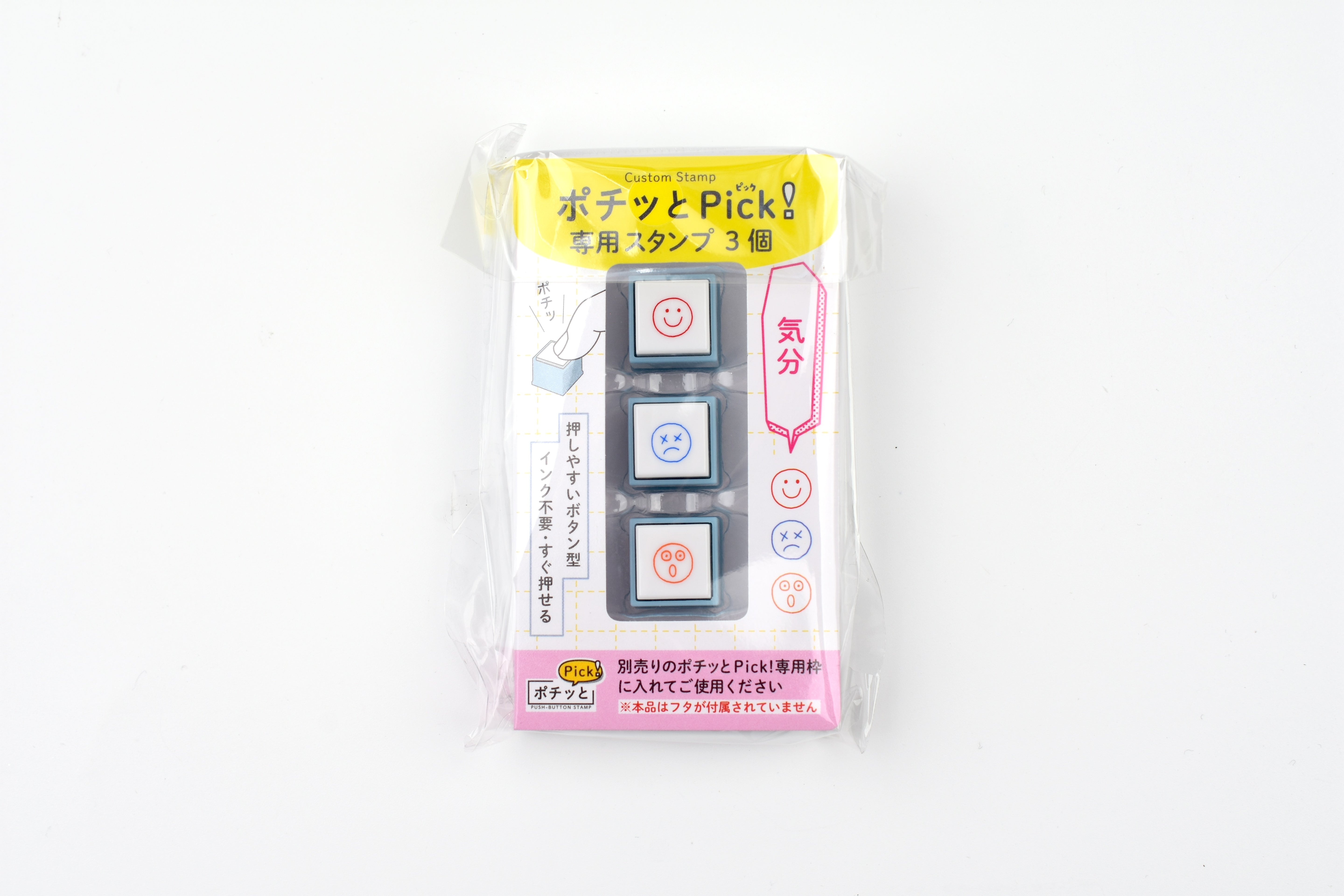 The Pochitto Pick! Push-button stamp now comes in a new format: a 3-pack of exclusive stamps and a separate exclusive frame (with case) that holds up to six stamps. These self-inking stamps can be pressed like a button to apply designs easily and cleanly to paper.