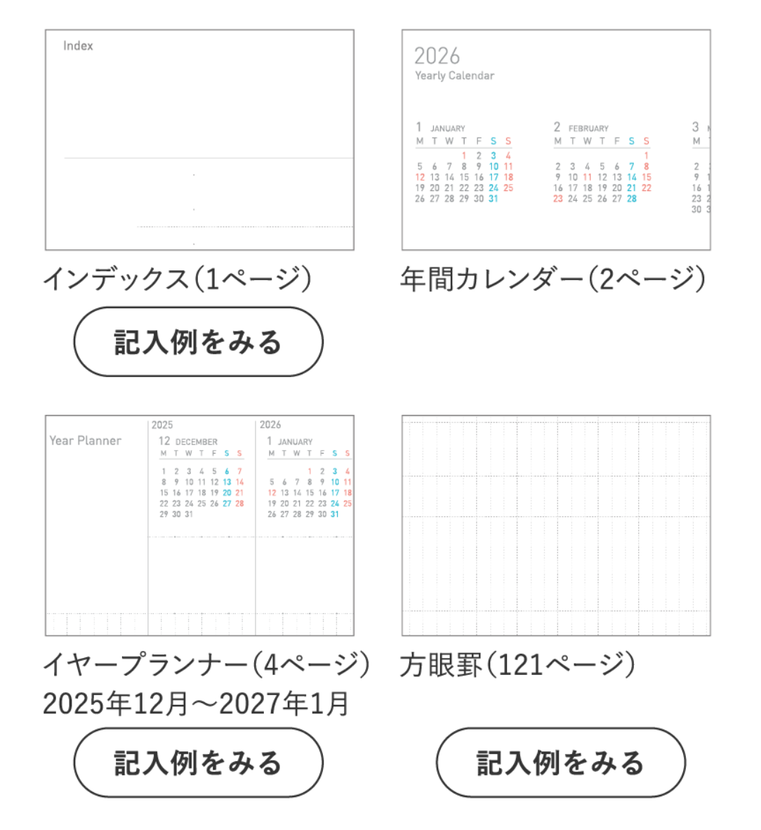 The note pages feature a high degree of freedom with grid lines, allowing for a writing experience similar to a regular notebook and making it easy to draw simple diagrams or illustrations. This diary includes a Year Planner page that allows for an overview of 7 months (approximately half a year) at a glance. This enables rough Gantt charts and future log-like usage, making it easier to grasp the flow and long-term planning of tasks.