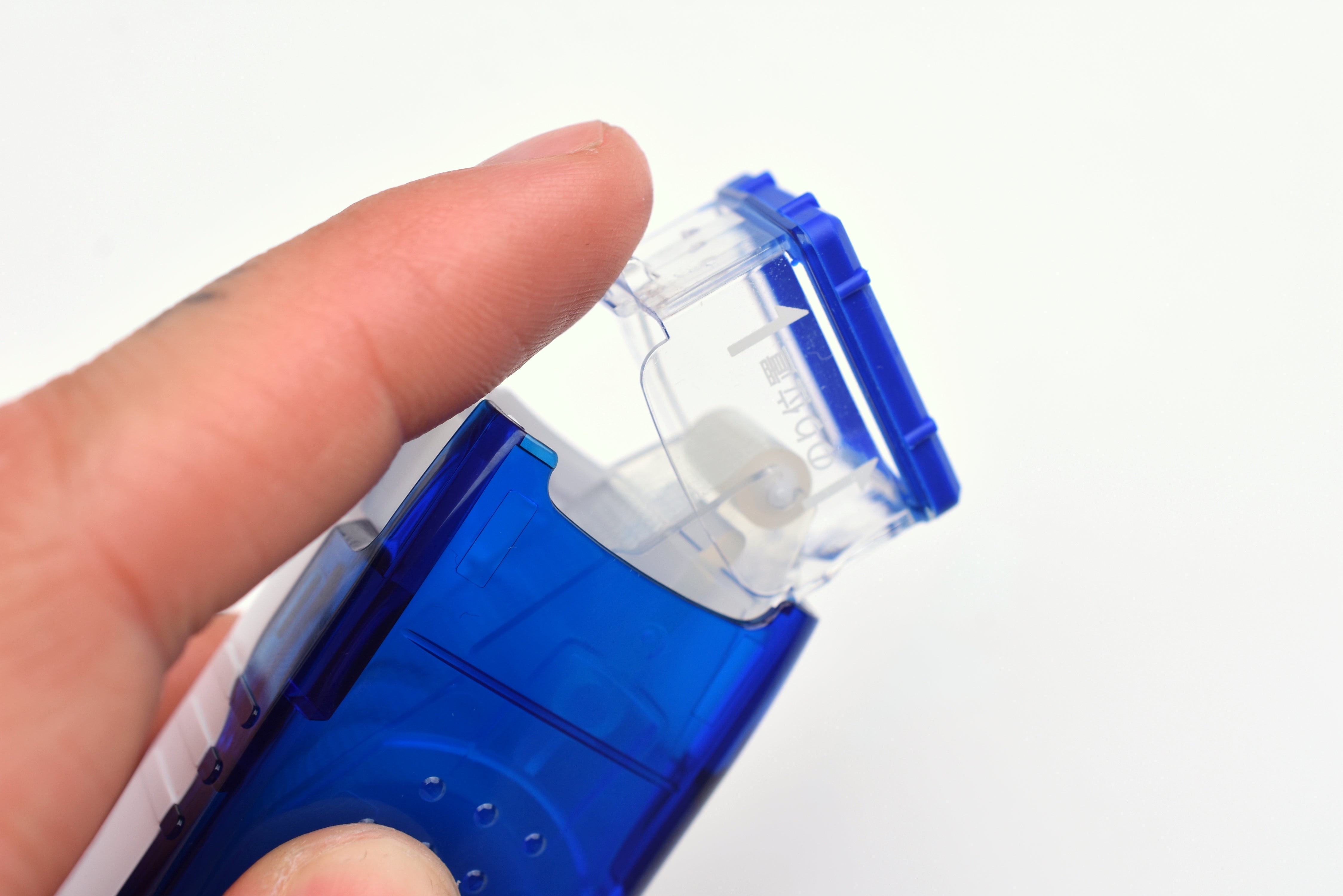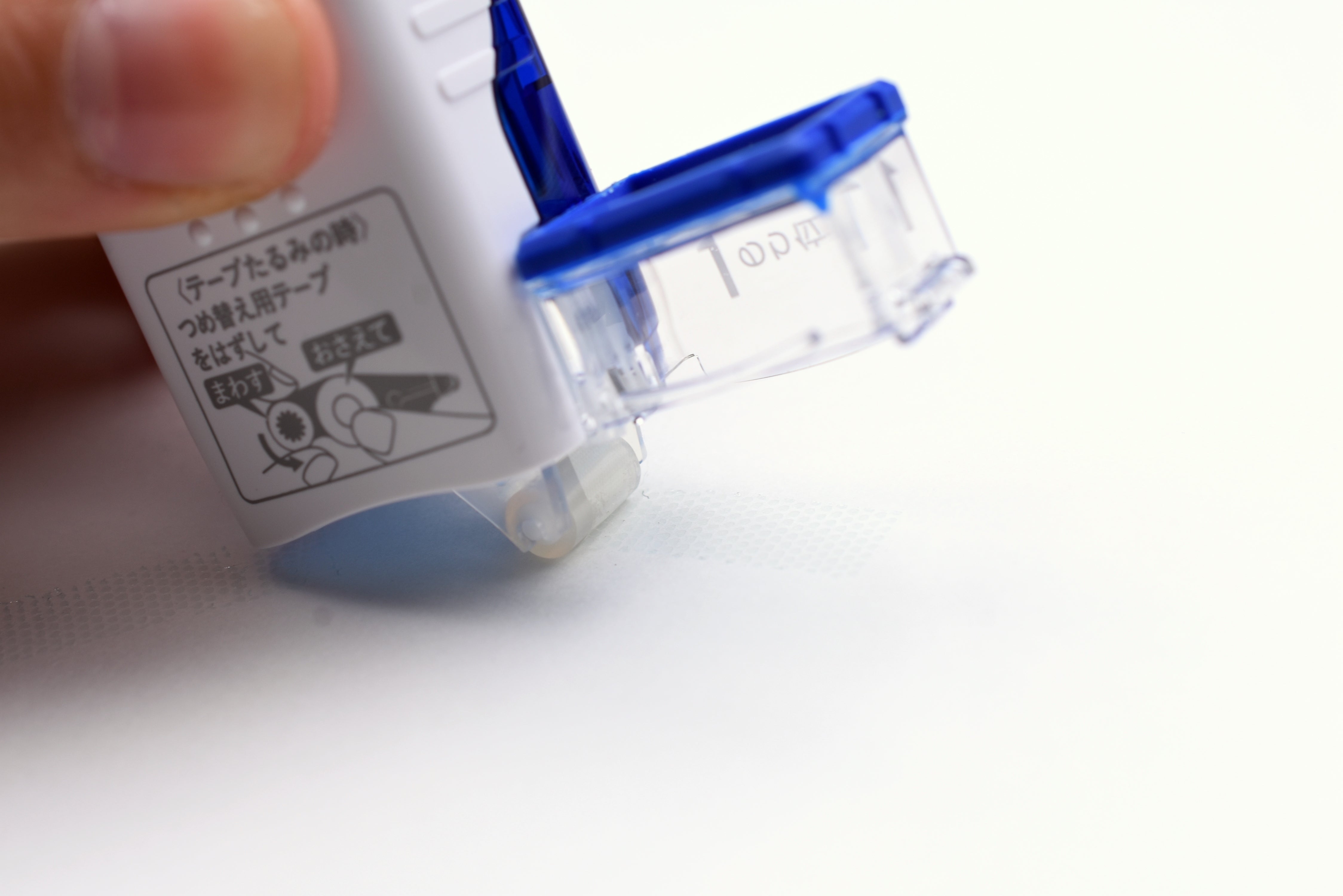Unlike other versions of the Kokuyo Dotliner that involve a rolling application method, this version functions as a stamp—when pressed down onto a sheet of paper, it leaves a square of double-sided adhesive with small, evenly spaced dots of glue. The cap part can also be flipped back so the applicator can be rolled along a page, leaving a strip of glue just like the usual Dotliners.