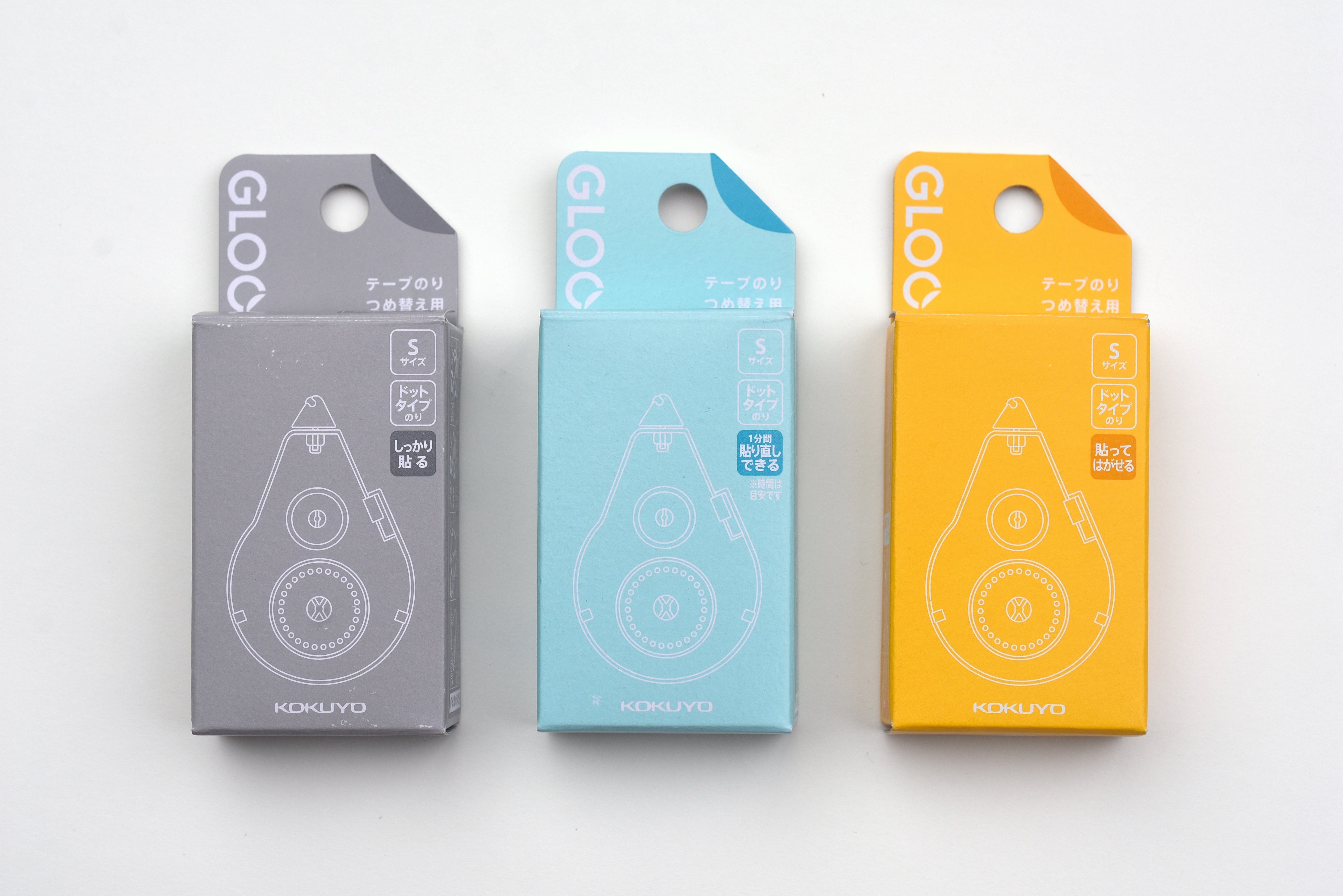 The Gloo tape roller comes in three varying levels of adhesiveness. The lightest level starts at Removable (Orange), which allows you to remove the adhered subject without damaging the paper surface. The next level is the Re-positional (Blue) version which allows you to re-position your items for about 1 minute before becoming more permanent. The Permanent (Gray) version is a strong adhesive that cannot be removed or repositioned, for neat and long-lasting adhesion.