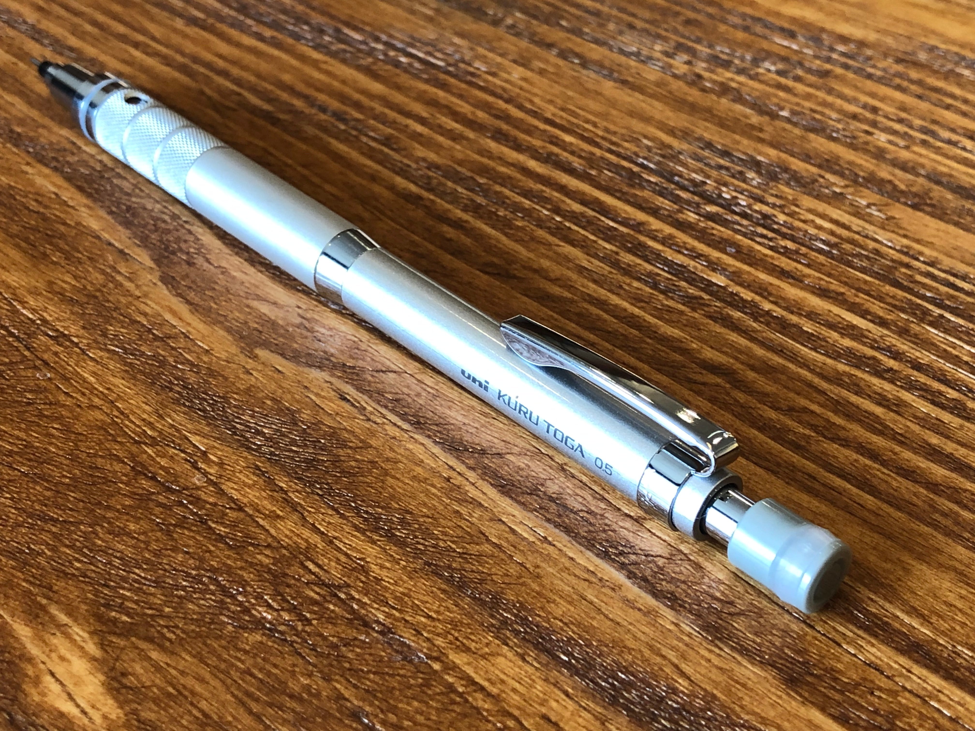 The Kuru Toga Mechanical Pencil by Uni keeps the lead in your pencil sharp and maintains a consistent lead point through the pencil's gradual rotating mechanism. As you write, each time you lift the pencil up from the paper, the lead is slightly rotated, preventing a slanted edge from forming and inconsistent thicknesses in your writing. A transparent window in the grip section of the pencil allows you to track the Kuru Toga logo, a circular loop, and see it moving around the circumference of the pencil as you write--we love watching the loop make its way around and come back!