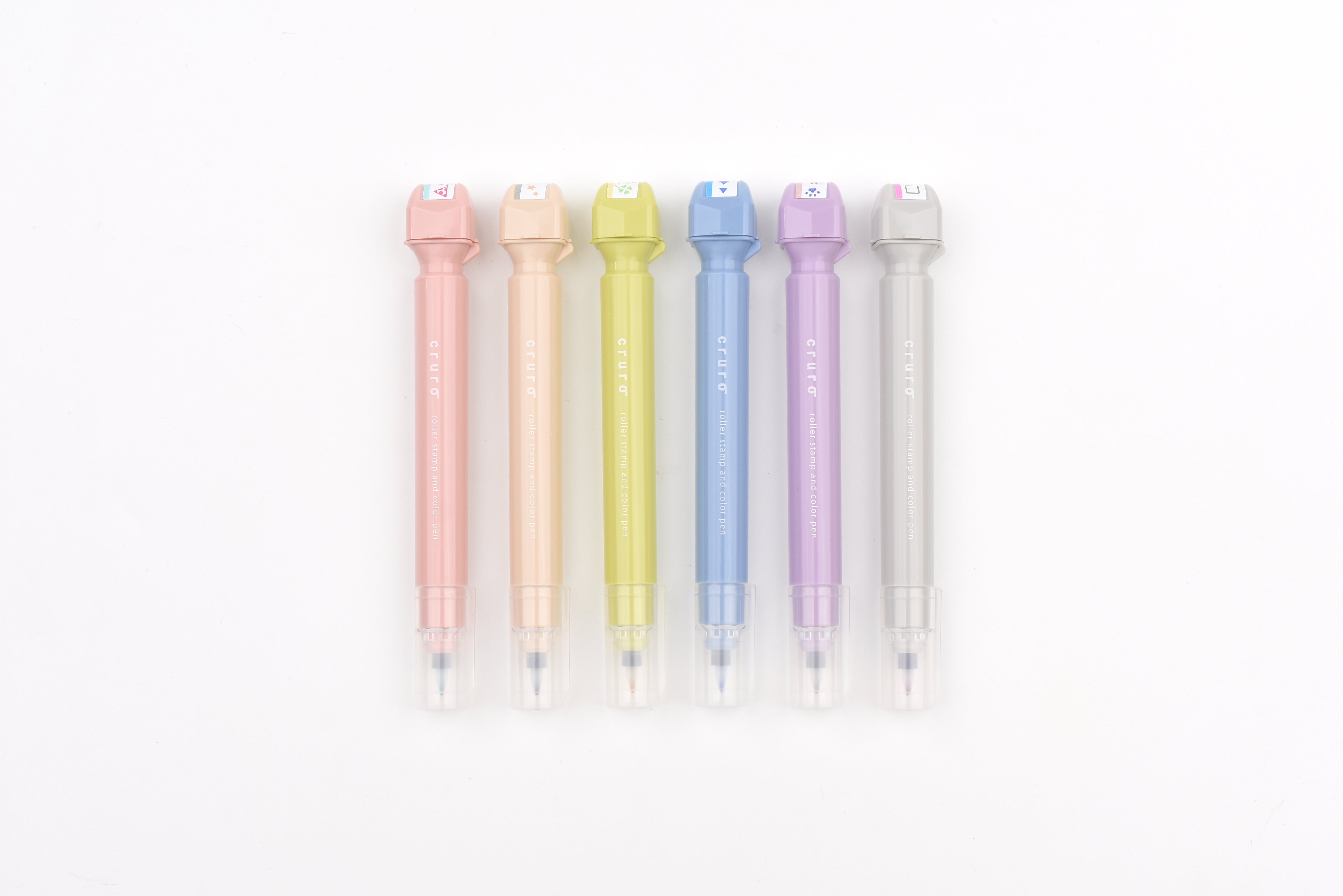 A fun and handy tool that combines a roller ink stamp and a colored pen in one slim body. It’s perfect for decorating planners, journals, and memos with continuous stamped patterns and colorful accents. Its compact design fits easily in any pen case, making it great for everyday use. Each pen has a different color stamp design and pen tip that Kutsuwa has chosen to complement each other nicely on the page.