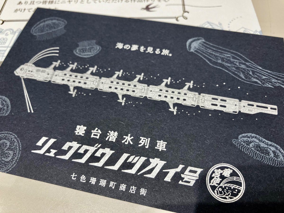 This Kyupodo letterpress postcard features a fantastical underwater train voyage aboard the Ryugu No Tsukai, a sleeper-type submersible train. It has large windows providing views of the ocean floor. The postcard is a perfect gift for anyone who loves trains, the ocean, or anything a little bit out of the ordinary!