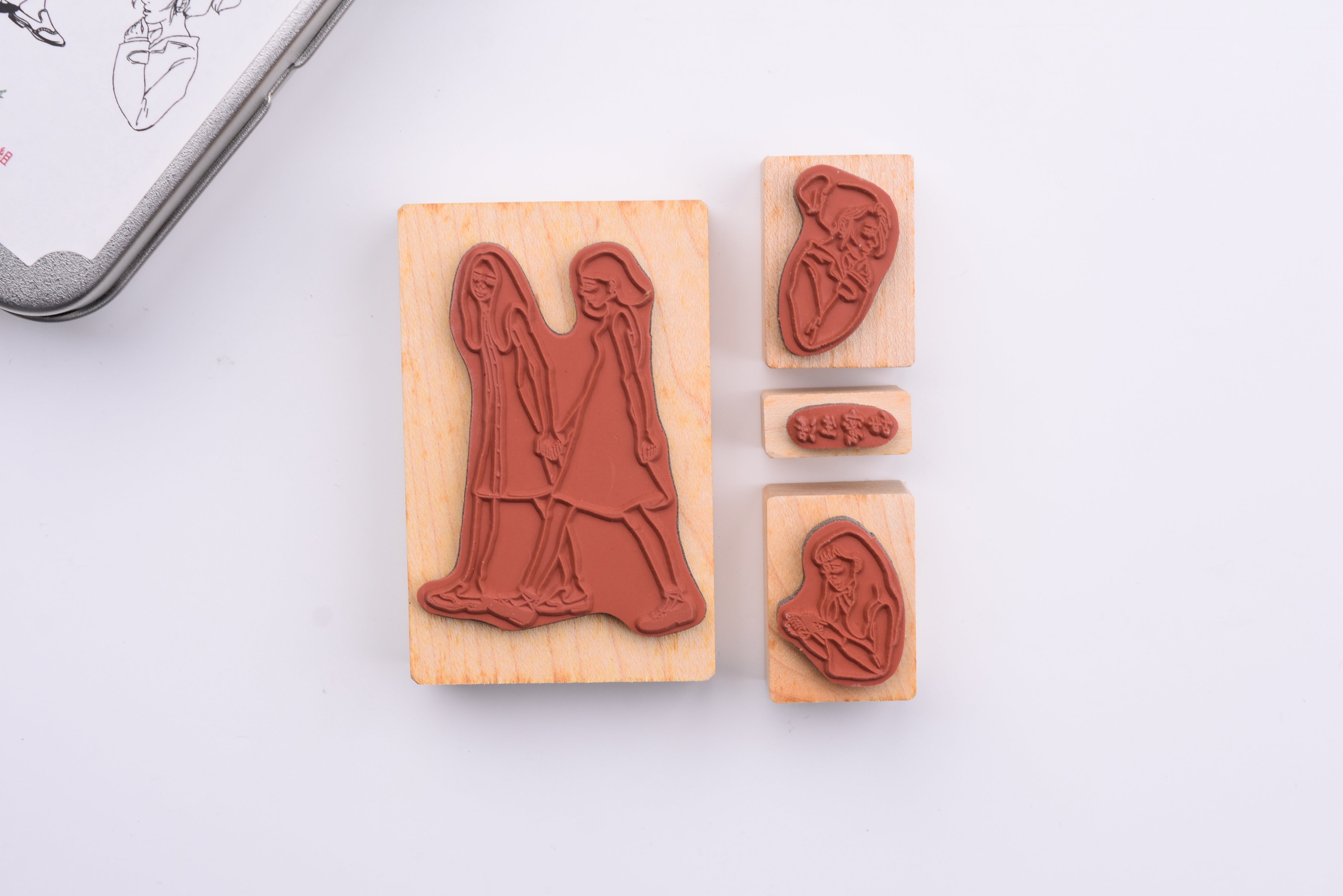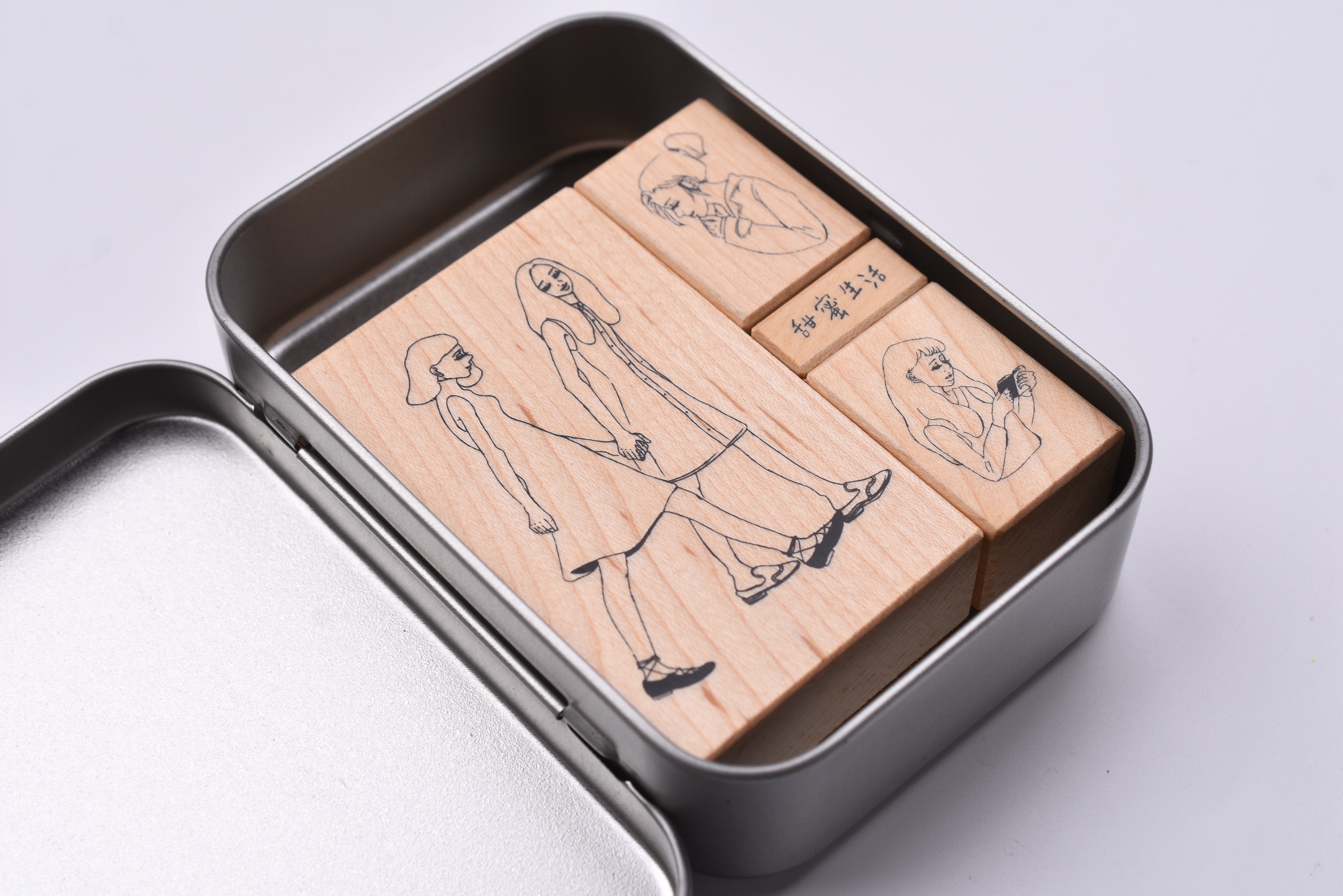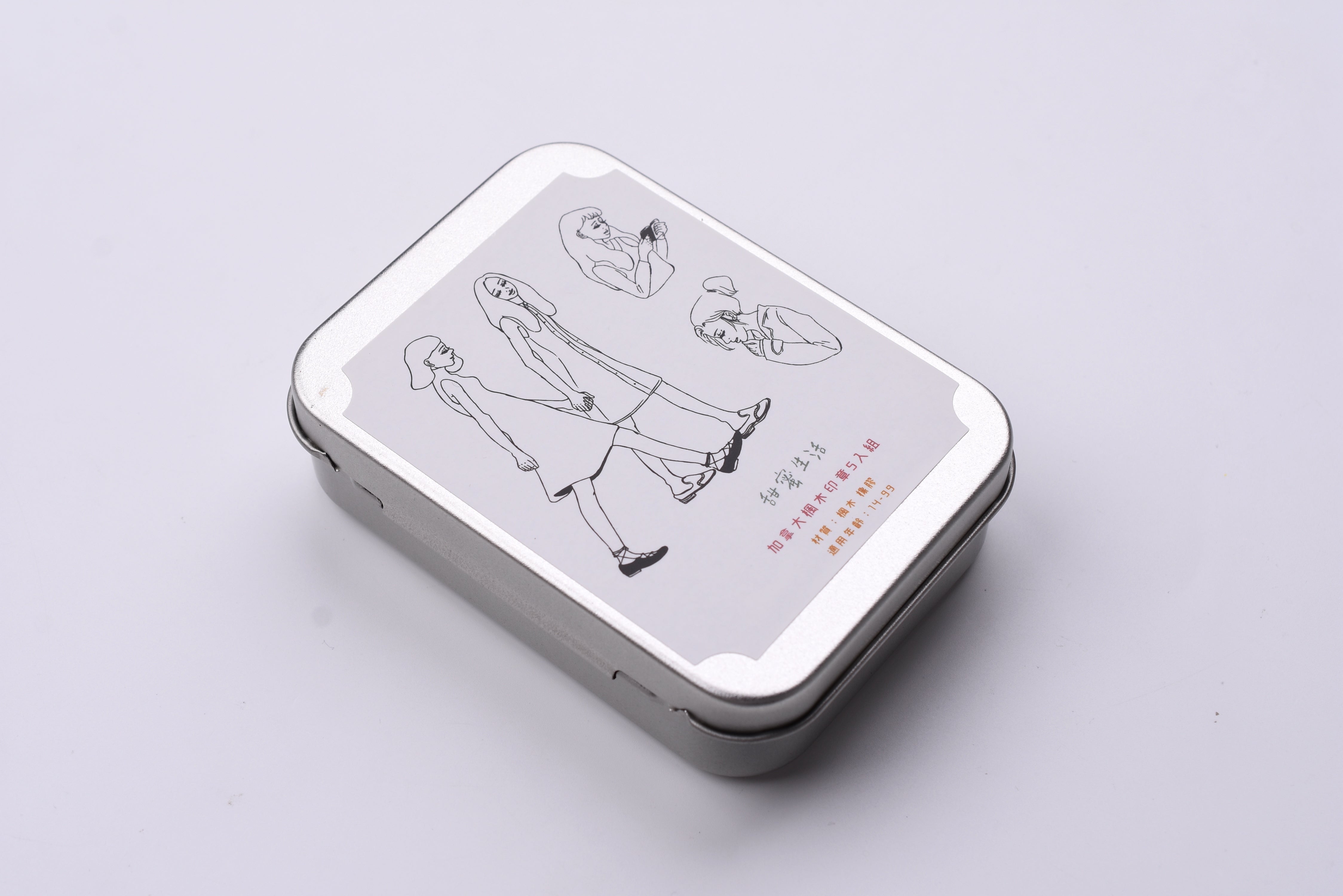 - Set of 4 rubber stamps packaged in an aluminum tin