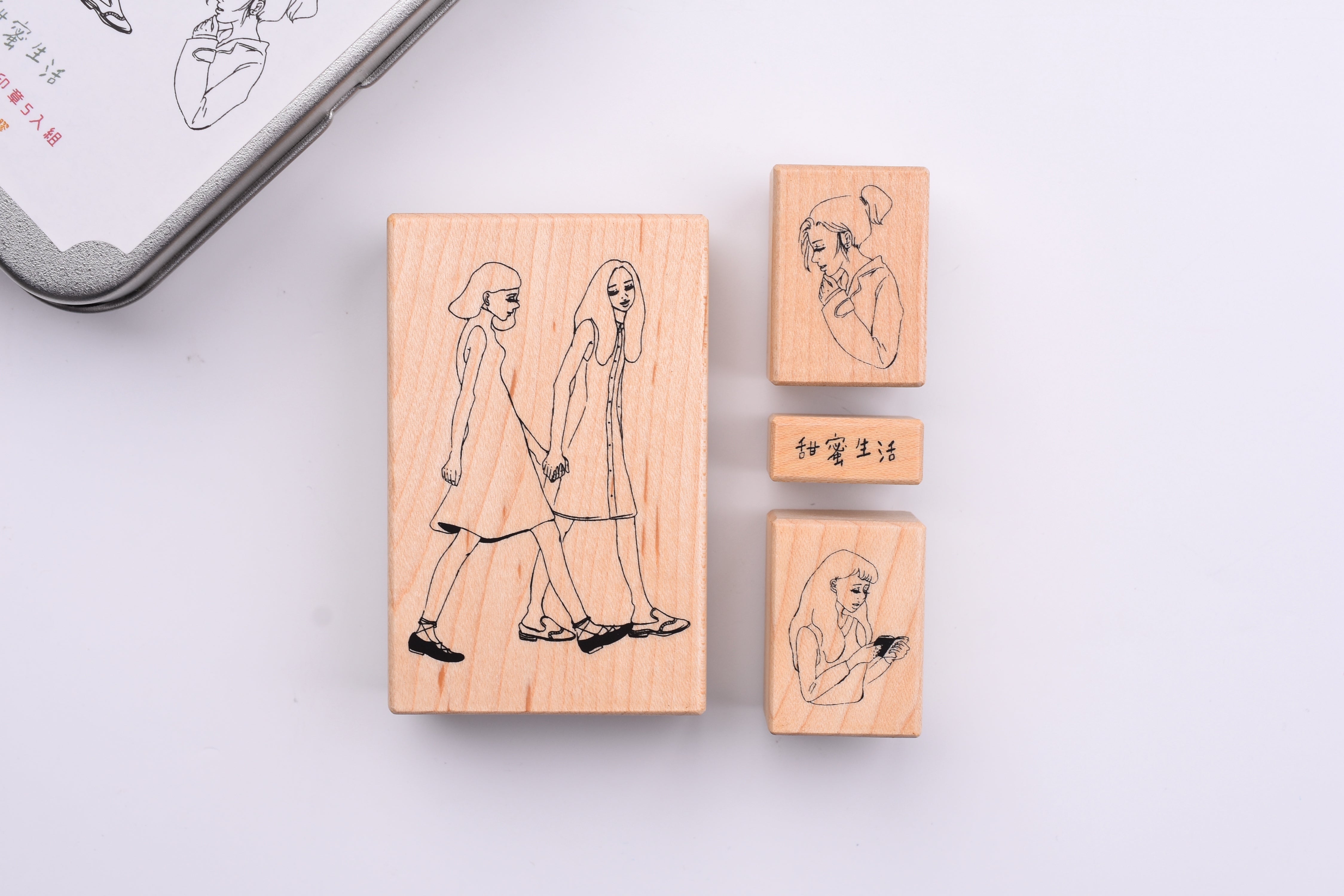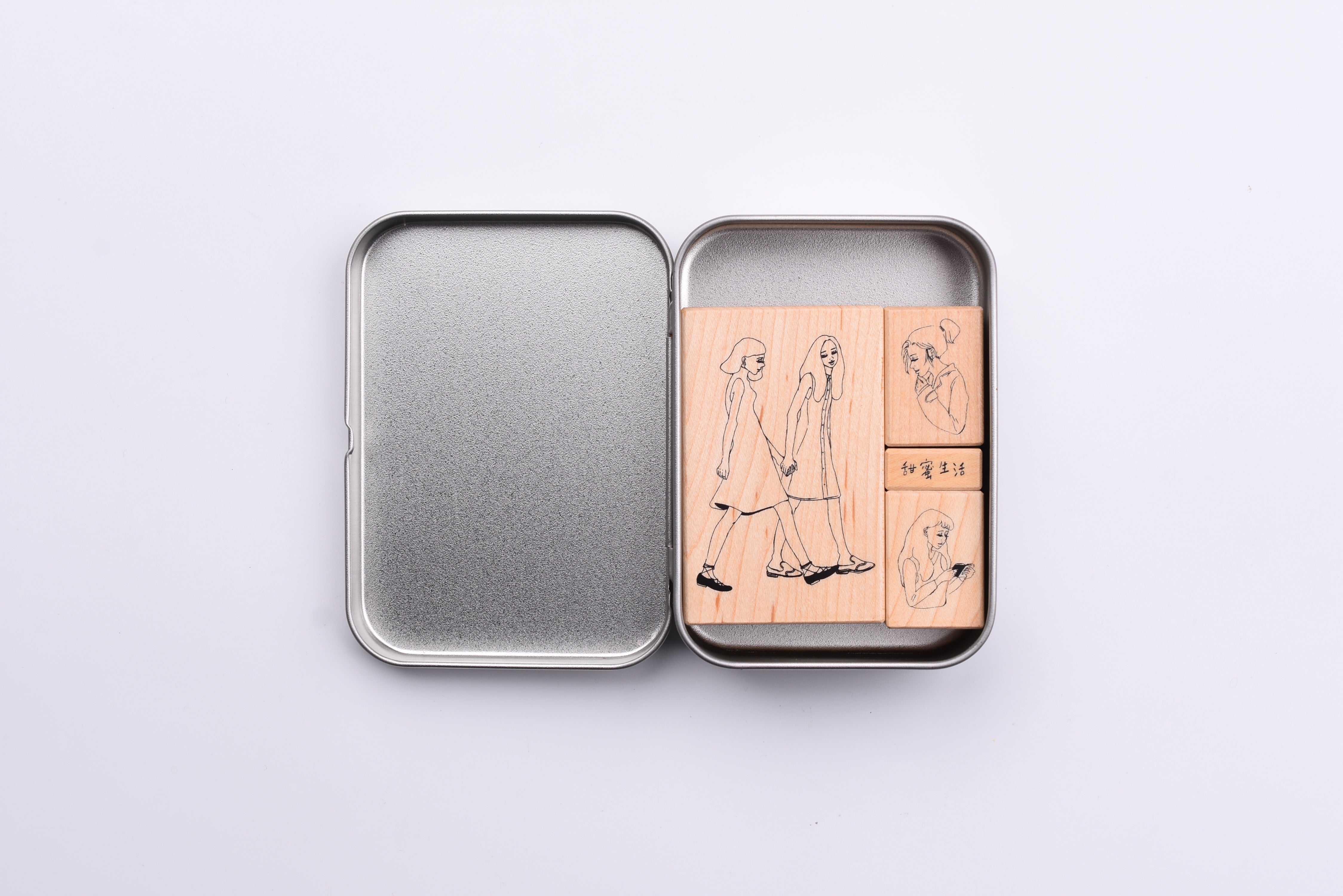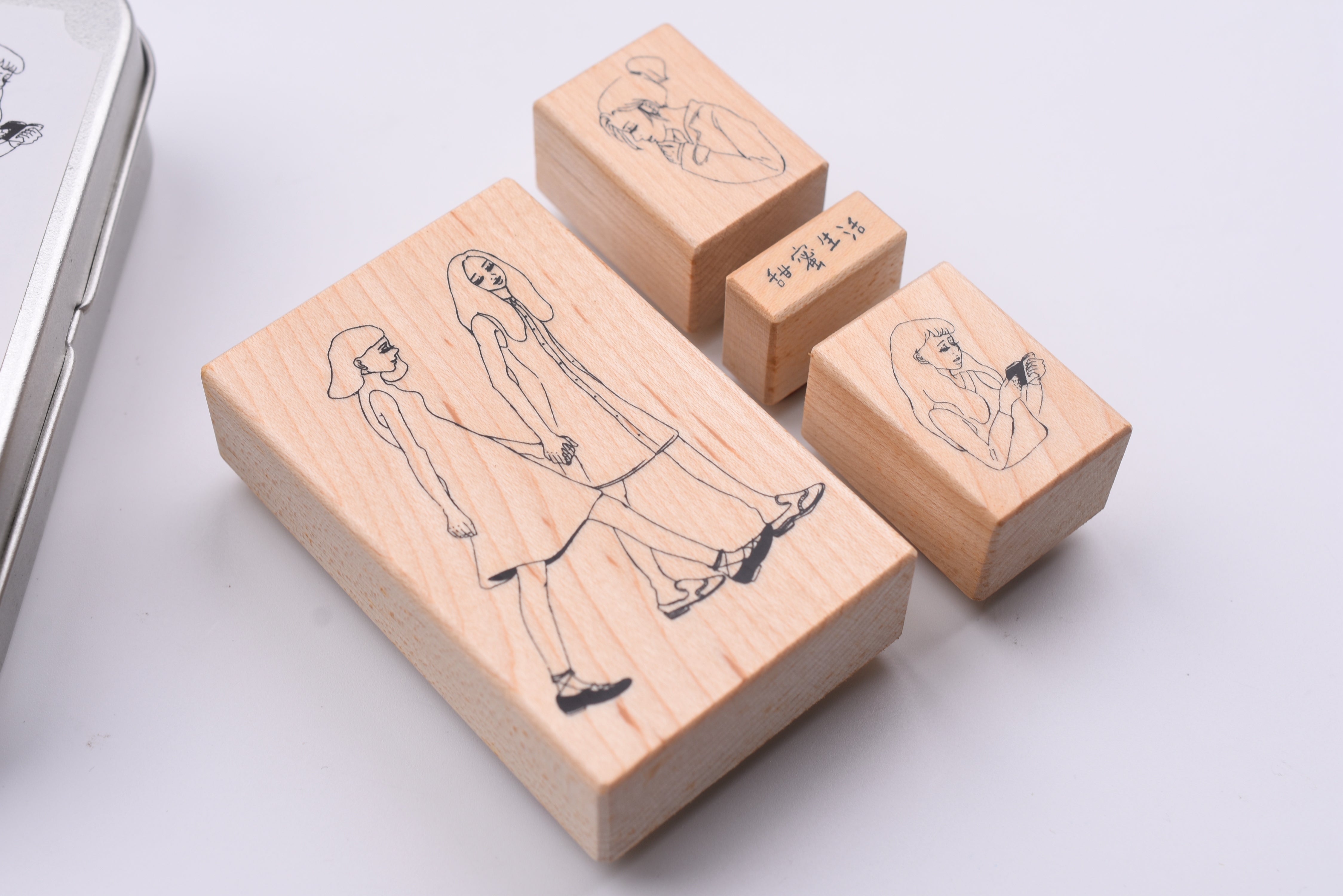 - Set of 4 rubber stamps packaged in an aluminum tin