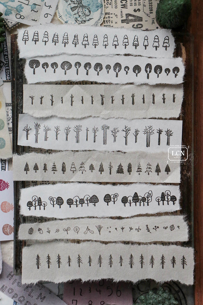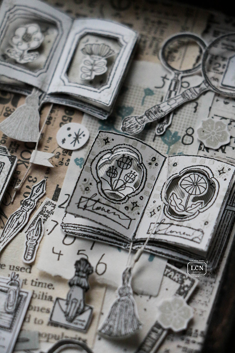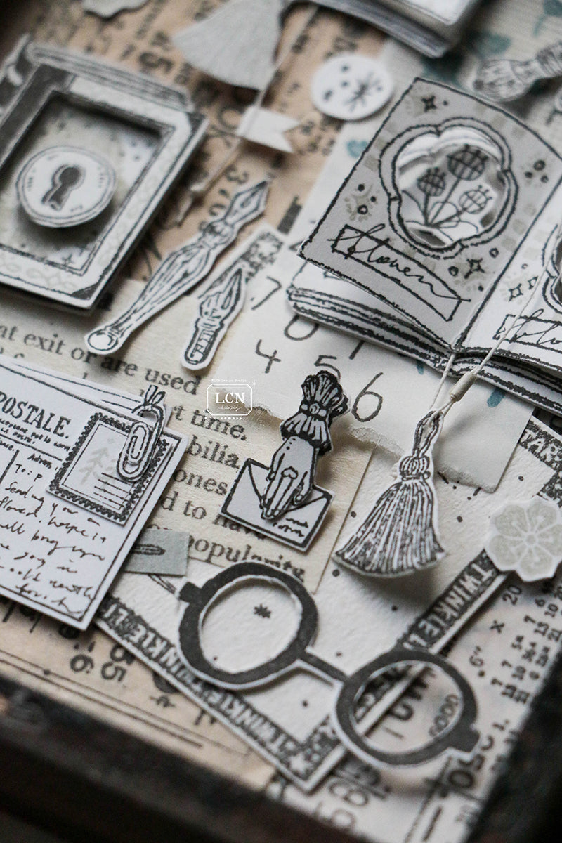 Lin Chia Ning (LCN) is a talented Taiwanese artist who loves stationery and who loves to hand craft beautiful stationery. Her stationery ranges from her early works of hand carved stamps, washi tapes, dioramas with mushrooms and gemstones, distressed papers, to the recent vintage labels and many of her iconic stamps. She draws inspirations from nature, vintage items and uses watercolor to create an unreal and magical world. On top of her busy life, she’s published a book in Taiwan too! Here are some of her recent designs. And just like her dioramas, each individual box feels like it’s frozen in time in its small magical world.