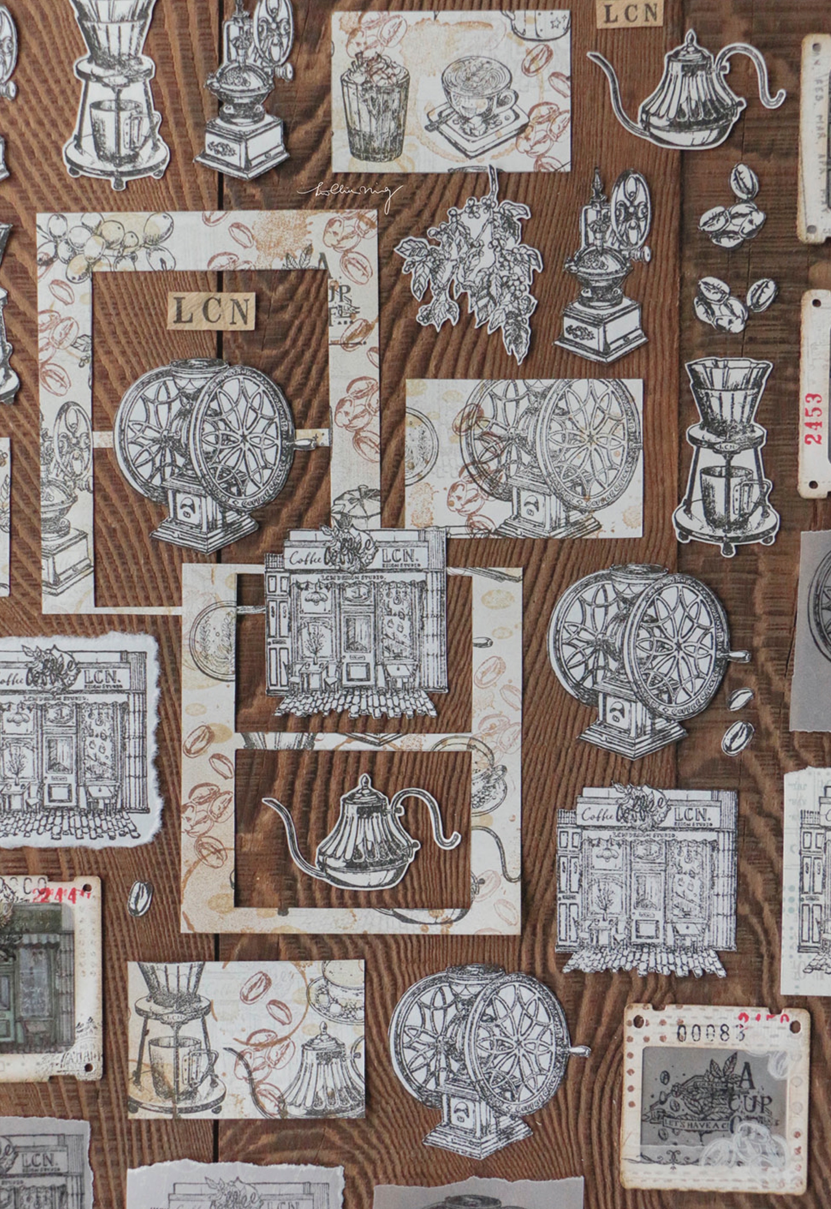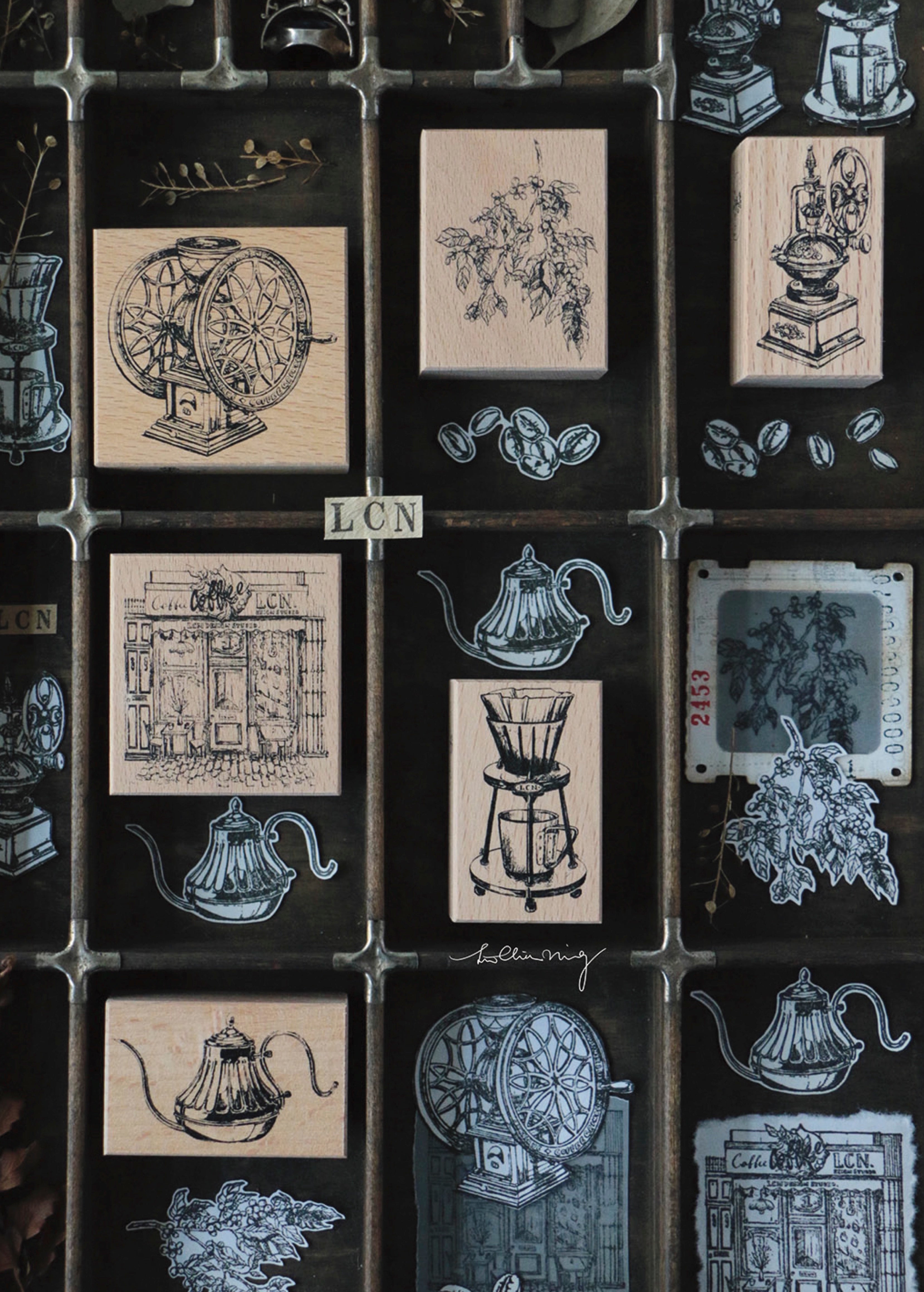 Lin Chia Ning (LCN) is a talented Taiwanese artist who loves stationery and who loves to hand craft beautiful stationery. Her stationery ranges from her early works of hand carved stamps, washi tapes, dioramas with mushrooms and gemstones, distressed papers, to the recent vintage labels and many of her iconic stamps. She draws inspirations from nature, vintage items and uses watercolor to create an unreal and magical world. On top of her busy life, she’s published a book in Taiwan too! Here are some of her recent designs. And just like her dioramas, each individual box feels like it’s frozen in time in its small magical world.