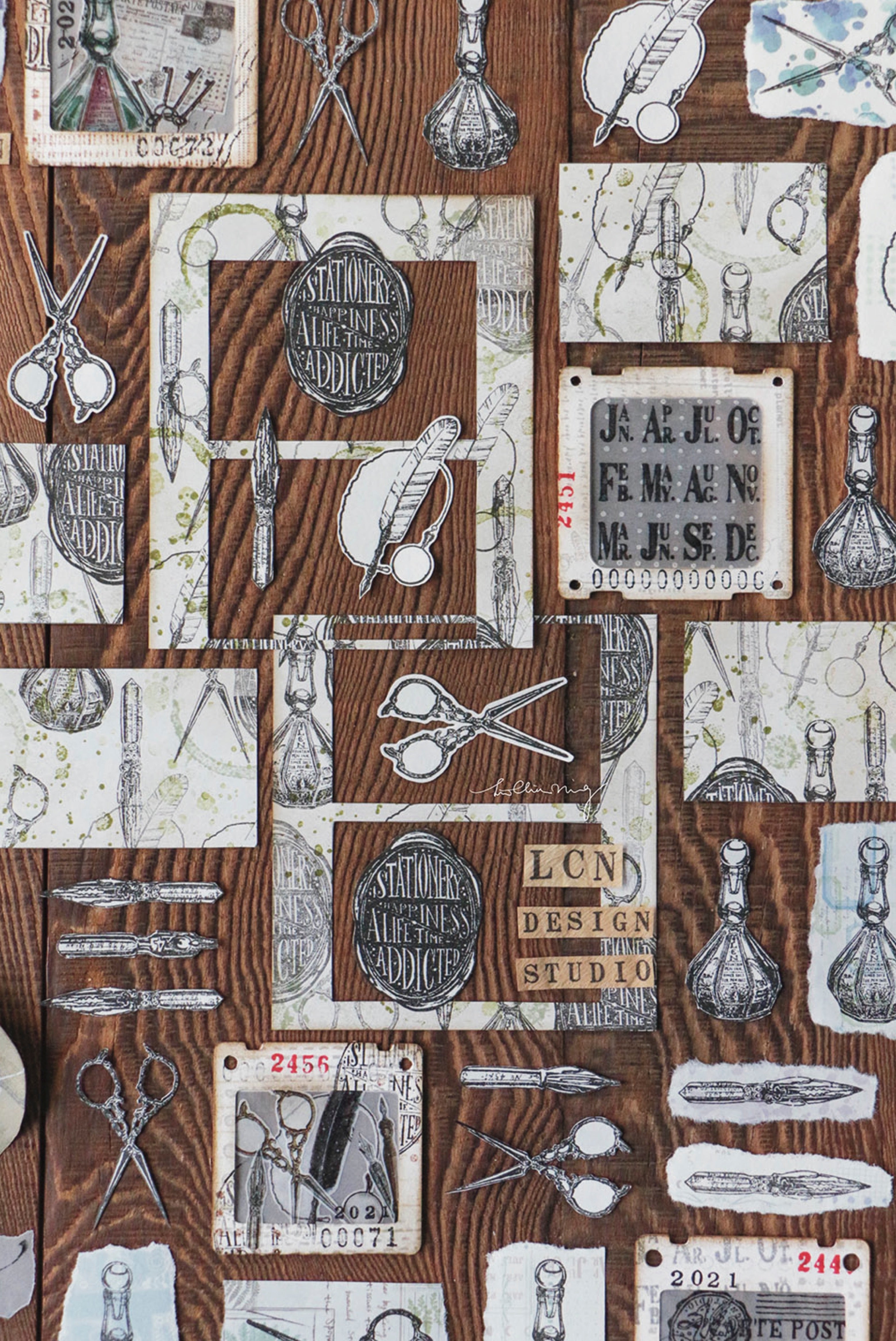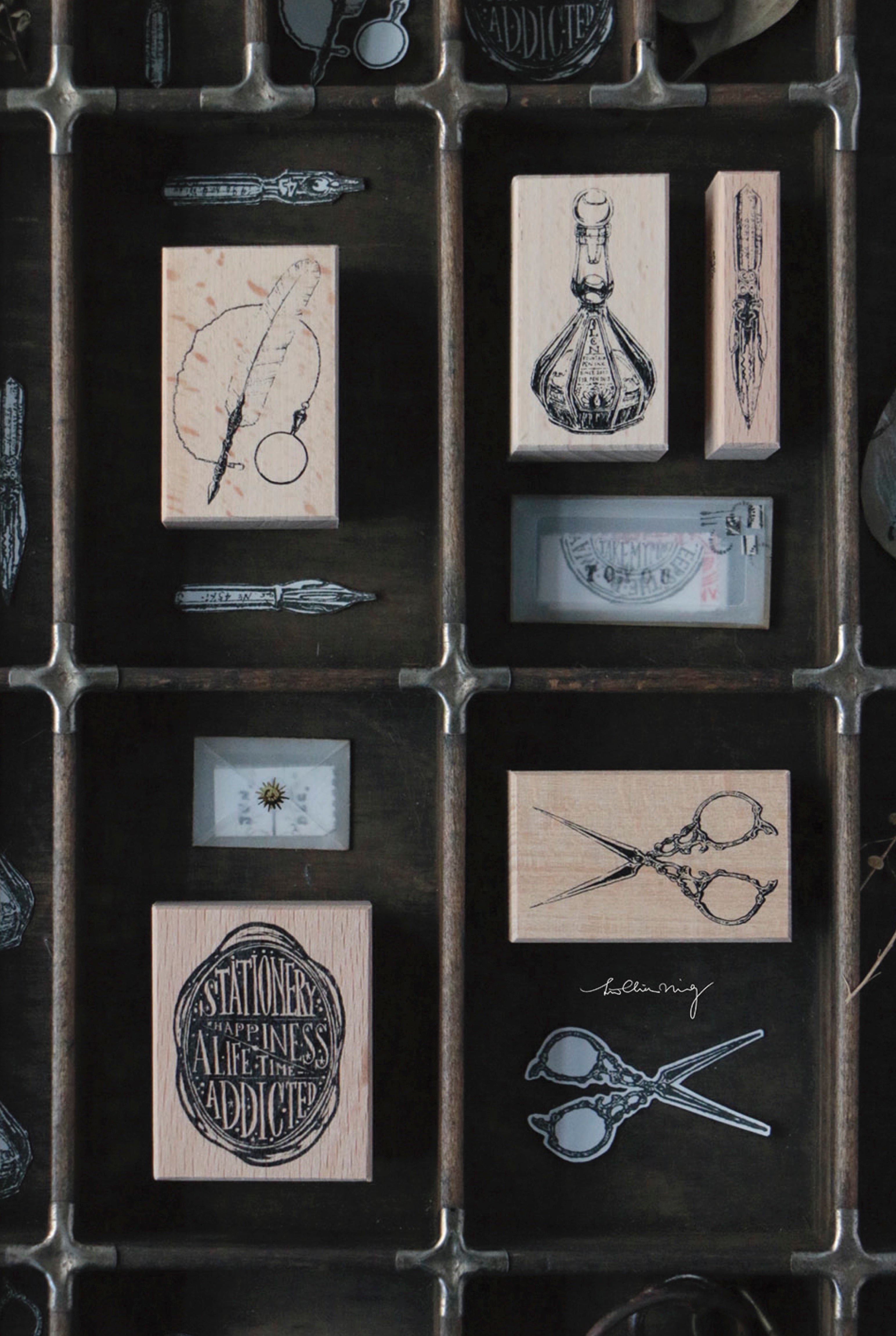 Lin Chia Ning (LCN) is a talented Taiwanese artist who loves stationery and who loves to hand craft beautiful stationery. Her stationery ranges from her early works of hand carved stamps, washi tapes, dioramas with mushrooms and gemstones, distressed papers, to the recent vintage labels and many of her iconic stamps. She draws inspirations from nature, vintage items and uses watercolor to create an unreal and magical world. On top of her busy life, she’s published a book in Taiwan too! Here are some of her recent designs. And just like her dioramas, each individual box feels like it’s frozen in time in its small magical world.