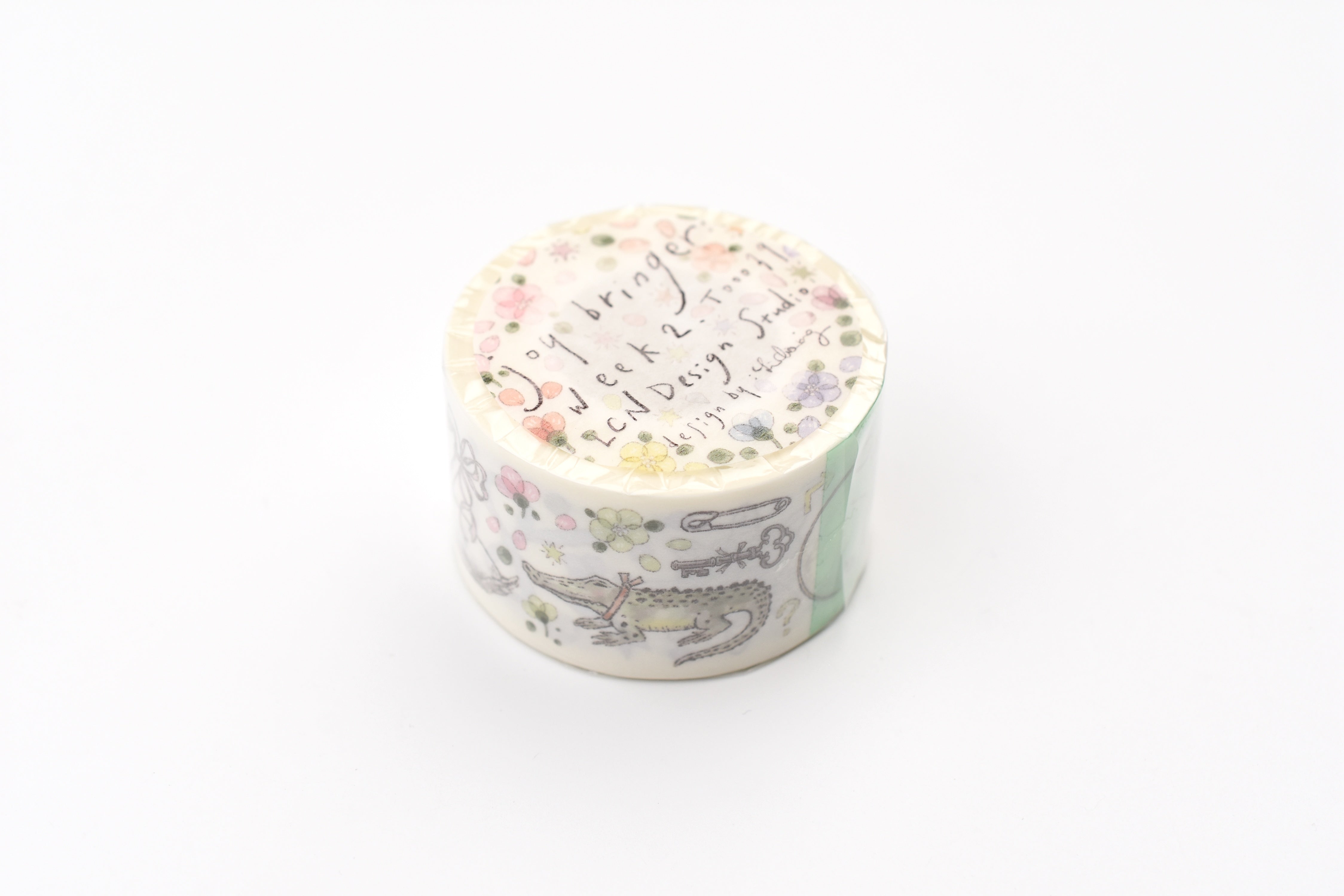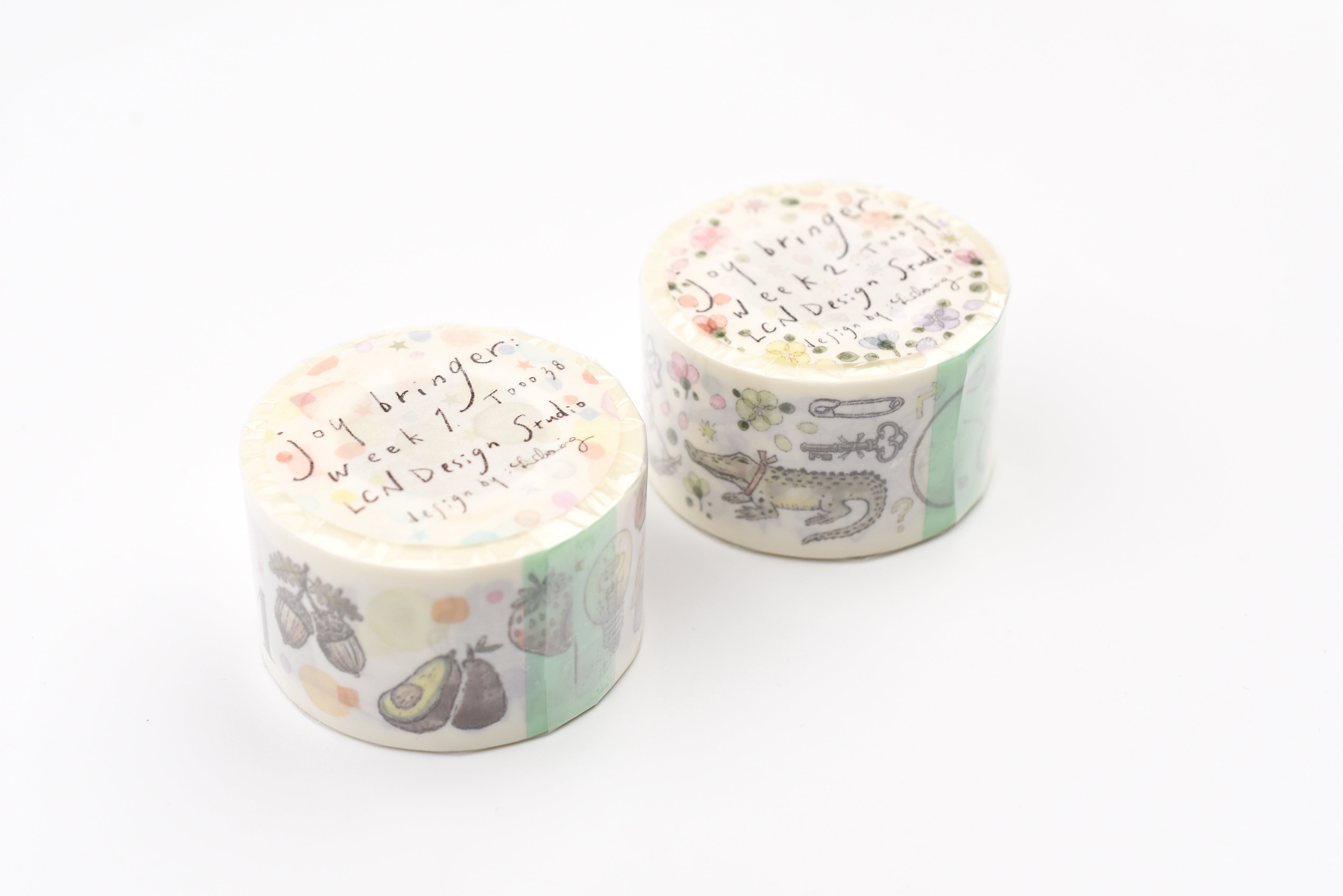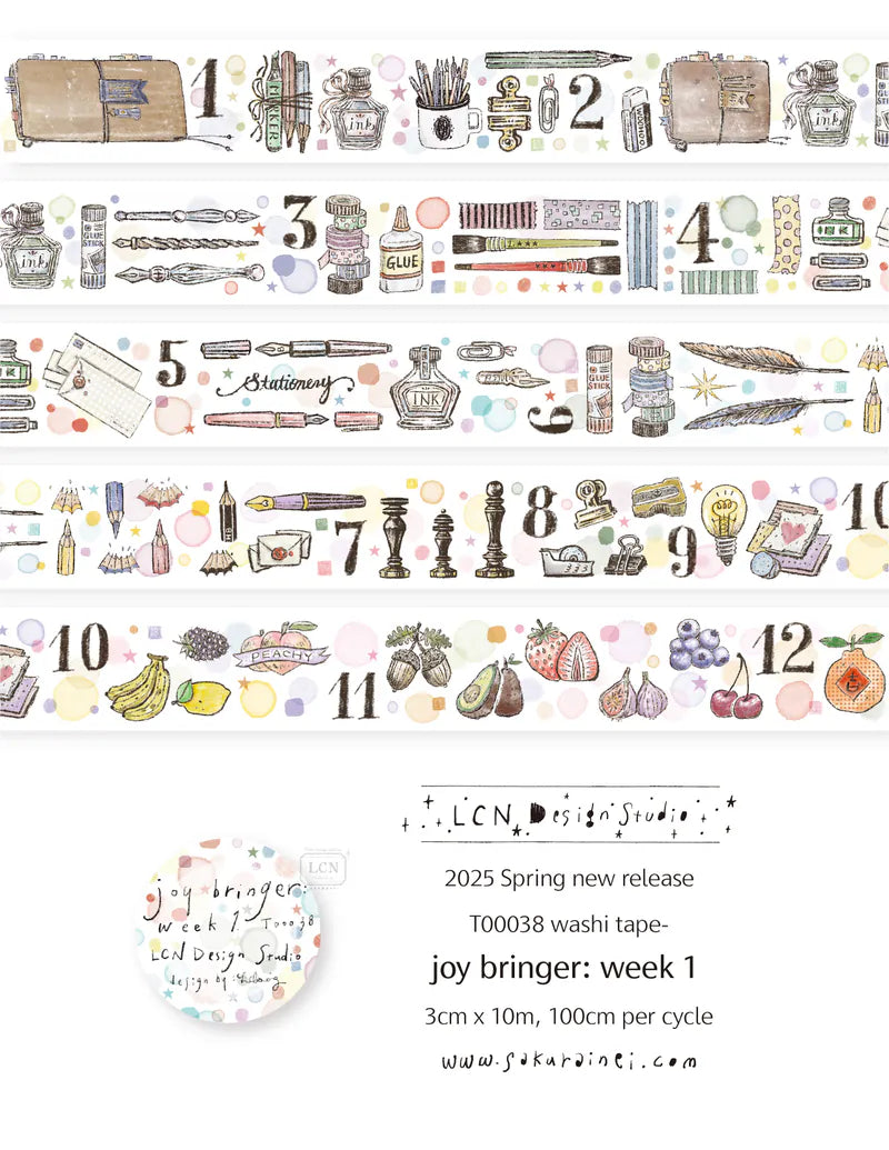 LCN Washi Tape - Joy bringer features two different designs: Week 1 and Week 2. Week 1 has intricate illustrations of beautiful every day items and journaling tools such as inks, paint brushes, clips, letters, pencils, chess pieces, breakfast, , fruits and more! Week 2 features lovely illustrations of bows, birds, embroidery hoops, magnify glasses, scissors, flowers and more! These washi tapes are perfect for layering, journaling, and adding a timeless touch to any project.