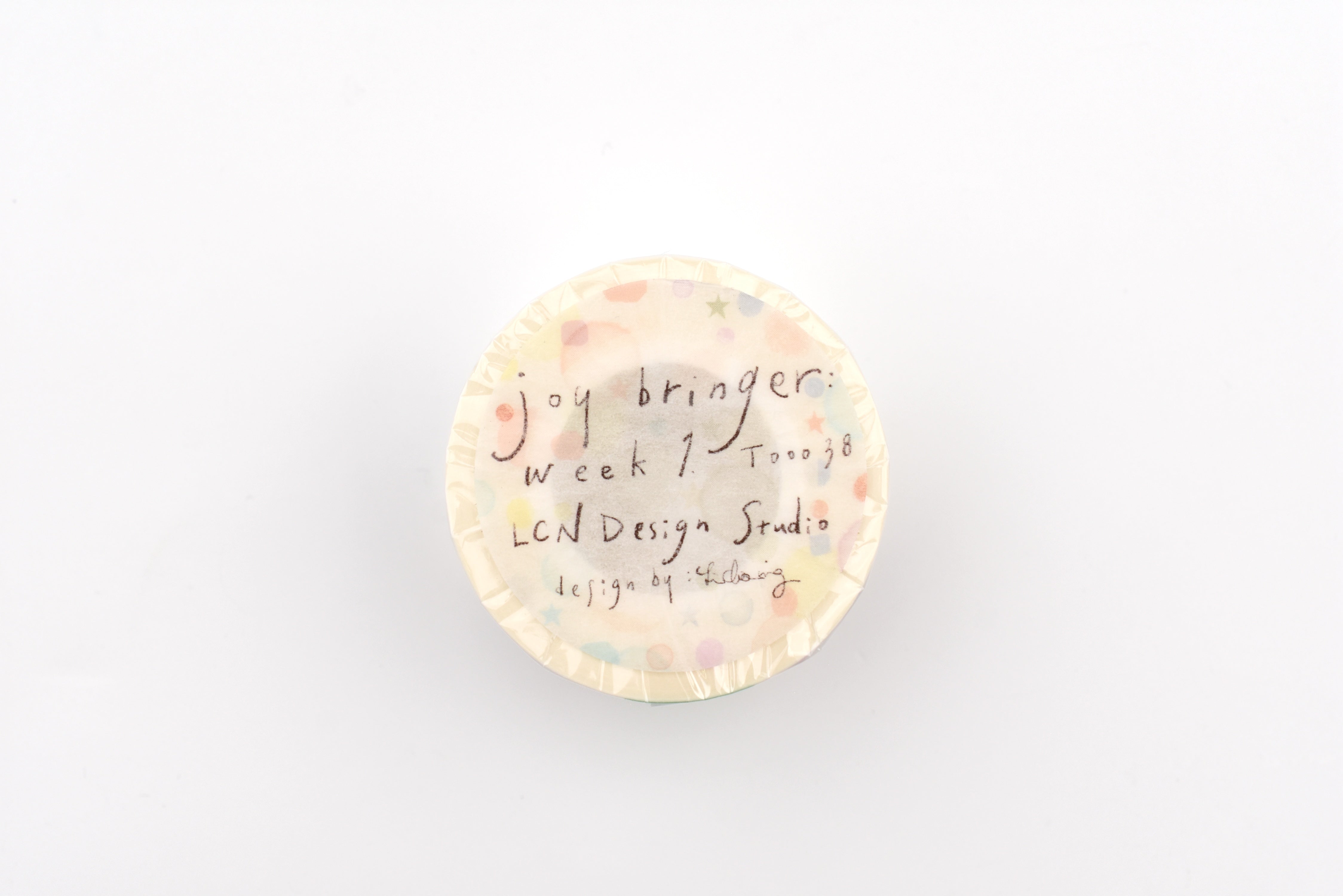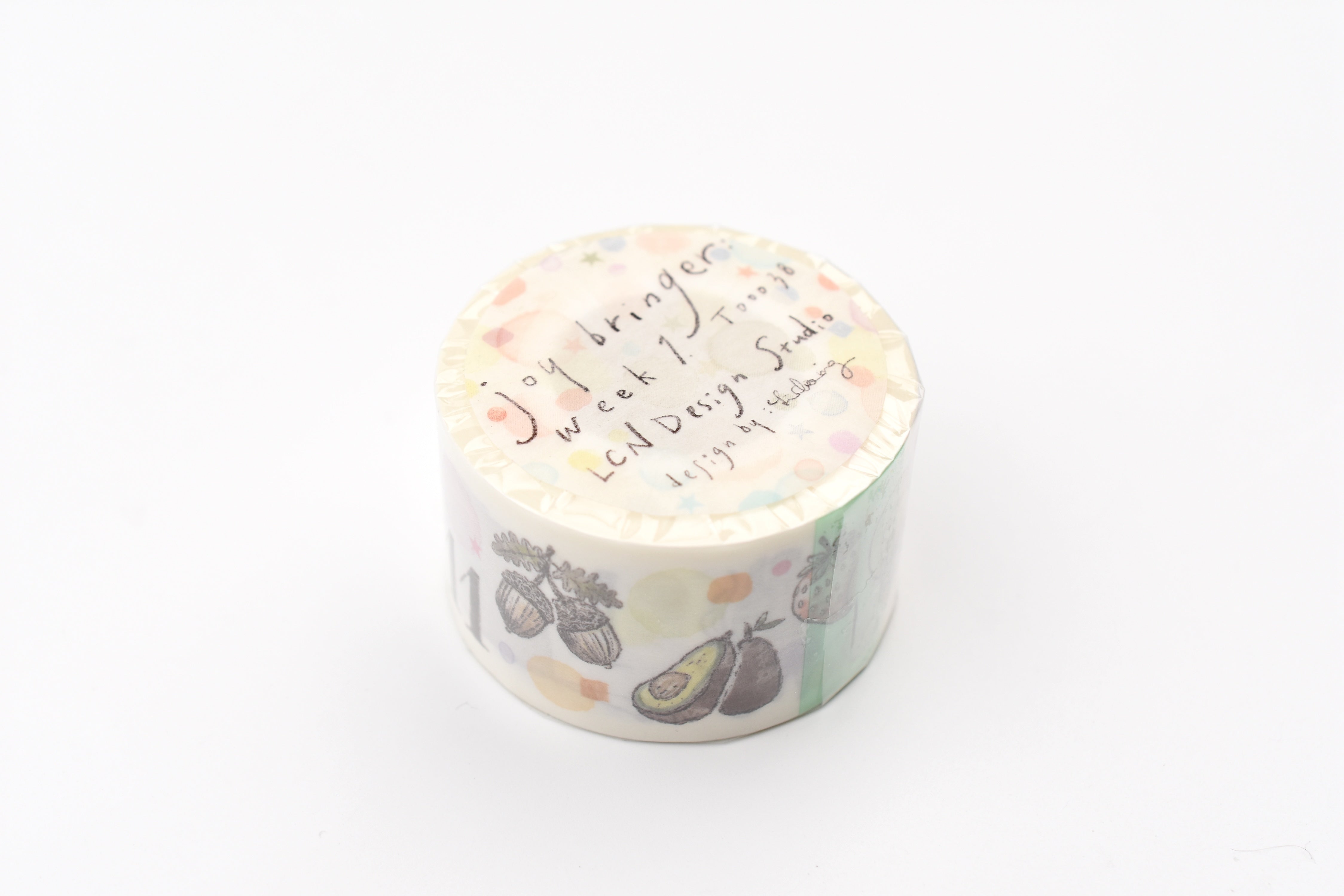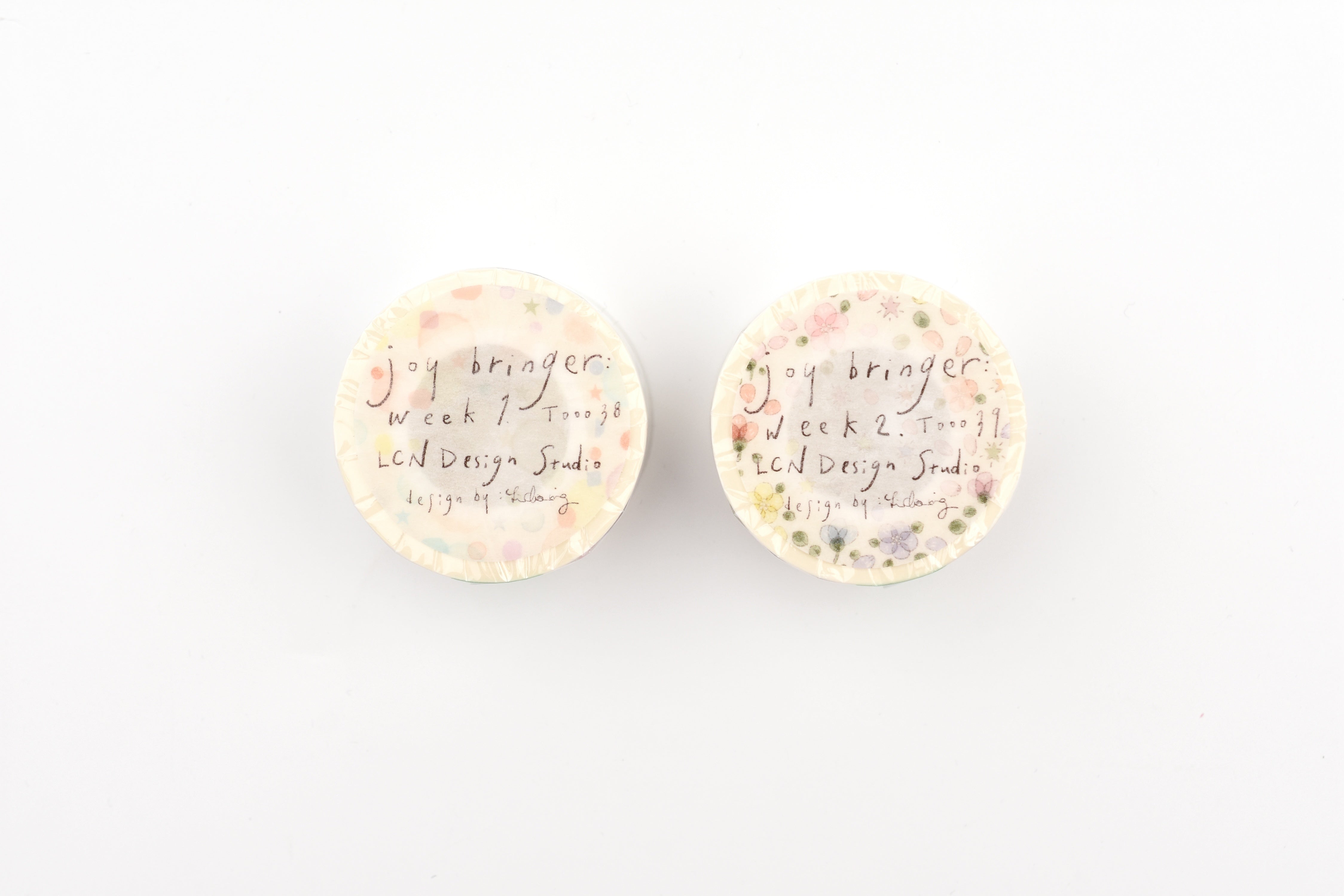 LCN Washi Tape - Joy bringer features two different designs: Week 1 and Week 2. Week 1 has intricate illustrations of beautiful every day items and journaling tools such as inks, paint brushes, clips, letters, pencils, chess pieces, breakfast, , fruits and more! Week 2 features lovely illustrations of bows, birds, embroidery hoops, magnify glasses, scissors, flowers and more! These washi tapes are perfect for layering, journaling, and adding a timeless touch to any project.