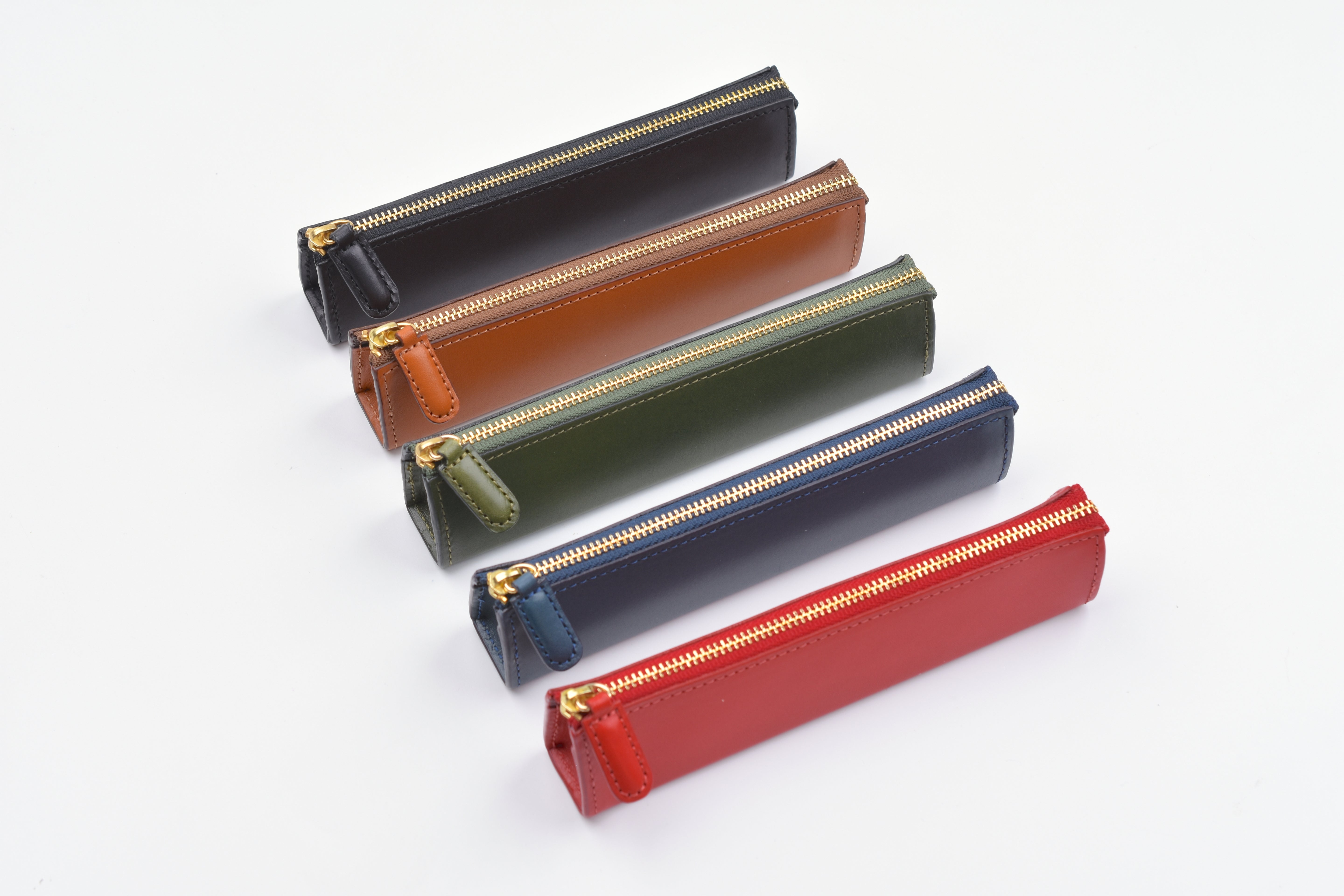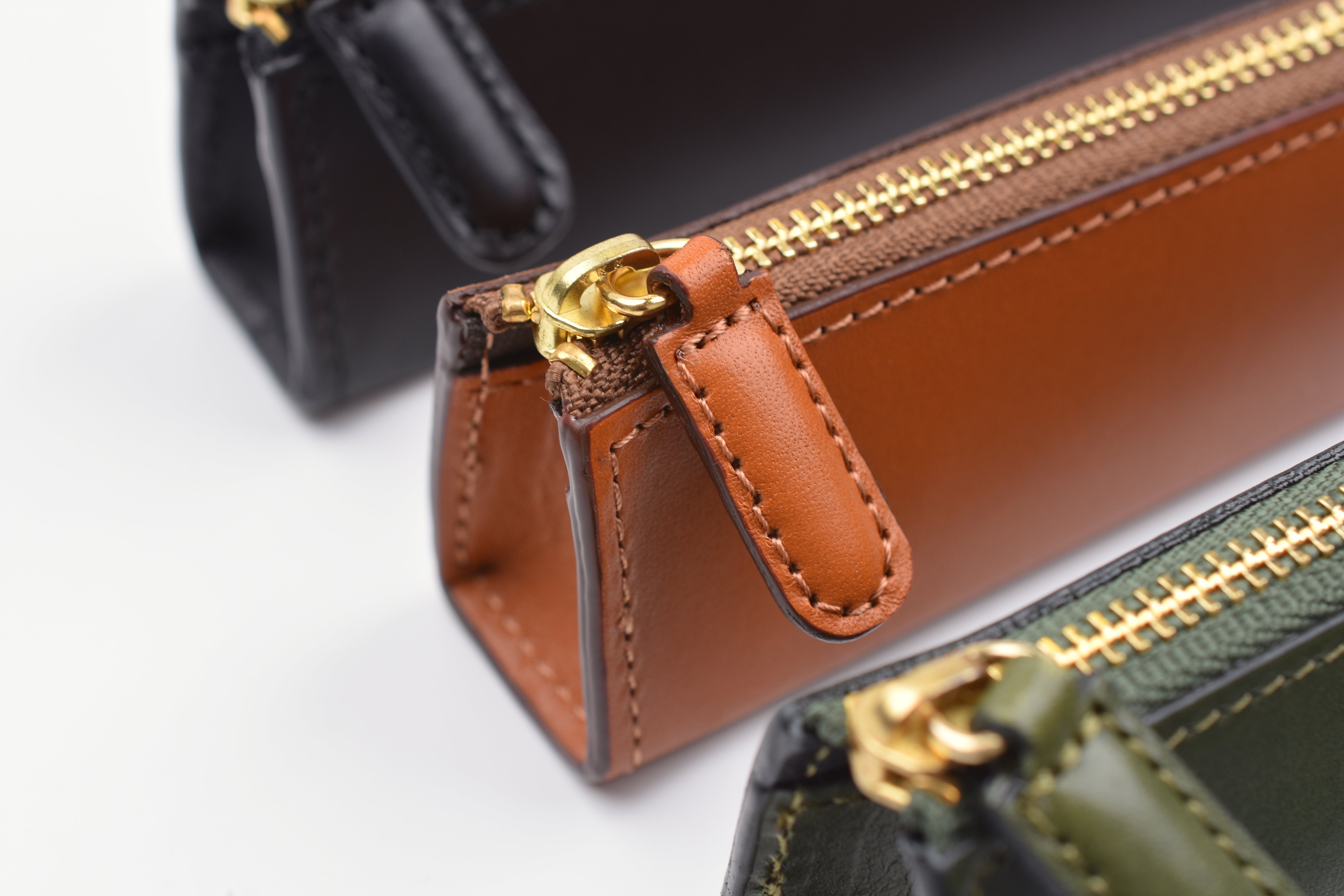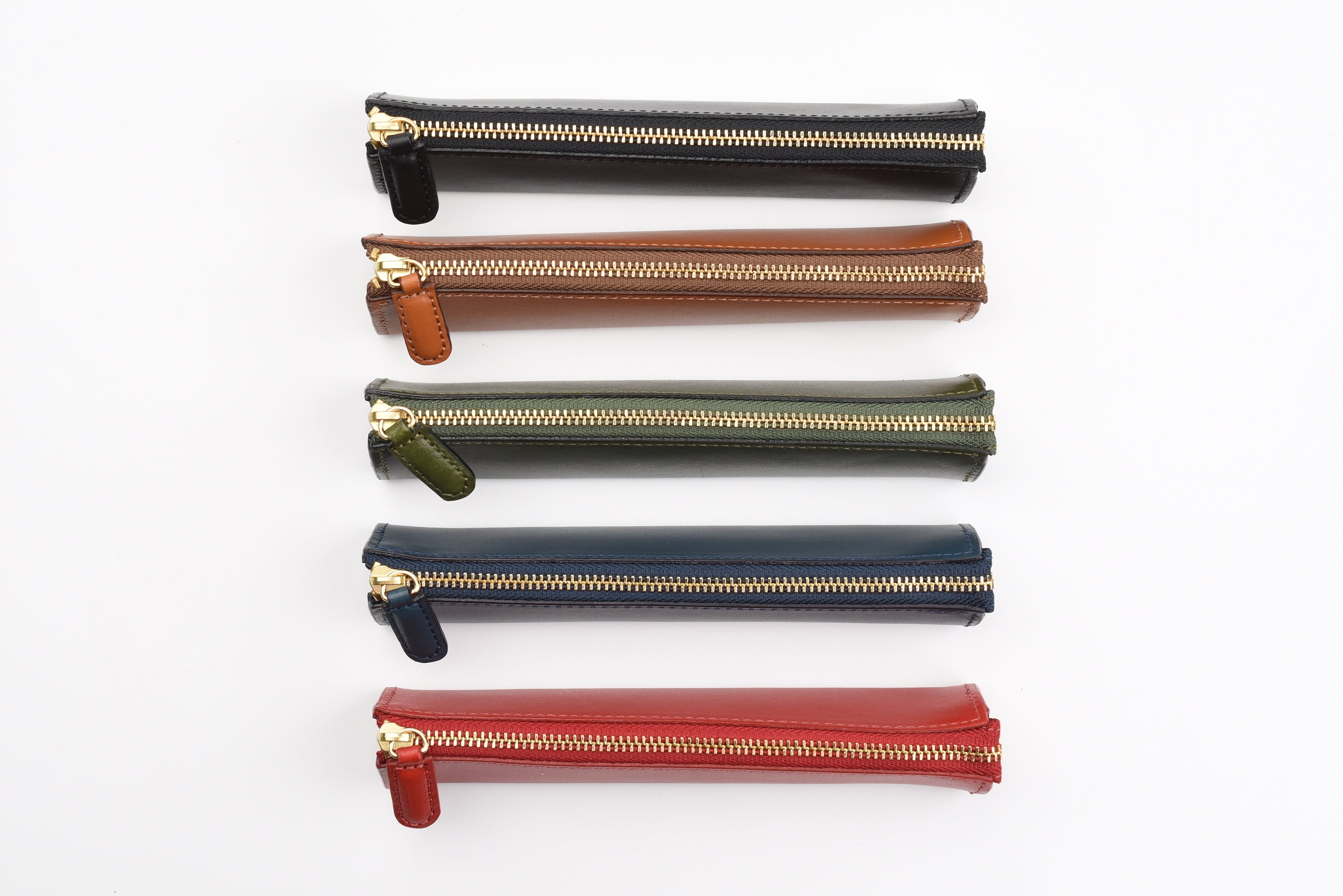 This pen pouch is made of a beautiful stiff and fragrant leather, which allows it to hold its compact and elegant triangular shape whether it is holding just one pen or packed to its capacity. The zipper glides across the top as you zip to open and close the pouch. It is a straightforward pouch with simple but classic details and can fit approximately 4-6 writing utensils.