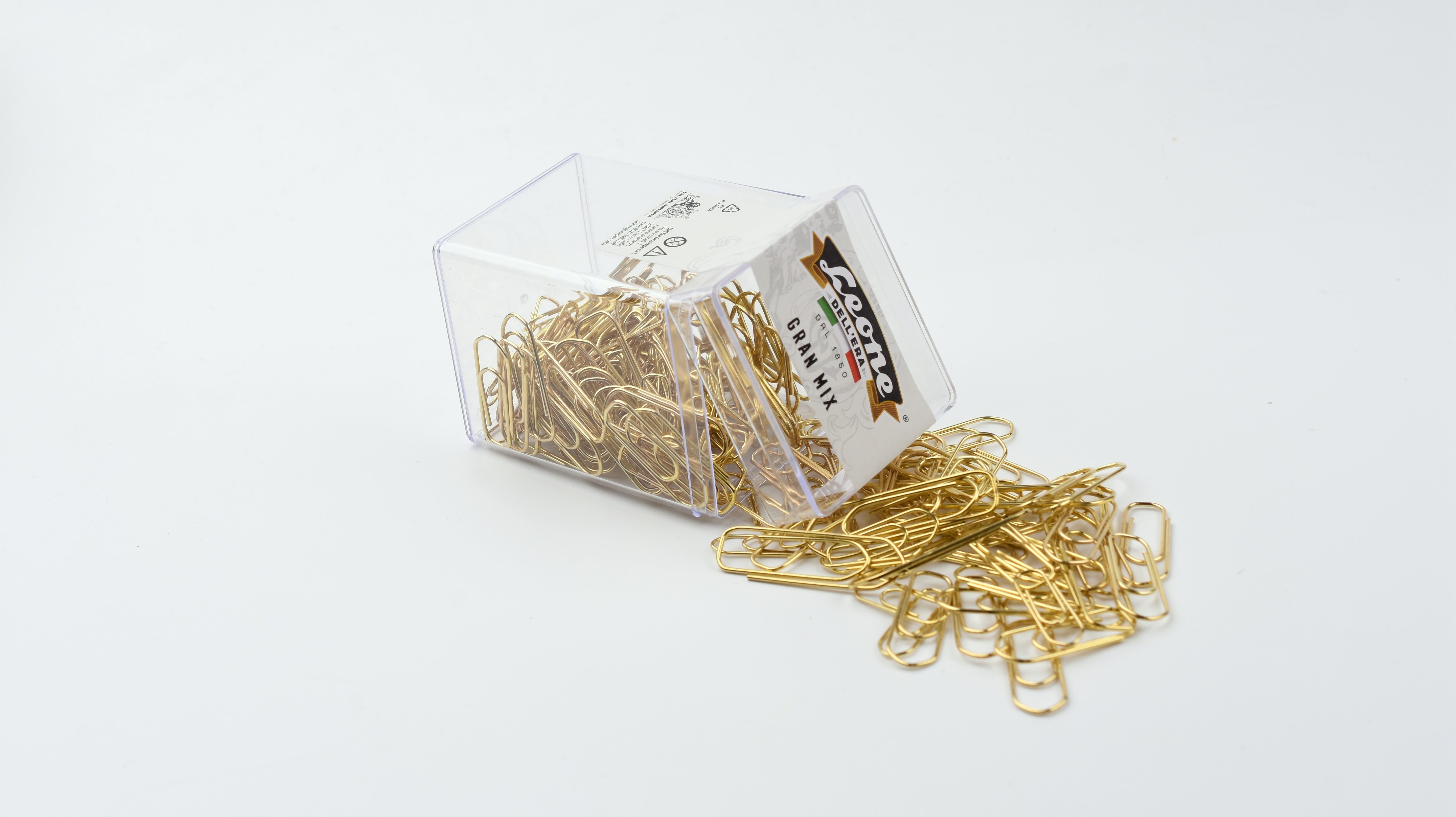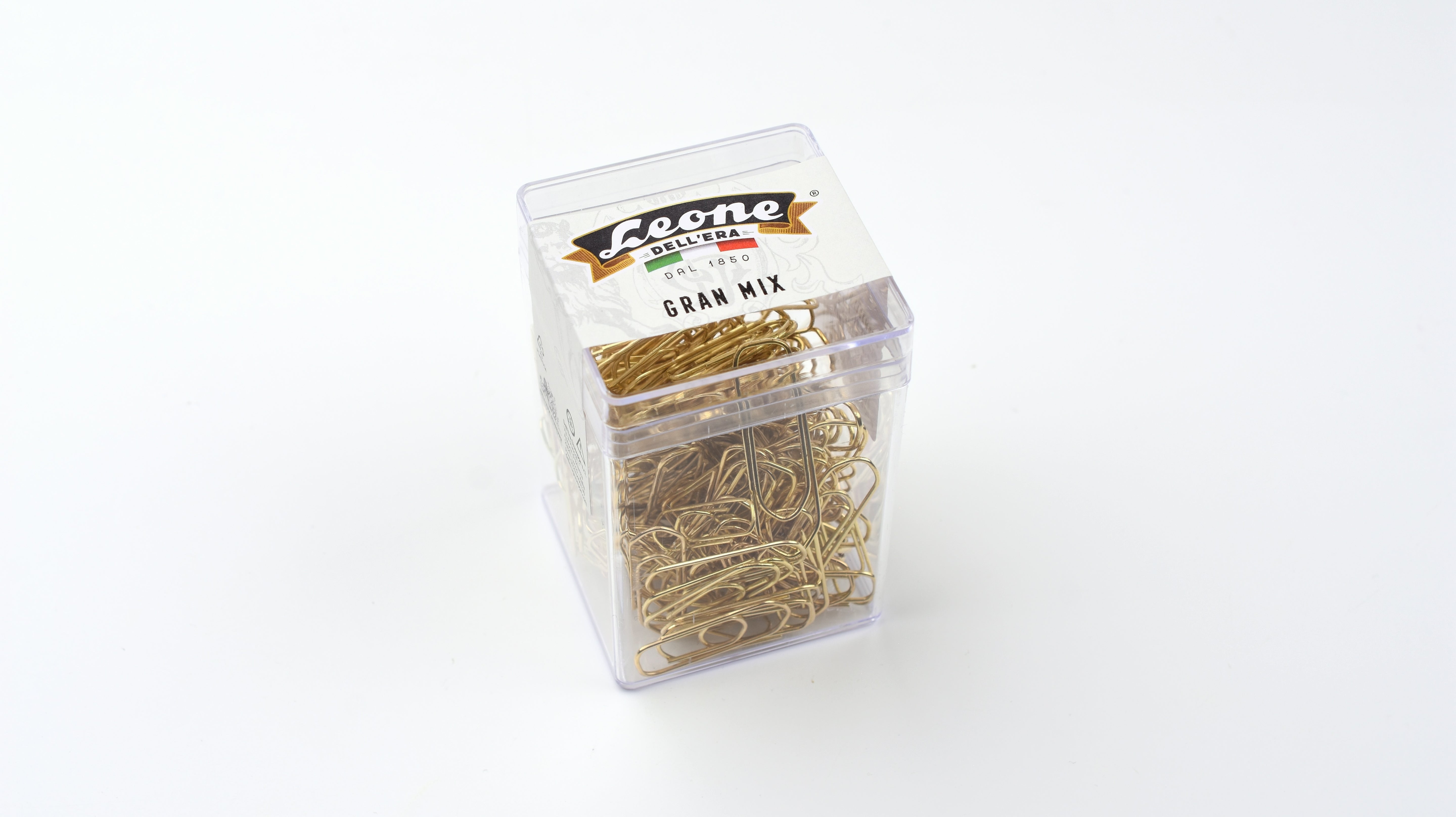 The Leone Gran Mix is an assortment of three sizes of brass-plated paper clips that maintain the strength and durability of nickel-plated clips while offering a classier look. With a sleek, shiny finish, these clips combine everyday function with a touch of style for your desk or workspace.