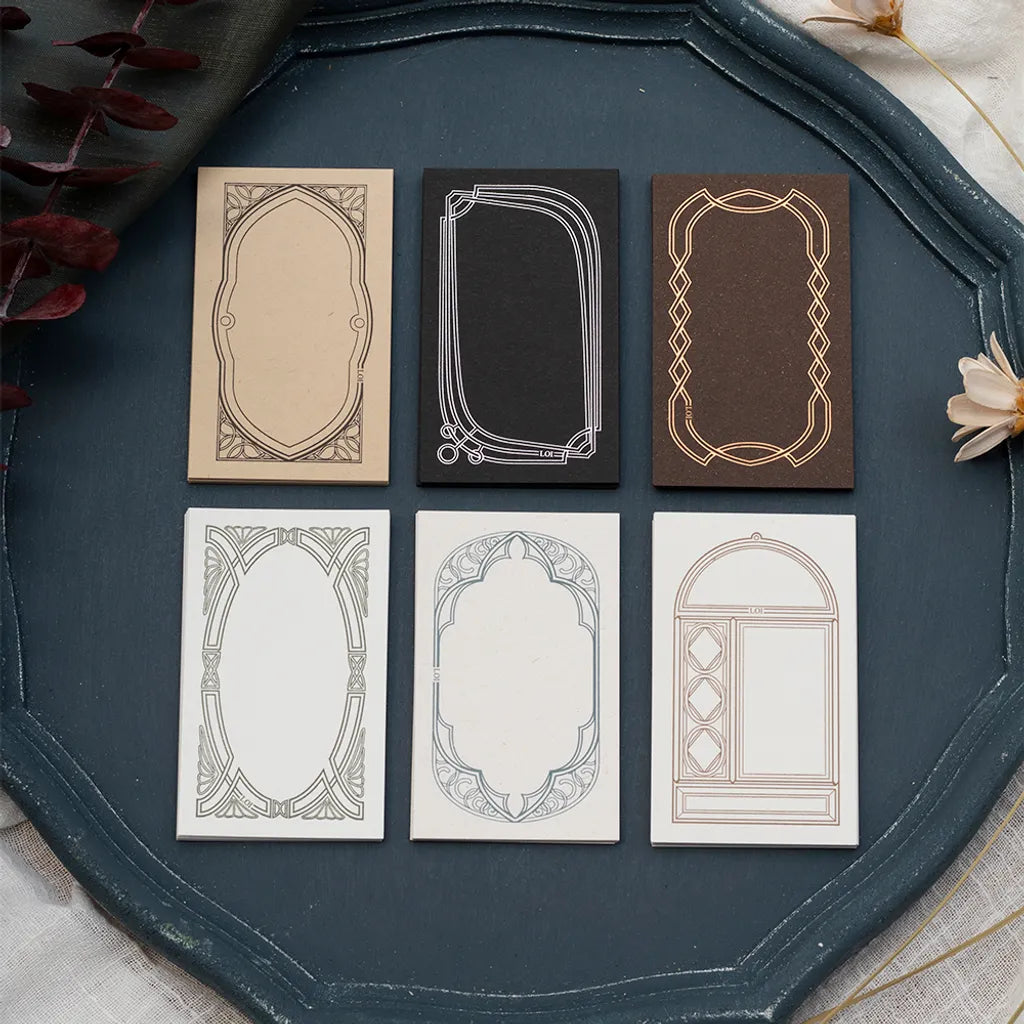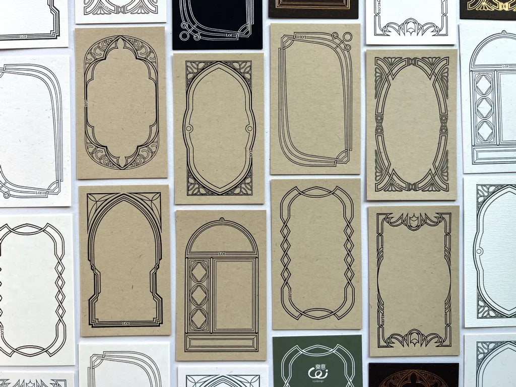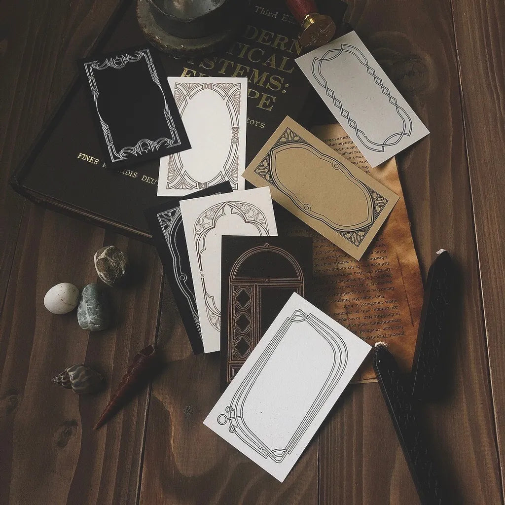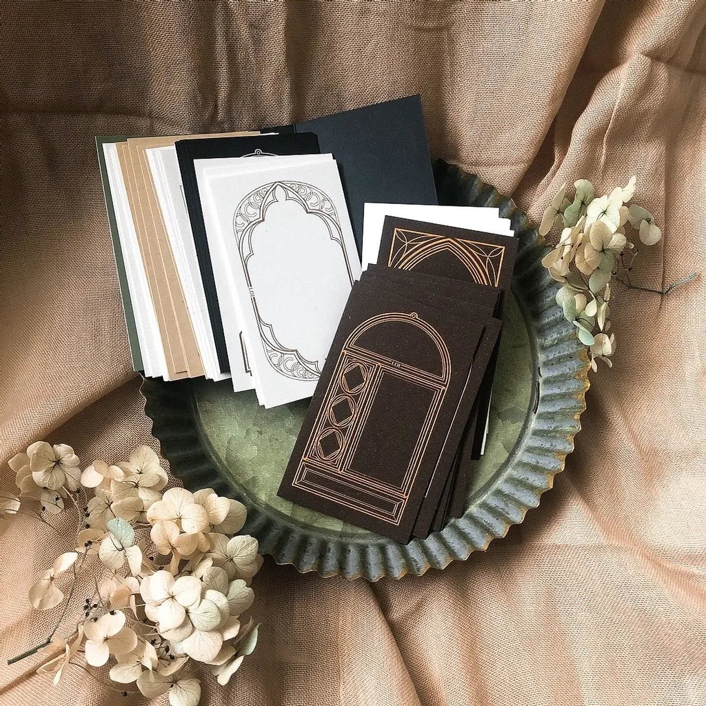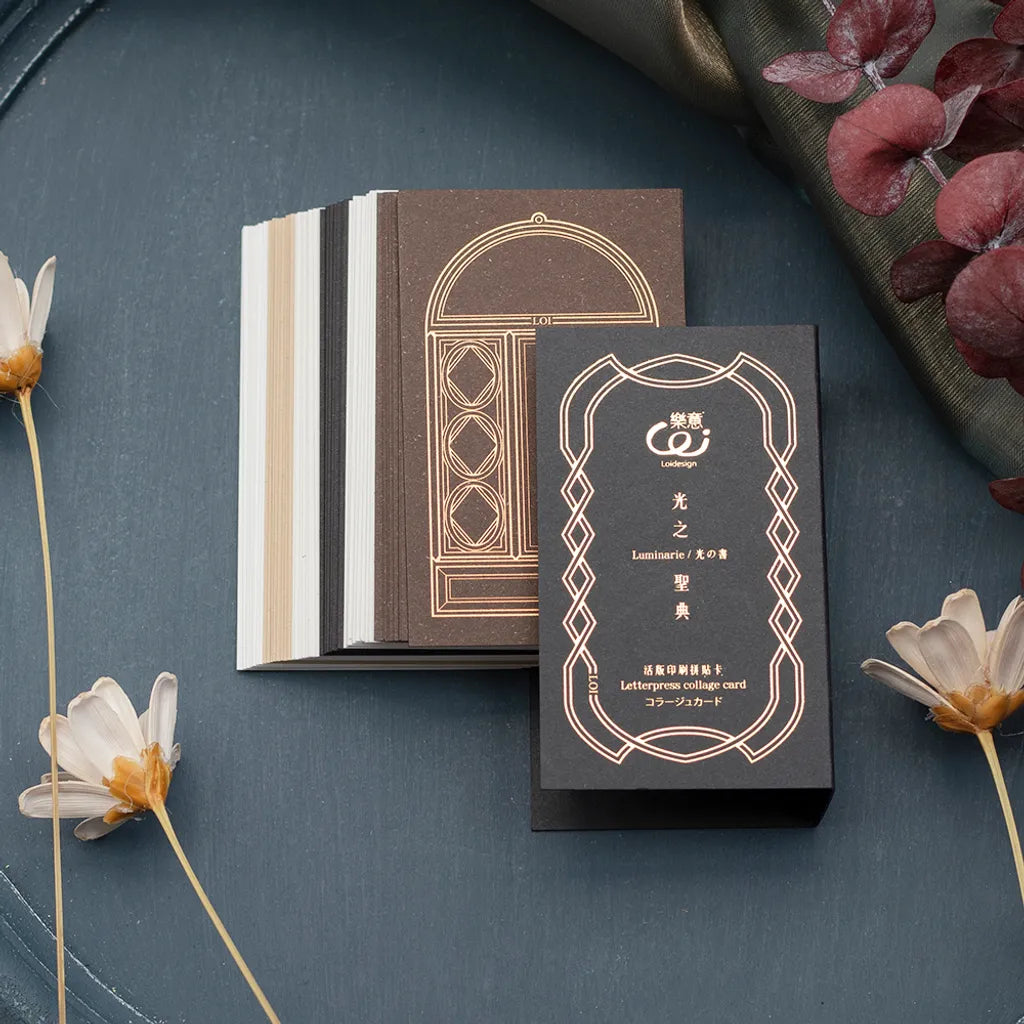 Inspired by the design of fantastical scriptures, this letterpress collage card set includes 8 different decorative designs on 6 varieties of paper textures. The entire card set is hold together in a gold foil printed book cover that reminds you of an enchanted book.