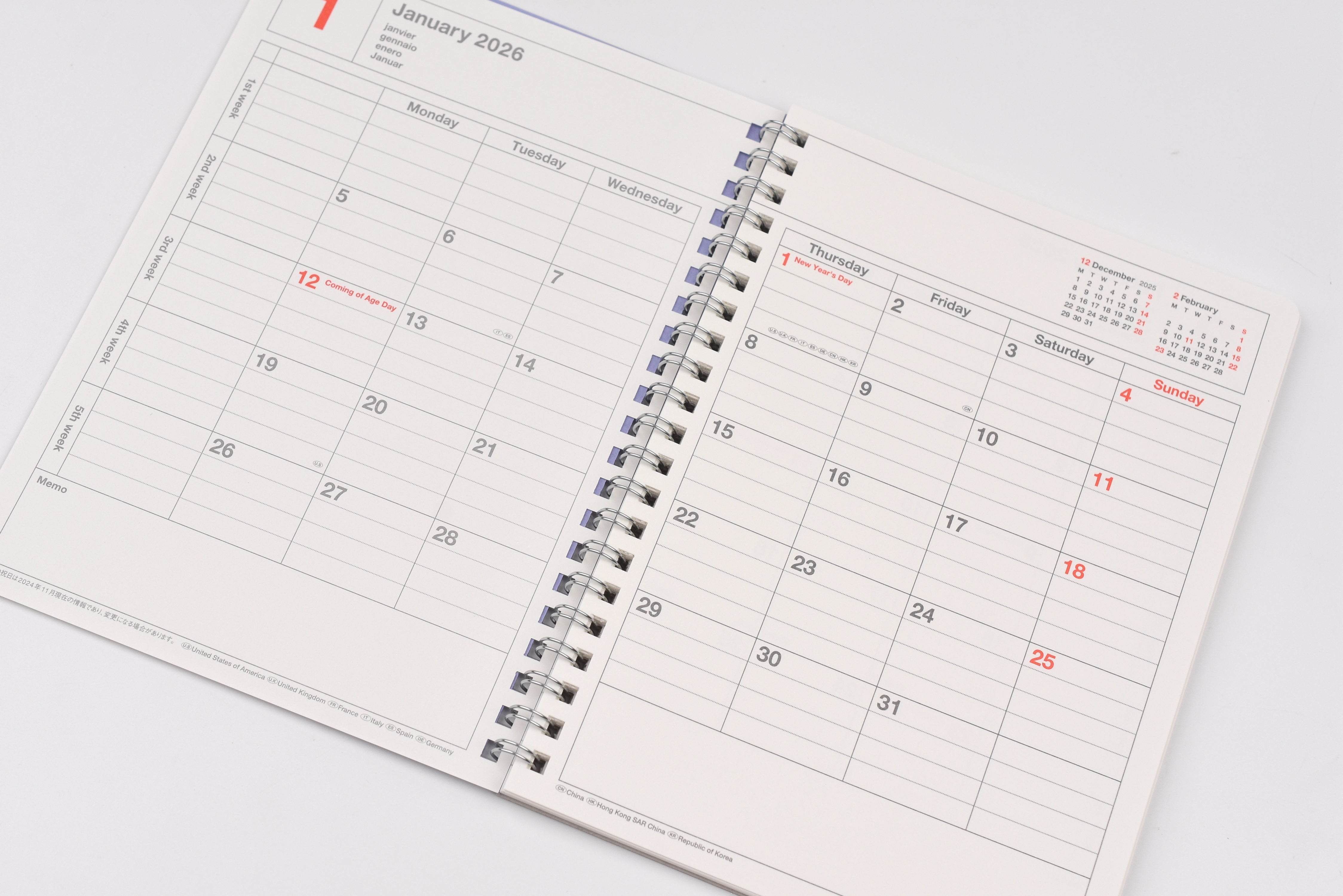 - Also includes annual calendar, extra ruled note pages, and international holidays (Japan, US, UK, France, Italy, Spain, Germany, China, Hong Kong, Korea)