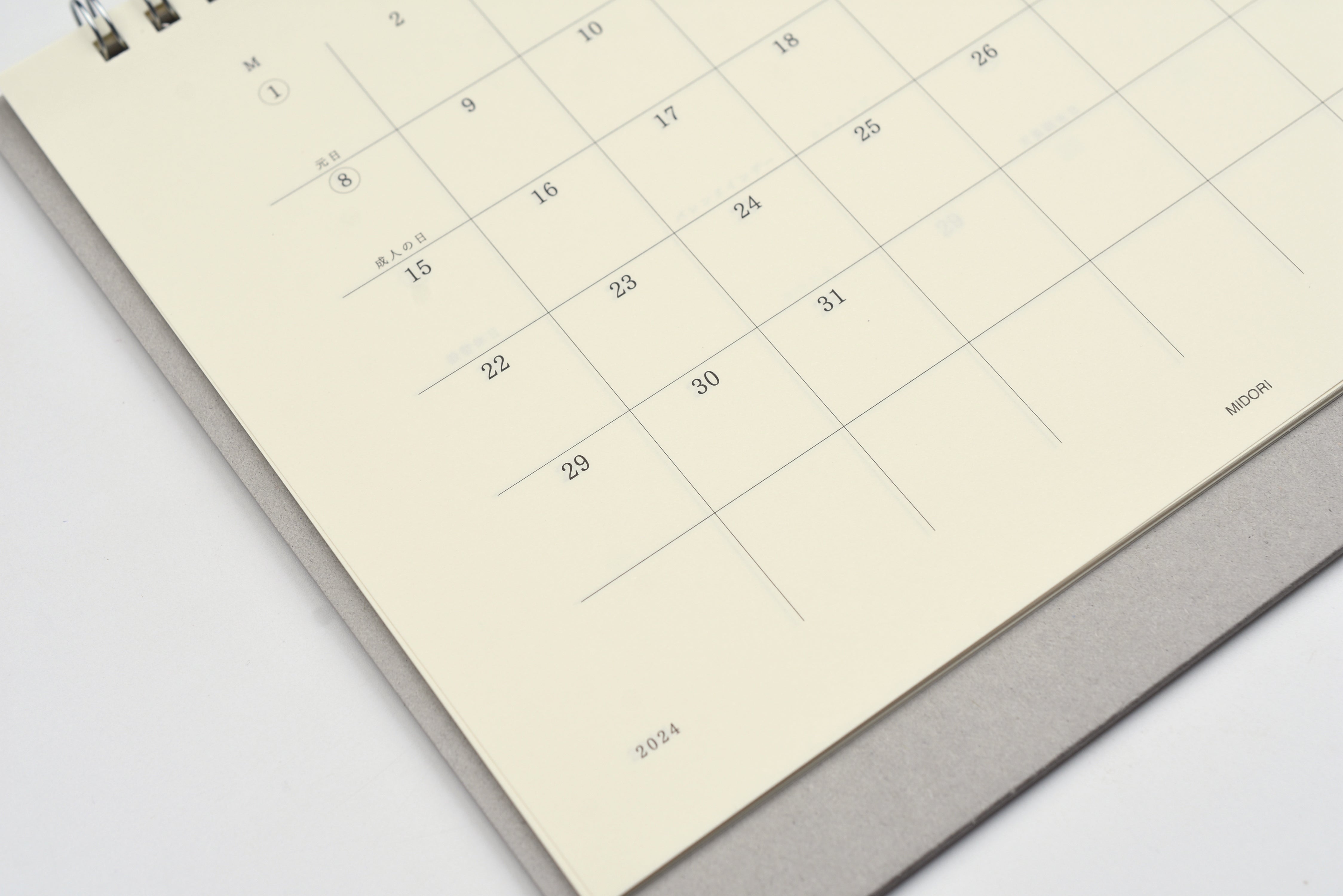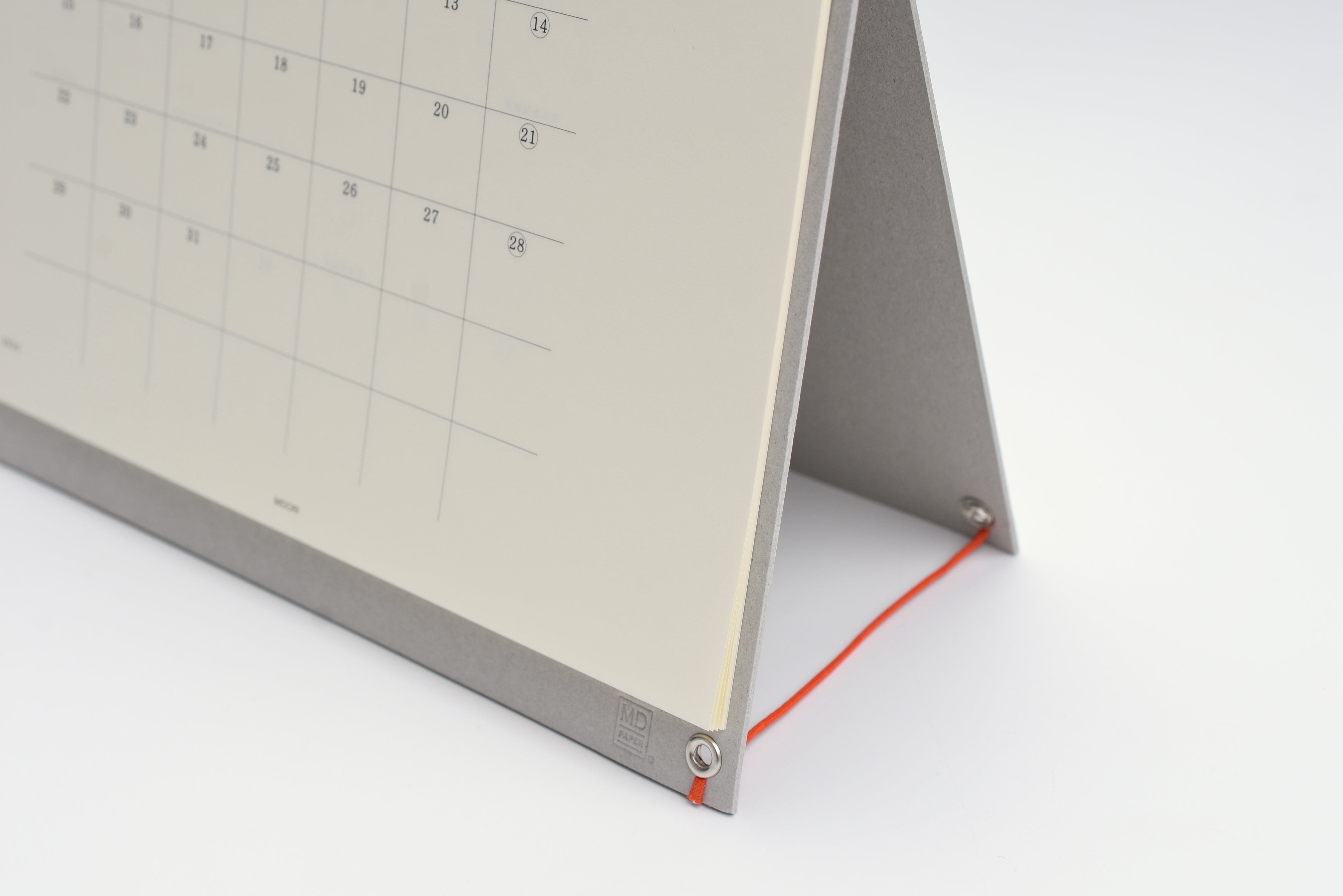 This minimal desktop calendar displays one month per page with blanks space on the right for quick notes and additional unlined memo pages for more writing space. The attached string can be tied between the holes, making it easy to stand and fold the calendar. This is the perfect desktop calendar for the minimalist that wants to see a whole month in a glance.