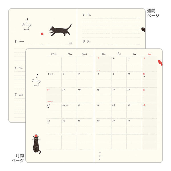 There are four different designs in total: two dog designs illustrated by Natsumi Teraoka and two cat designs illustrated by Sayo Koizumi. Each page is decorated and personalized with their cute, interactive drawings. The monthly pages are in the format of a "Monthly Block," which allows you to see the entire month easily. The weekly pages are in the format of a "Weekly Horizontal," with each day divided into two columns. Every page has a fun illustration to pair with it. The thread-stitched binding allows you to open it flat at a 180-degree angle, so you can write without stress. Finally, at the end, there are some free pages where you can enjoy journaling or doodling, a wish list, habit trackers, and a personal memo.