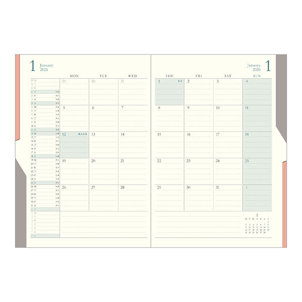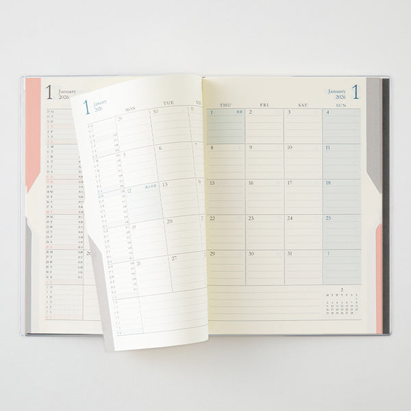 The Midori Double Schedule Diary allows you to manage two different schedules, such as "work" and "private life," or "self" and "family," in a single planner. You have two monthly calendars for each month.