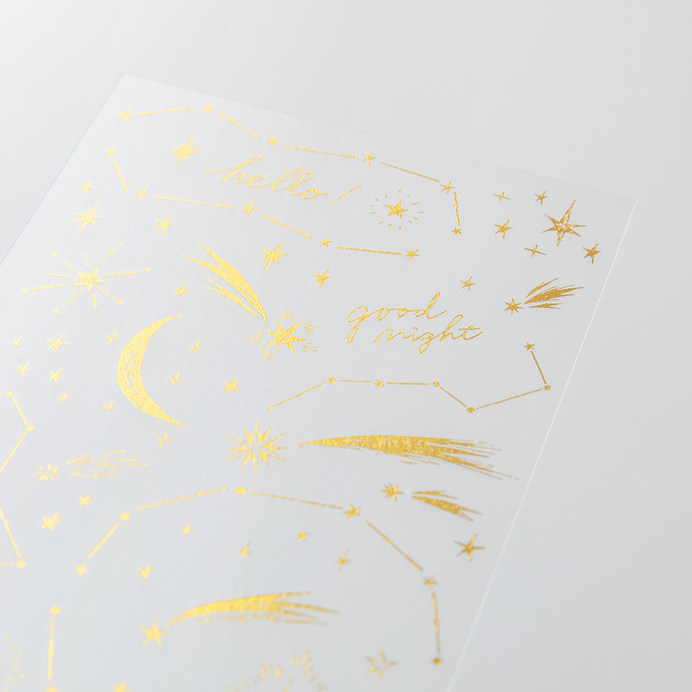 Midori Foil Transfer Stickers for Journaling come with 1 sheet of transfer sticker designs and are perfect for decorating all kinds of paper surfaces. Once applied, they give the appearance of a gold foiled motif.