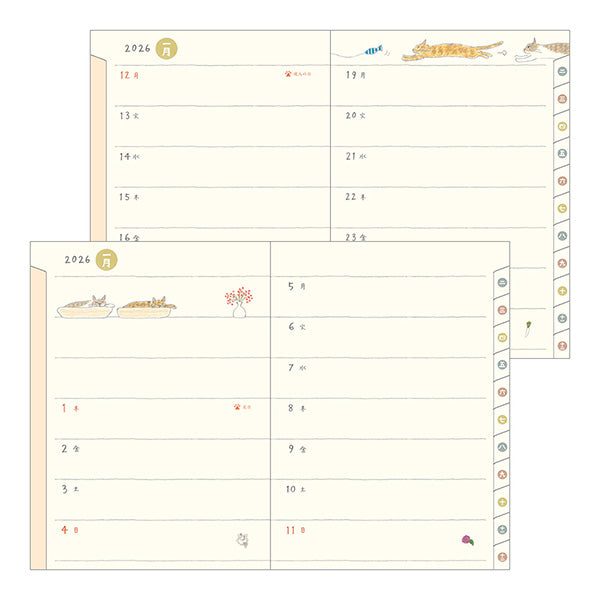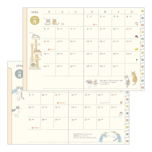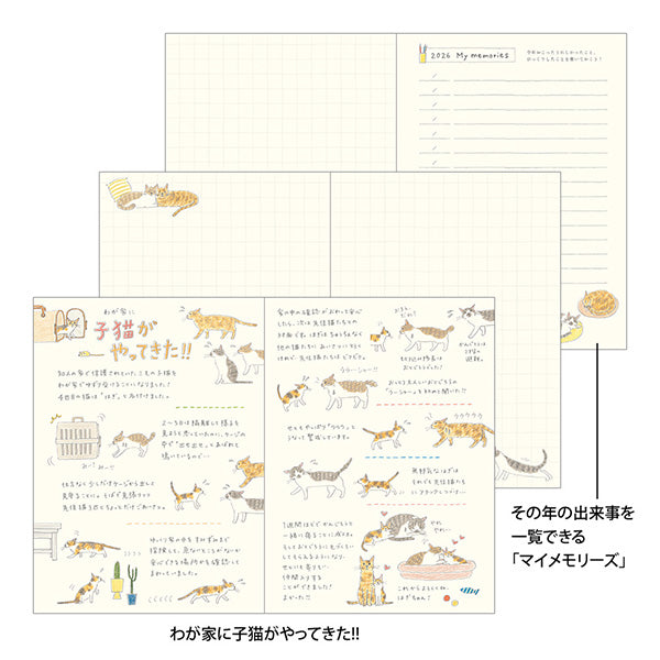 Midori's Pocket Diary – Cat is a monthly and weekly planner featuring charming cat illustrations and columns by Sayo Koizumi. The 2026 theme, "The Cats of the Koizumi Household," follows the everyday lives of the family's four unique cats, with a special column at the end titled “A kitten has come to our house!”. Thoughtfully designed with MD Paper, cloth binding, monthly index tabs, a ribbon bookmark, and a pen loop on the PVC cover, it’s both adorable and practical for everyday planning.