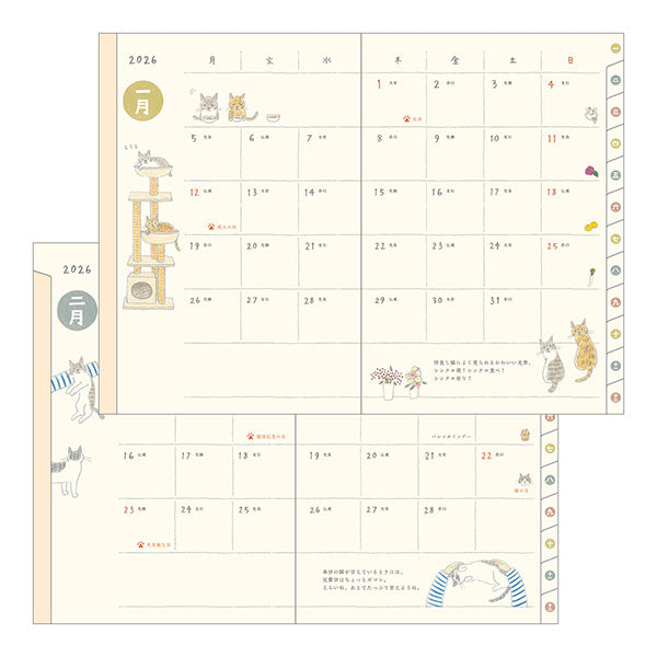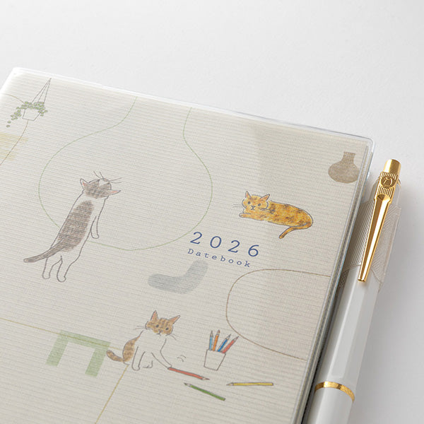 Midori's Pocket Diary – Cat is a monthly and weekly planner featuring charming cat illustrations and columns by Sayo Koizumi. The 2026 theme, "The Cats of the Koizumi Household," follows the everyday lives of the family's four unique cats, with a special column at the end titled “A kitten has come to our house!”. Thoughtfully designed with MD Paper, cloth binding, monthly index tabs, a ribbon bookmark, and a pen loop on the PVC cover, it’s both adorable and practical for everyday planning.