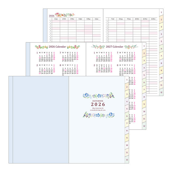 Midori's Pocket Diary – Country Time Flowers is a monthly and weekly planner featuring beautiful floral illustrations by Takako Kuriowa, printed on smooth MD Paper with a cloth-bound cover. The “Country Time” series is based on the theme of seasonal flowers, and the 2026 edition is inspired by the “Something Blue Wedding Bouquet,” featuring popular blue flowers often seen in gardens. Practical details like monthly index tabs, a ribbon bookmark, and a sturdy PVC cover with a pen loop make it both charming and functional.