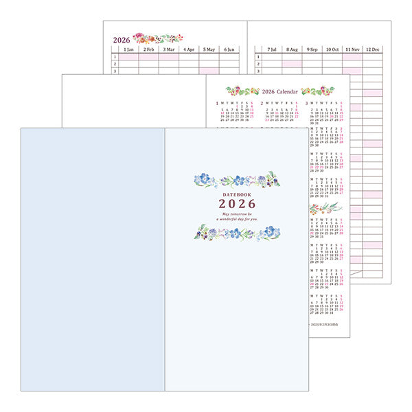 Midori's Pocket Diary – Country Time Flowers is a monthly planner featuring beautiful floral illustrations by Takako Kuriowa, printed on smooth MD Paper with a cloth-bound cover. The “Country Time” series is based on the theme of seasonal flowers, and the 2026 edition is inspired by the “Something Blue Wedding Bouquet,” featuring popular blue flowers often seen in gardens. Practical details like monthly index tabs, a ribbon bookmark, and a sturdy PVC cover with a pen loop make it both charming and functional.