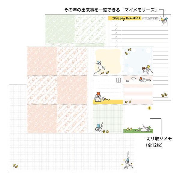 Midori's Pocket Diary – Ojisan is a monthly and weekly planner featuring cute illustrations of a man and his dogs, as well as Midori's smooth MD Paper and cloth binding. A long-selling planner that has charmed fans since 1994, the 2026 edition follows the theme “Relaxed, laid-back, and sometimes active, Ojisan that runs across the pages.” It features Ojisan in the margins and includes pages that reflect the voices of fans from the 30th Anniversary event. Thoughtful details include a ribbon bookmark, numbered index tabs, and a sturdy PVC cover with a pen loop.