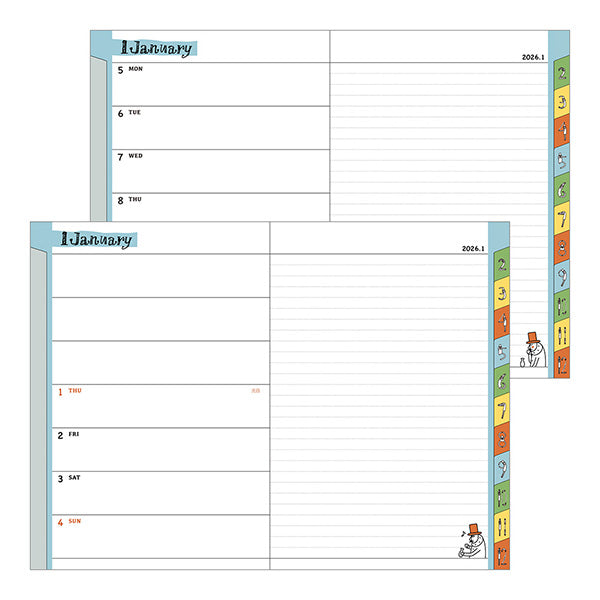 Midori's Pocket Diary – Ojisan is a monthly and weekly planner featuring cute illustrations of a man and his dogs, as well as Midori's smooth MD Paper and cloth binding. A long-selling planner that has charmed fans since 1994, the 2026 edition follows the theme “Relaxed, laid-back, and sometimes active, Ojisan that runs across the pages.” It features Ojisan in the margins and includes pages that reflect the voices of fans from the 30th Anniversary event. Thoughtful details include a ribbon bookmark, numbered index tabs, and a sturdy PVC cover with a pen loop.