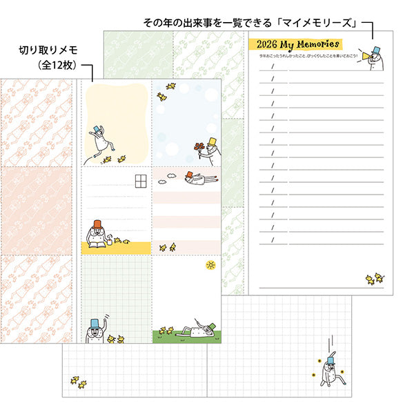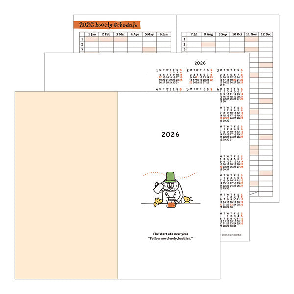Midori's Pocket Diary – Ojisan is a monthly planner featuring cute illustrations of a man and his dogs, as well as Midori's smooth MD Paper and cloth binding. A long-selling planner that has charmed fans since 1994, the 2026 edition follows the theme “Relaxed, laid-back, and sometimes active, Ojisan that runs across the pages.” It features Ojisan in the margins and includes pages that reflect the voices of fans from the 30th Anniversary event. Thoughtful details include a ribbon bookmark, numbered index tabs, and a sturdy PVC cover with a pen loop.