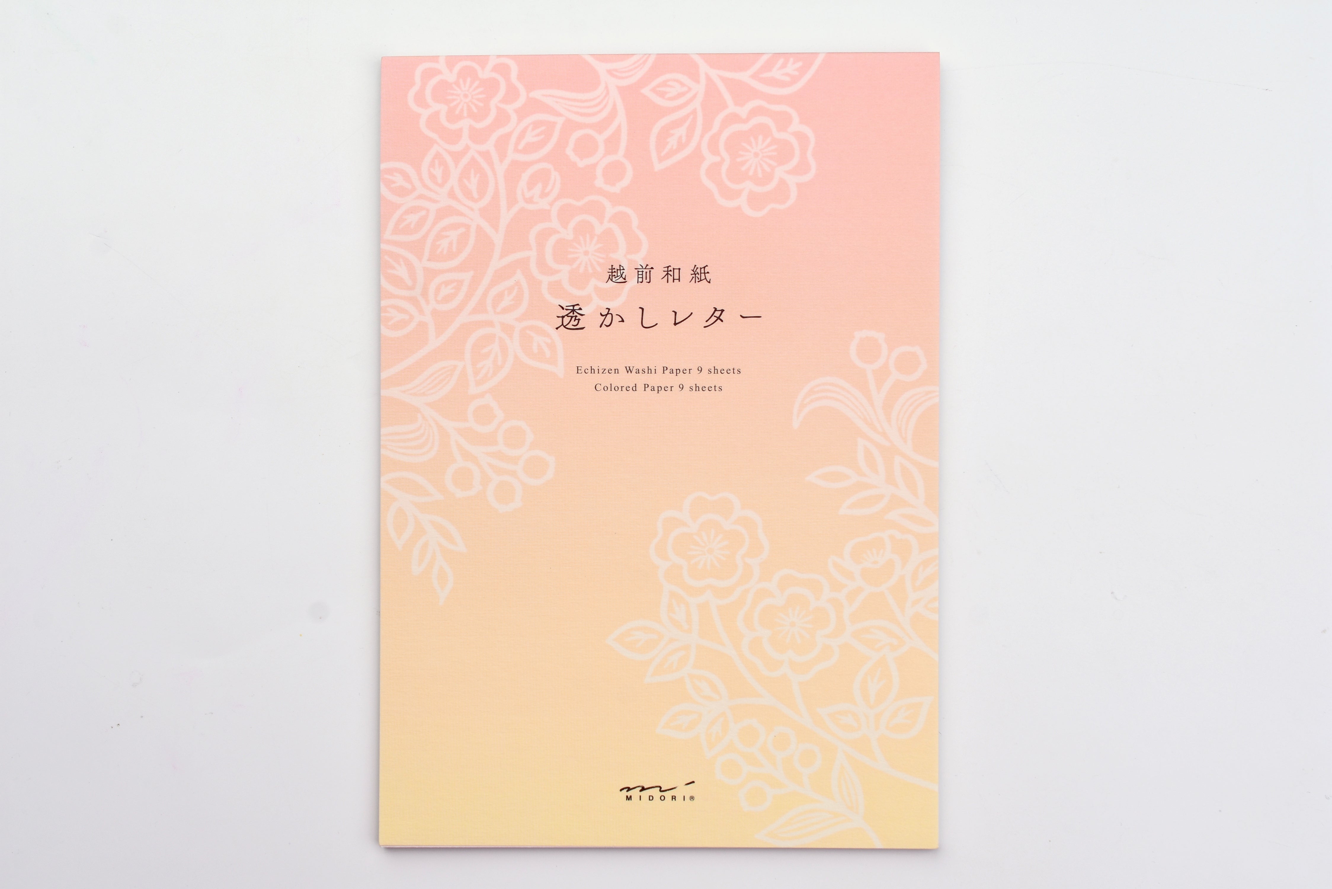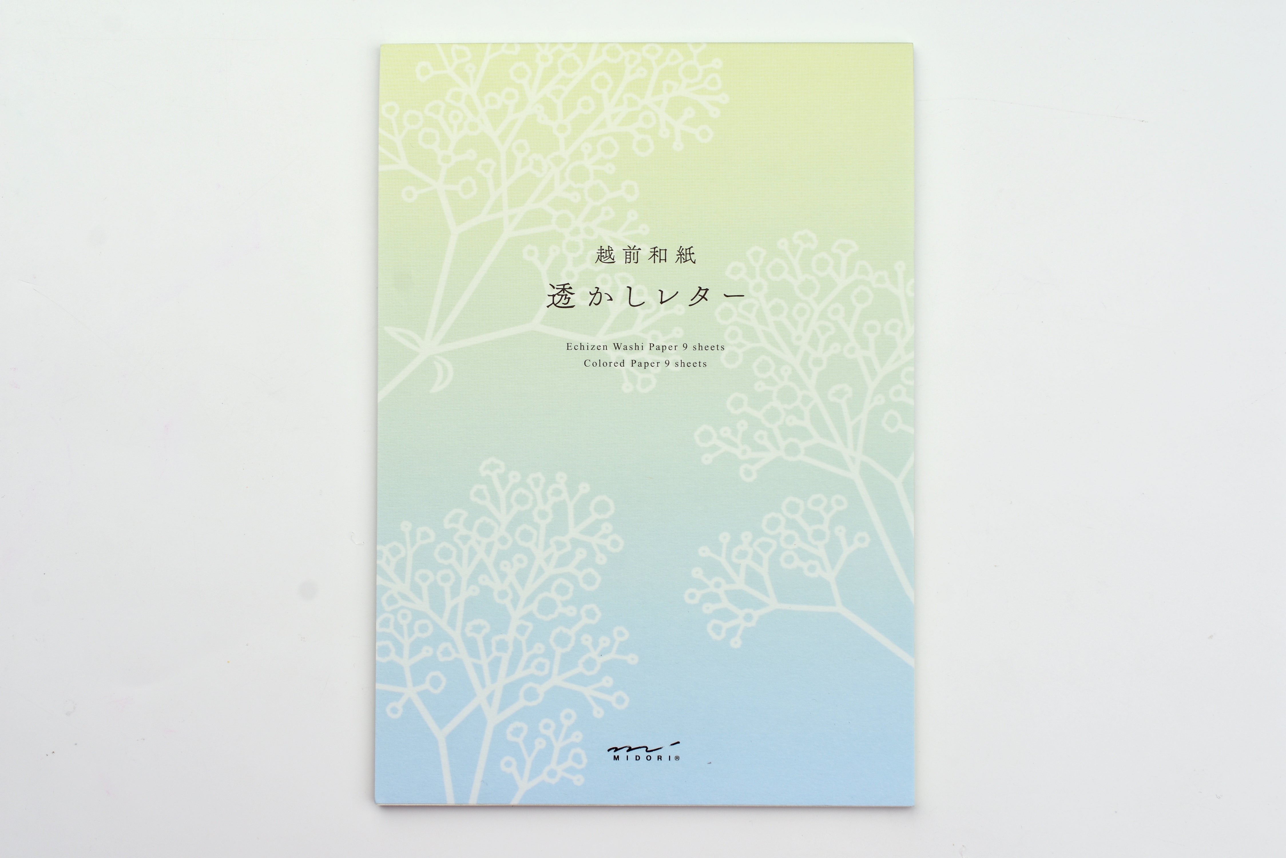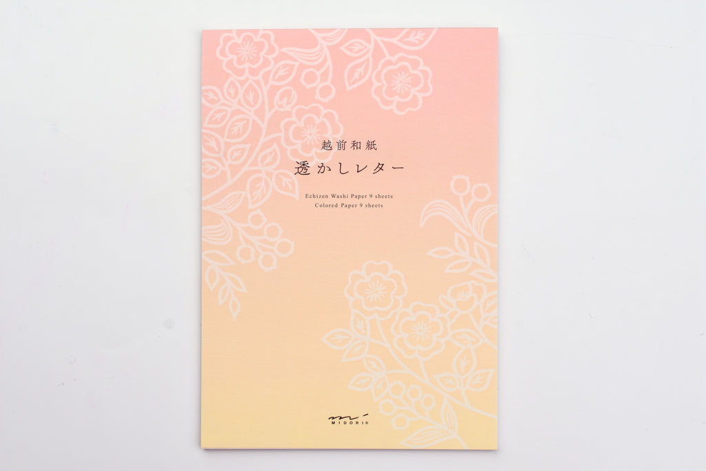 Midori Watermark Letter Pads include 9 soft colored paper and 9 white Japanese traditional washi paper with watermarked design on them. The translucent watermark pattern appears when the washi paper is placed over colored paper, giving this soft colored Letter Pad an element of gentle surprise! Because the pattern is very light and subtle, it doesn't interfere with the writing, making this letter pad very easy to use. The watermarked washi paper is thin and may tear if you write too strongly or with a fine tip.