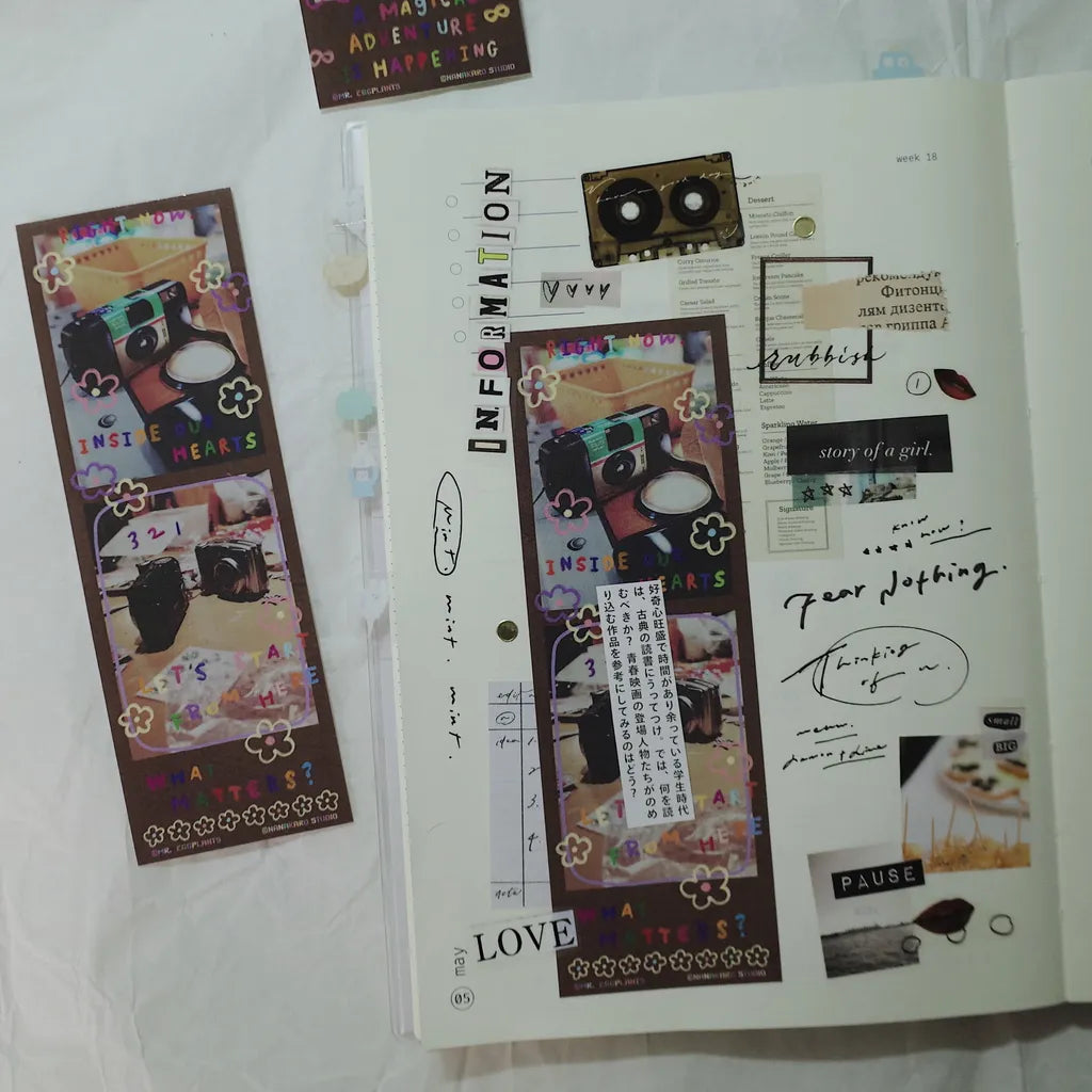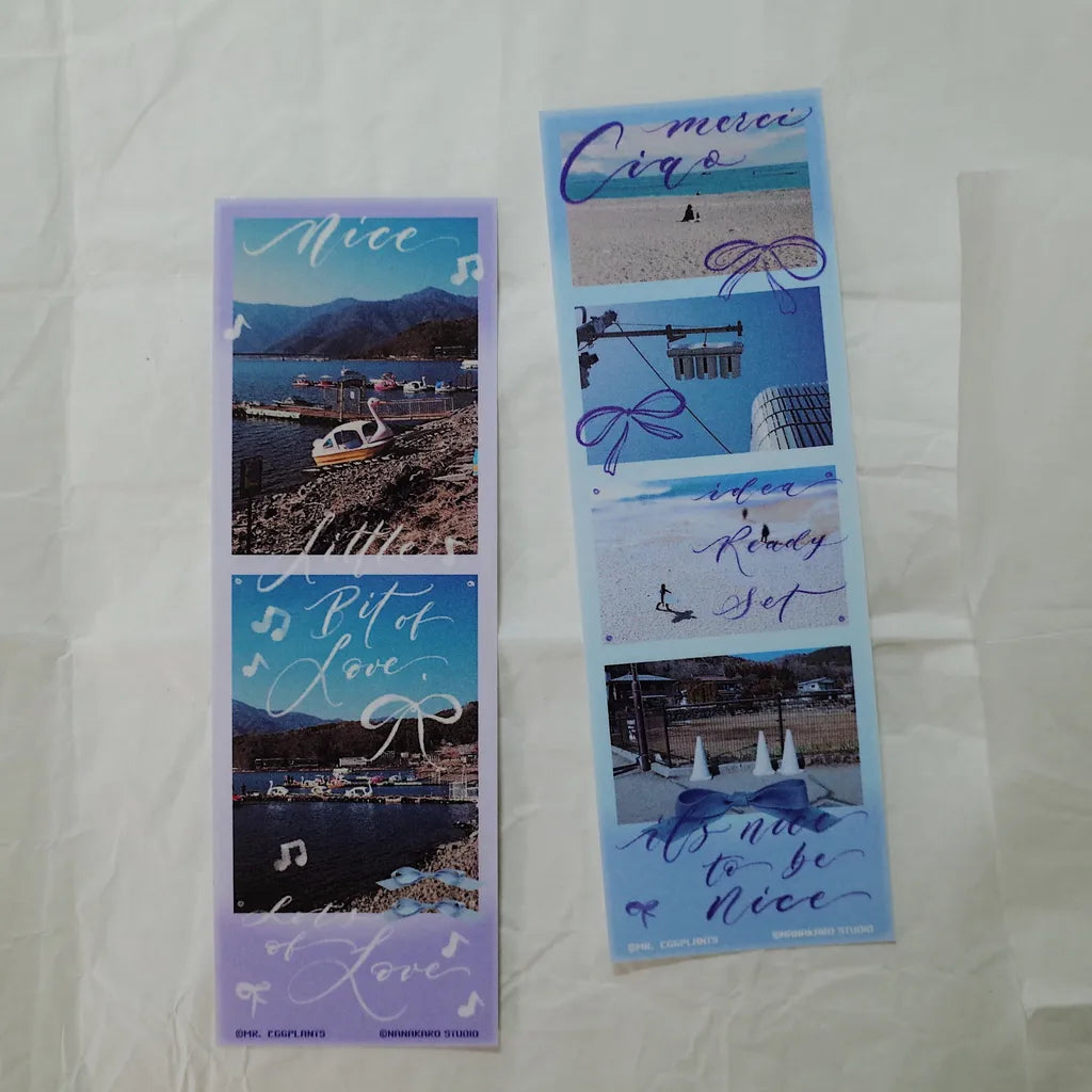 This Photo Booth Sticker Set comes in 5 different colors, Blue Bow, Black Frame, Silver Gray, Brown Sugar and Purple Checkered. The designs are super playful and fun and are a perfect accent to your journaling spreads, decorating and crafting.