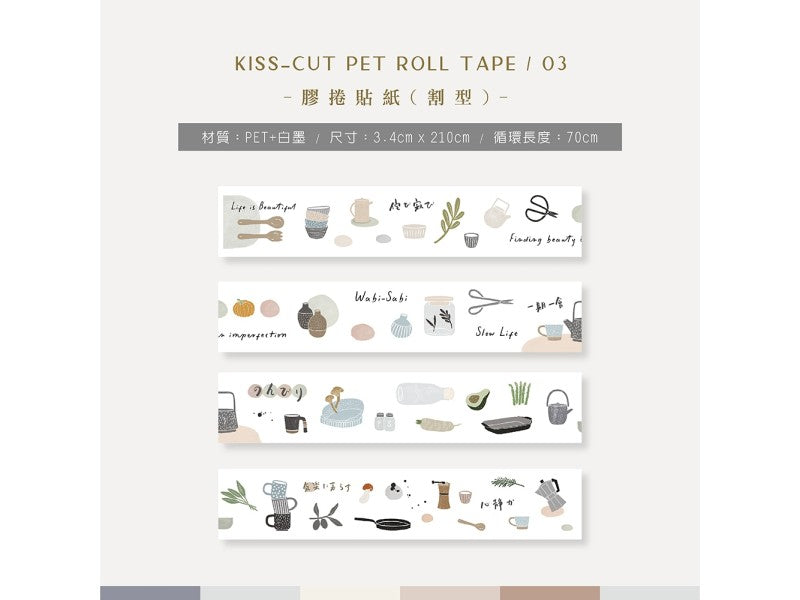 MU Kiss-Cut PET Roll Tape - packaged like a vintage film roll, each roll of stickers showcases different daily life activities, moods, moments, and scenes. Crafted from film-type PET tape, every small illustration is kiss-cut for easy peeling and sticking onto your journal pages. For storage, simply rewind the tape by turning the reel.