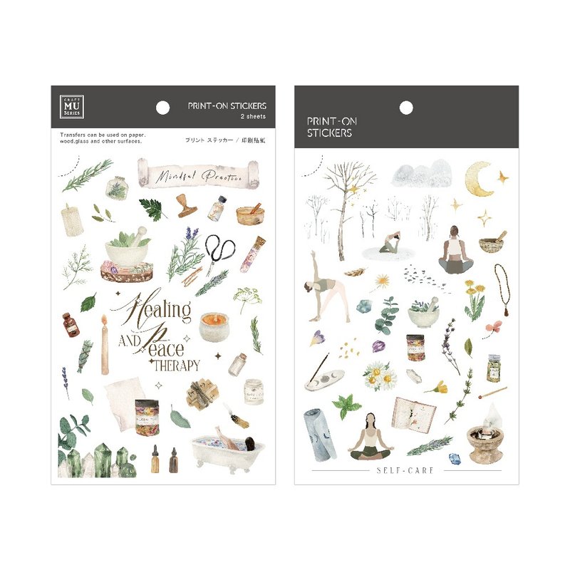 MU Print-On Stickers come with 2 sheets of different sticker designs and are perfect for decorating and personalizing. They can be used on paper, wood, glass and other smooth surfaces. Overlay the stickers in your journal, on cards, or other objects to create your own designs. To use, cut out the desired patterns, separate the back paper, position it on the surface you wish to print on, use a hard edge such as the wooden transfer stick to scratch all over the design and then tear off the plastic layer to reveal the finished print-on.