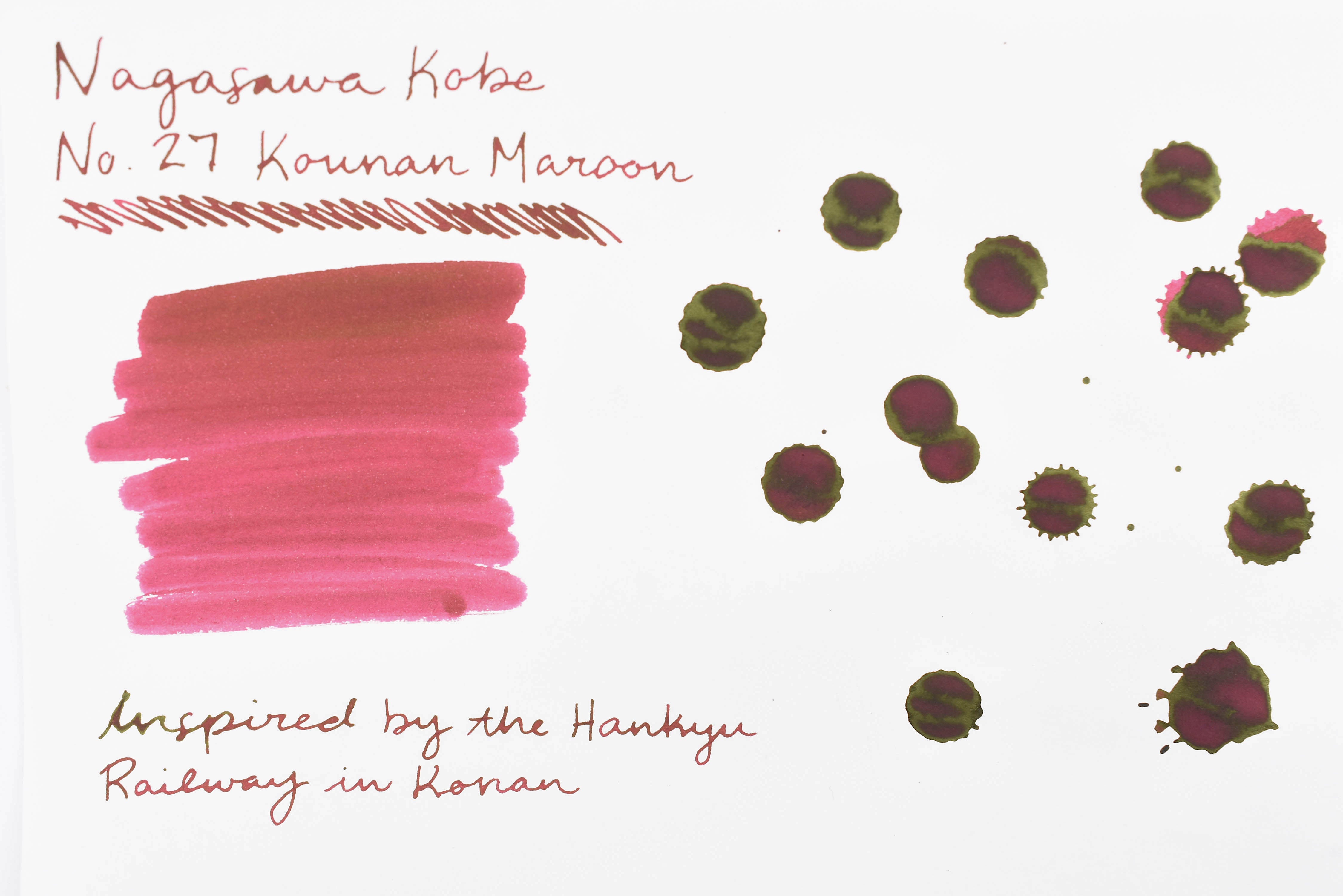 Nagasawa Kobe Ink No.27 Konan Maroon 甲南紅褐. Konan is a lively university town, bustling with youth and activity. The Hankyu Railway is a famous train line that runs through this area. Konan Maroon ink represents the characteristic color of this dignified and graceful train.