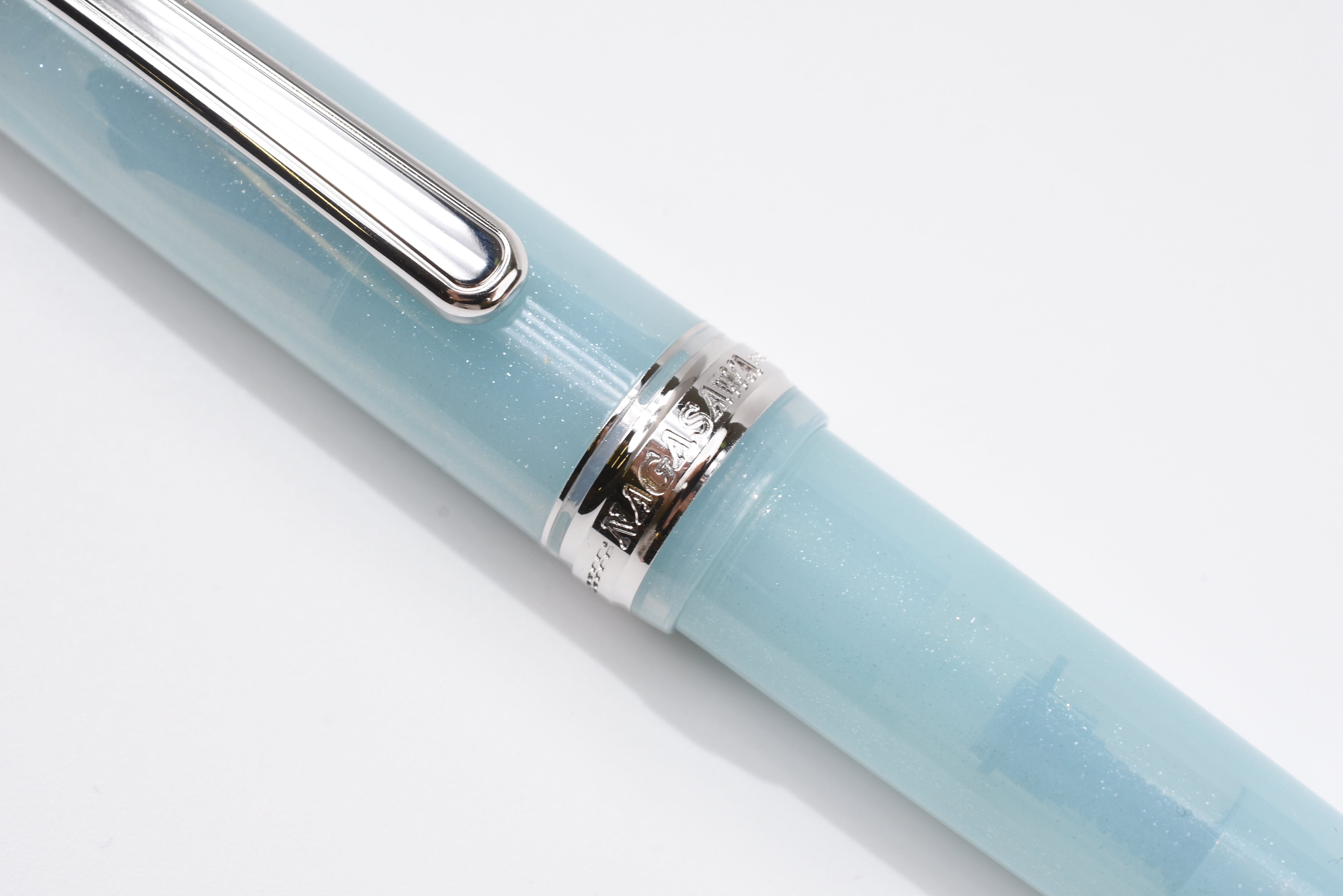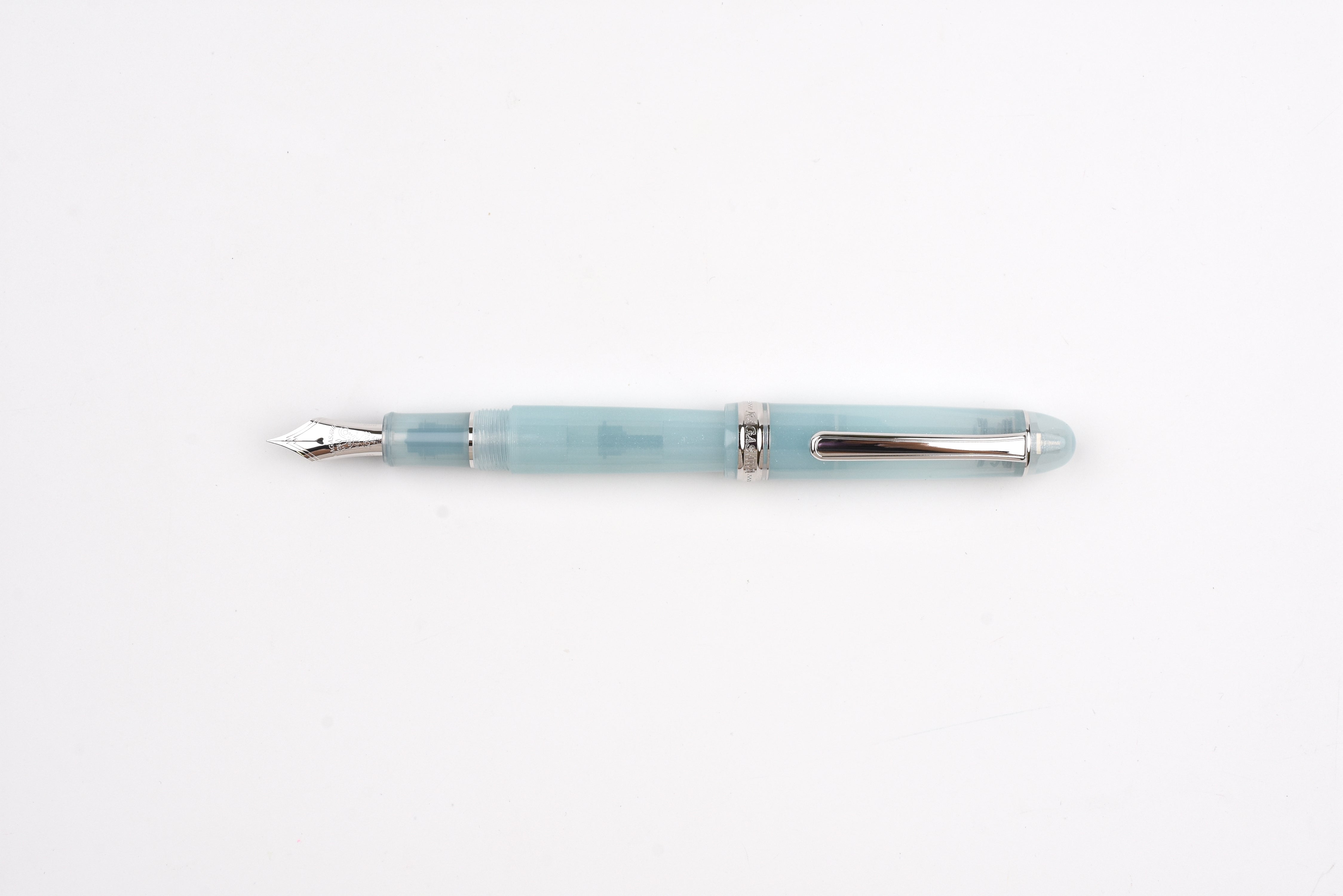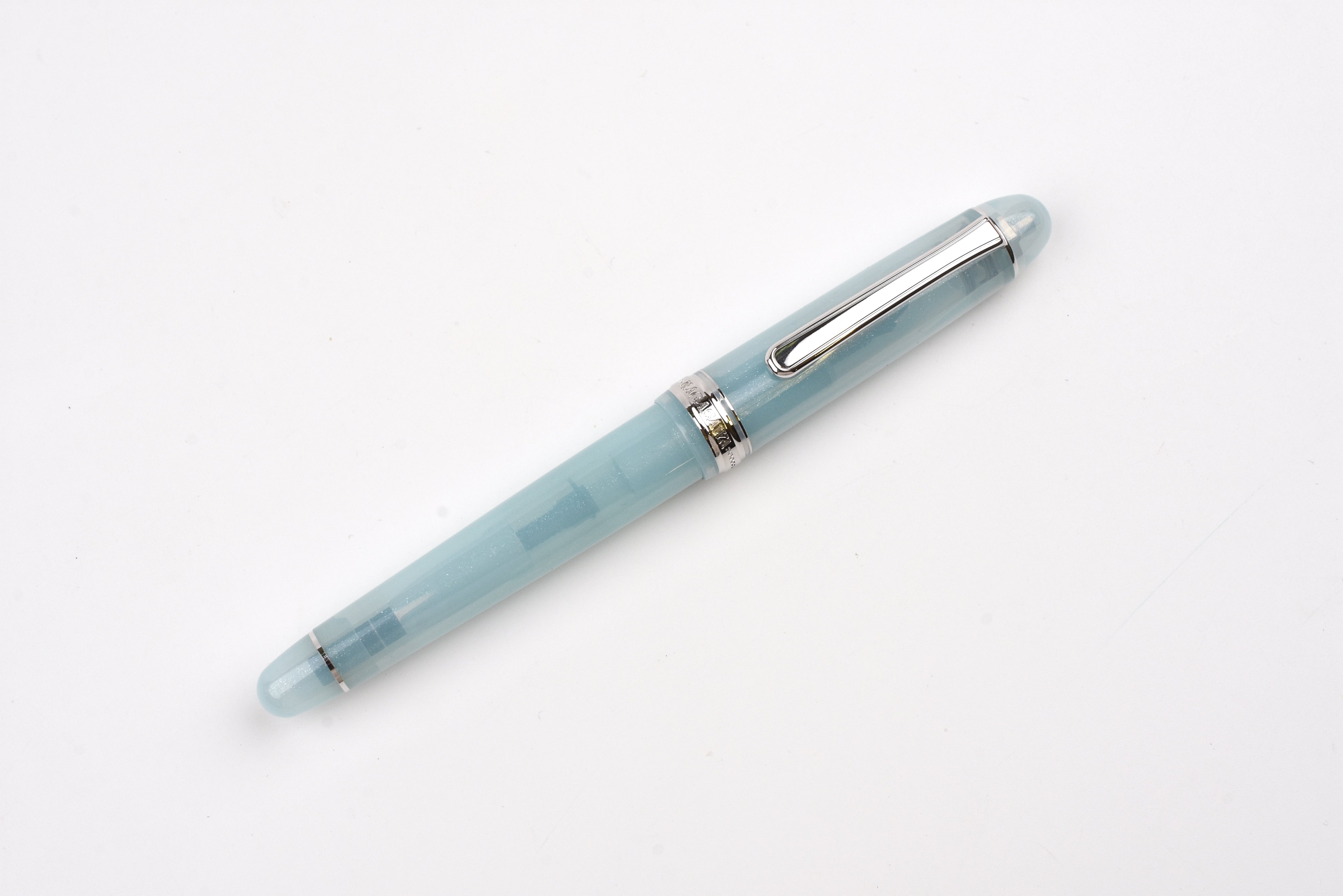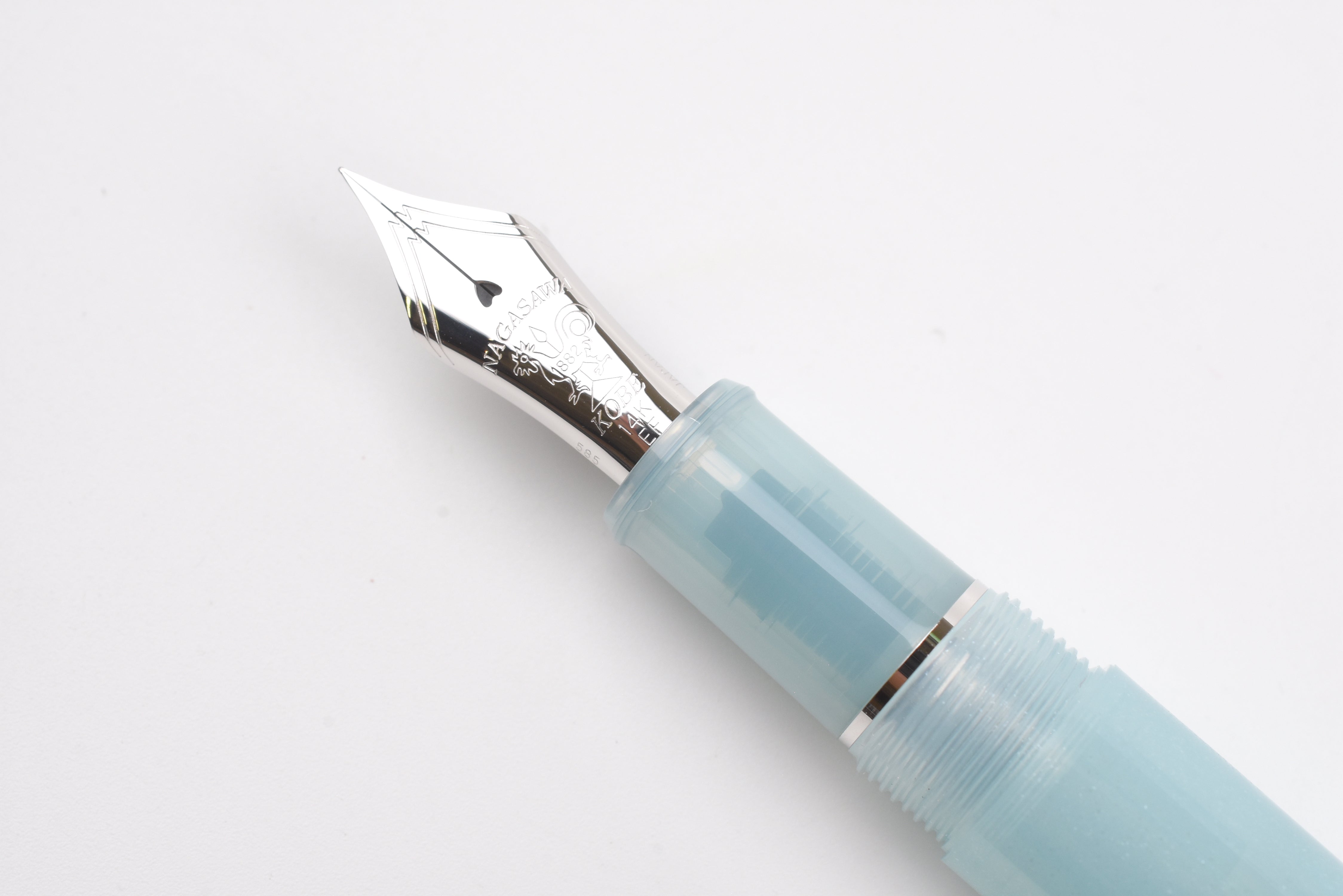 The Nagasawa Original 3776 PenStyle - Kobe Hassho - Cider - Limited Edition takes inspiration from Kobe, the first city in Japan to produce cider (soda pop). Its design reflects the refreshing sparkle of cider, with a translucent blue body scattered with silver glitter and a slightly darker blue grip section without glitter for contrast. Finished with silver trim and a 14k gold nib engraved with the Nagasawa logo, this limited edition pen combines cultural heritage with refined craftsmanship.