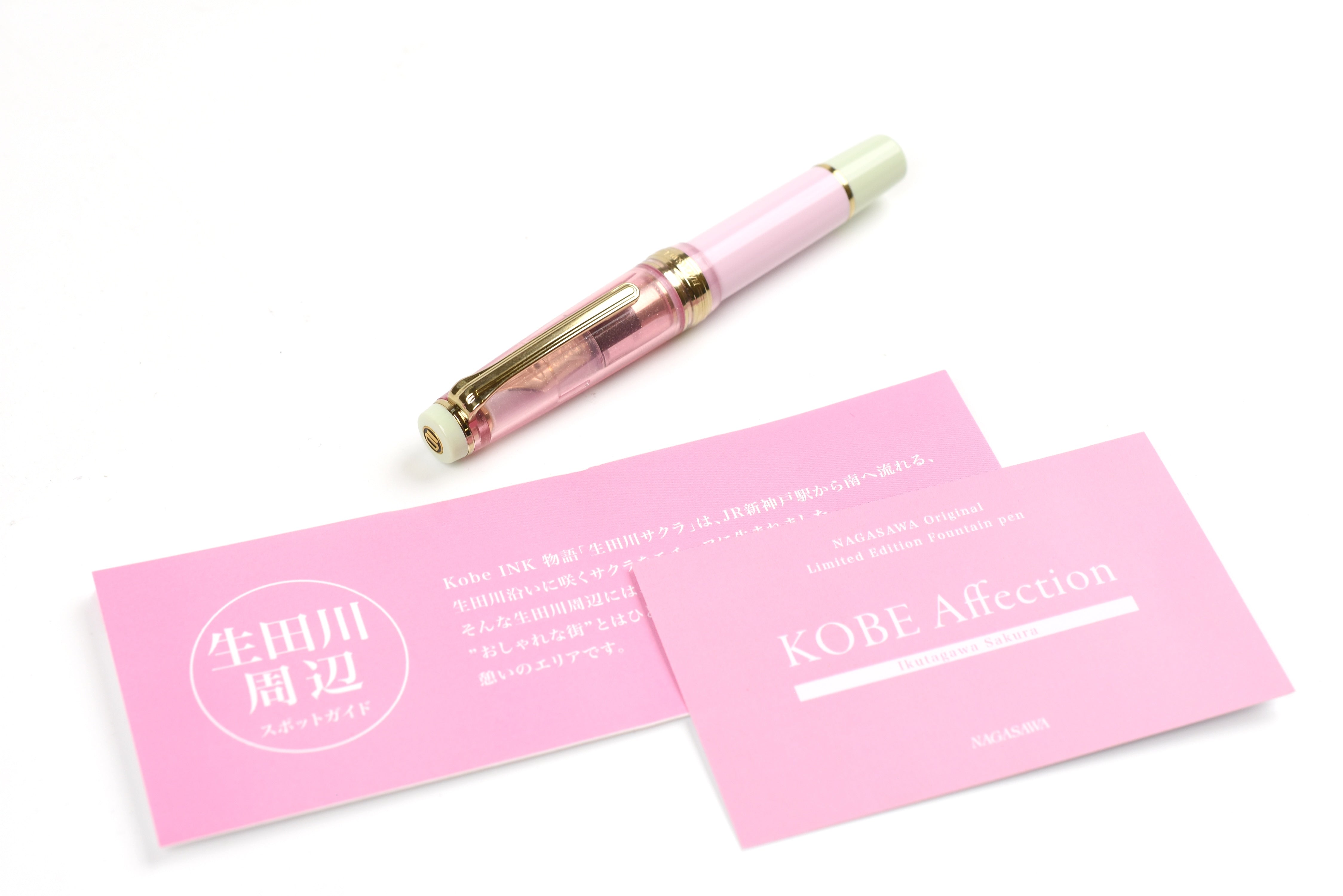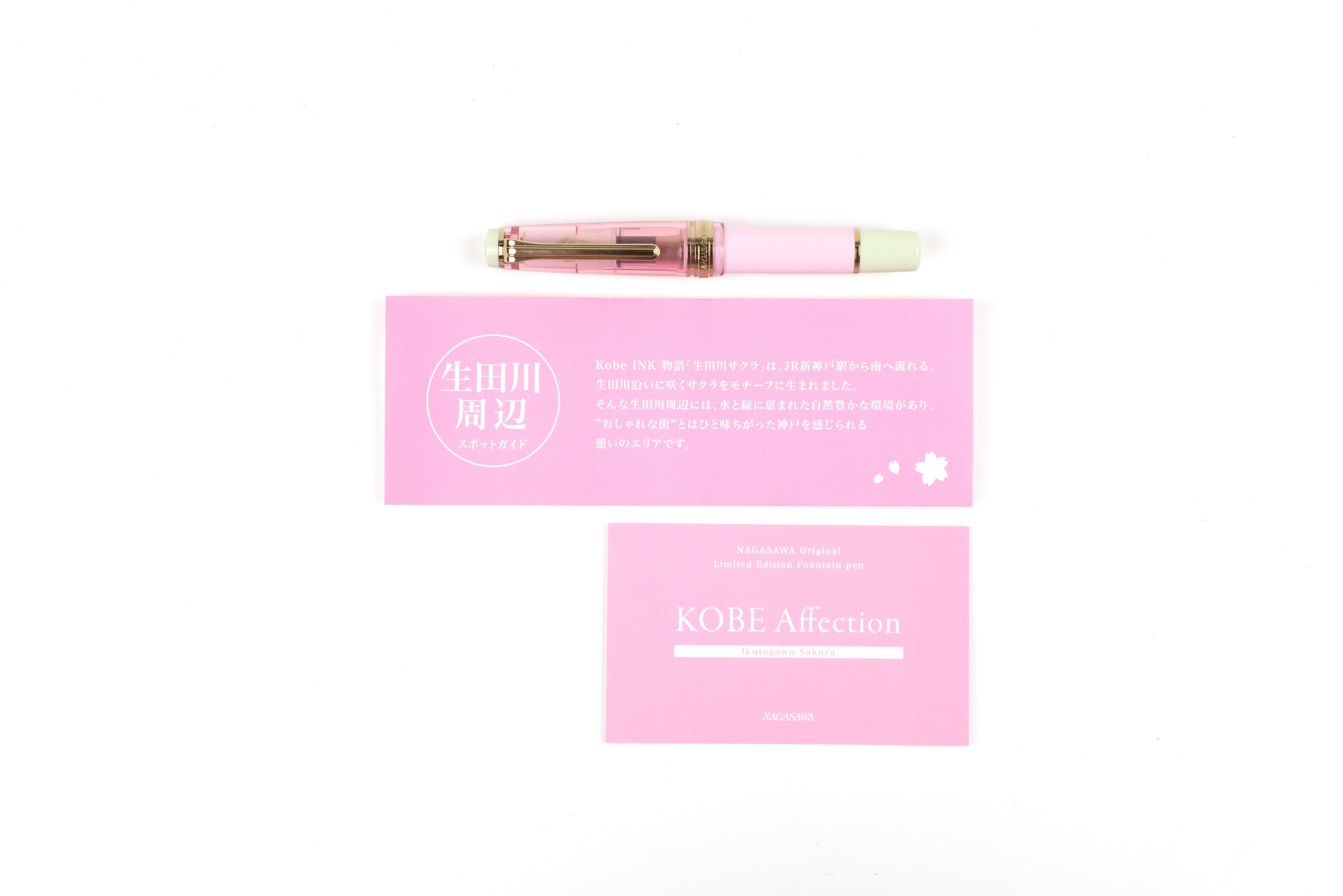 The specially produced KOBE Affection fountain pen "Ikuta-gawa Sakura" is based on the motif of the cherry blossoms that decorate the Ikuta-gawa area, with the cherry blossom petals in a transparent pink, the full bloom in full bloom in a deep cherry color, and the budding young leaves in green, packing the life of a cherry blossom into a fountain pen.