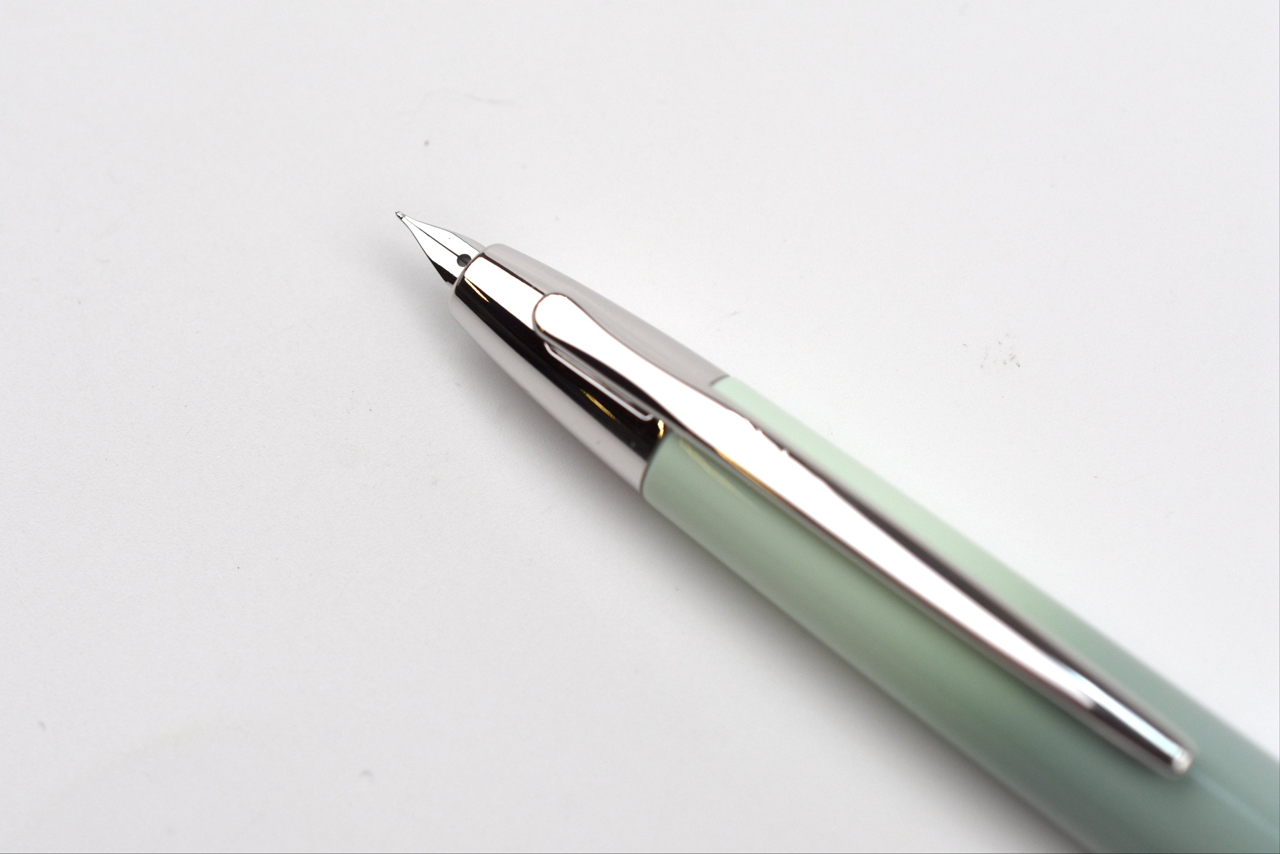 This pen is absolutely stunning! I don’t think any picture could do it justice. I was having trouble deciding between the gold and rhodium trim. The gold sold out so the choice was made for me. The rhodium goes beautifully with the mostly mint body of the pen. I