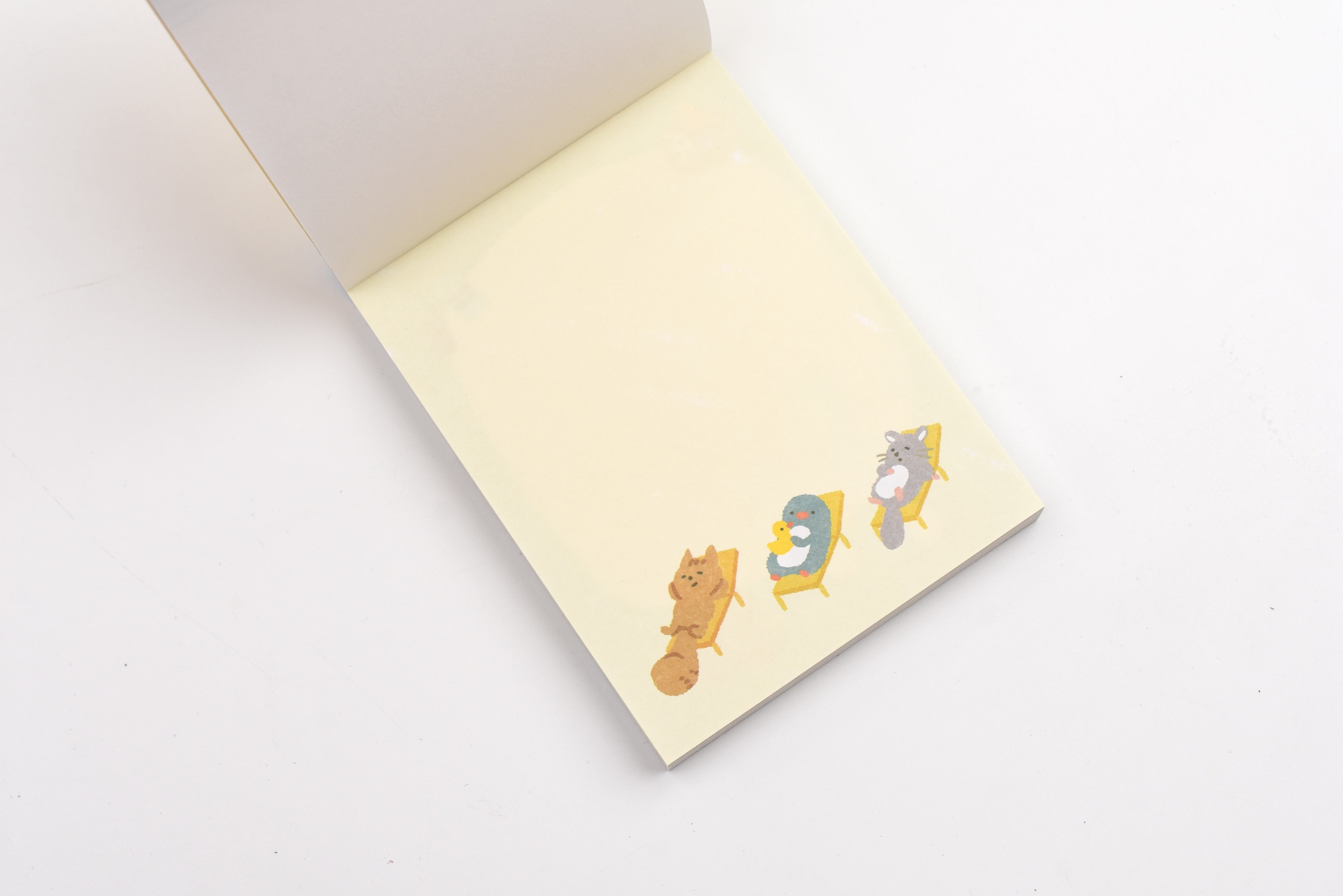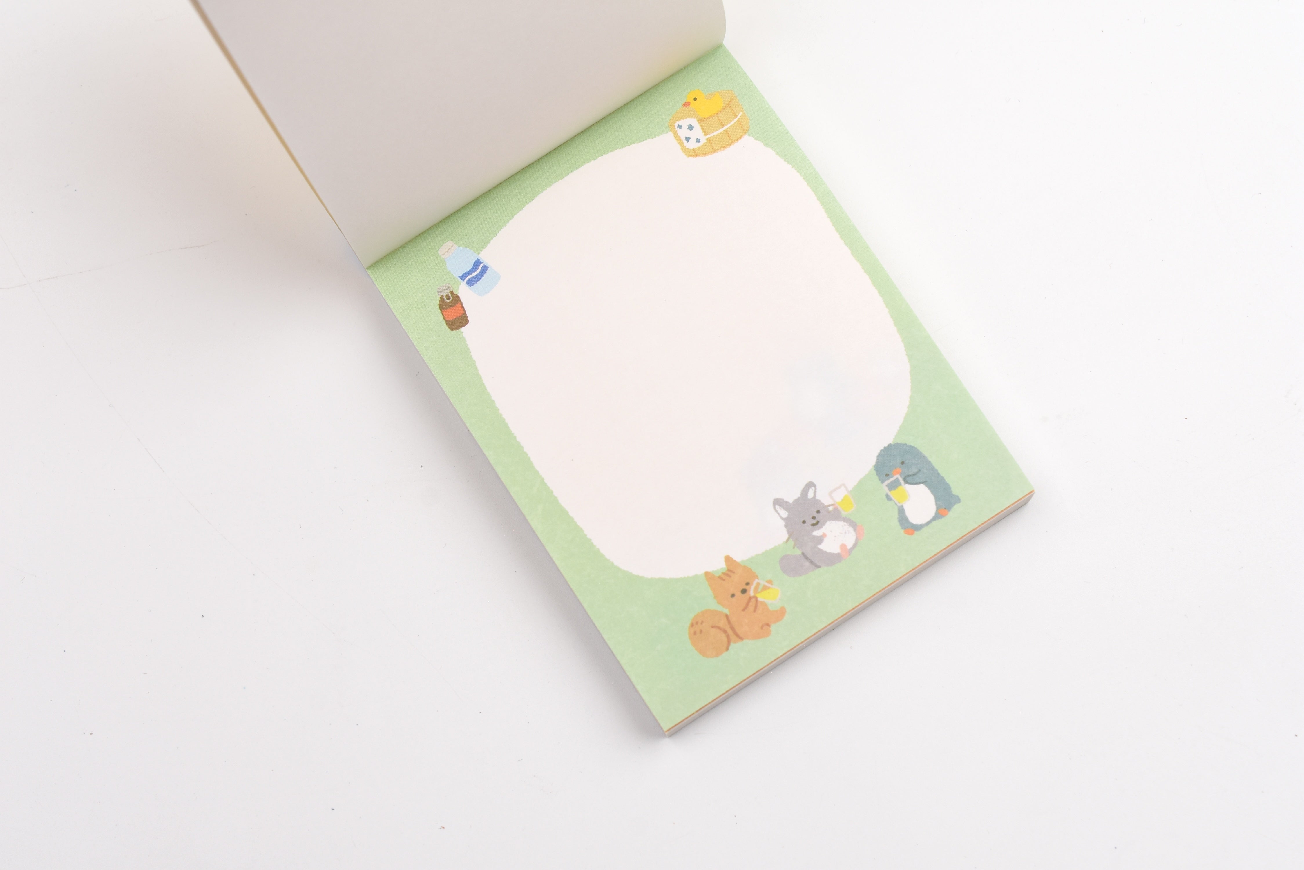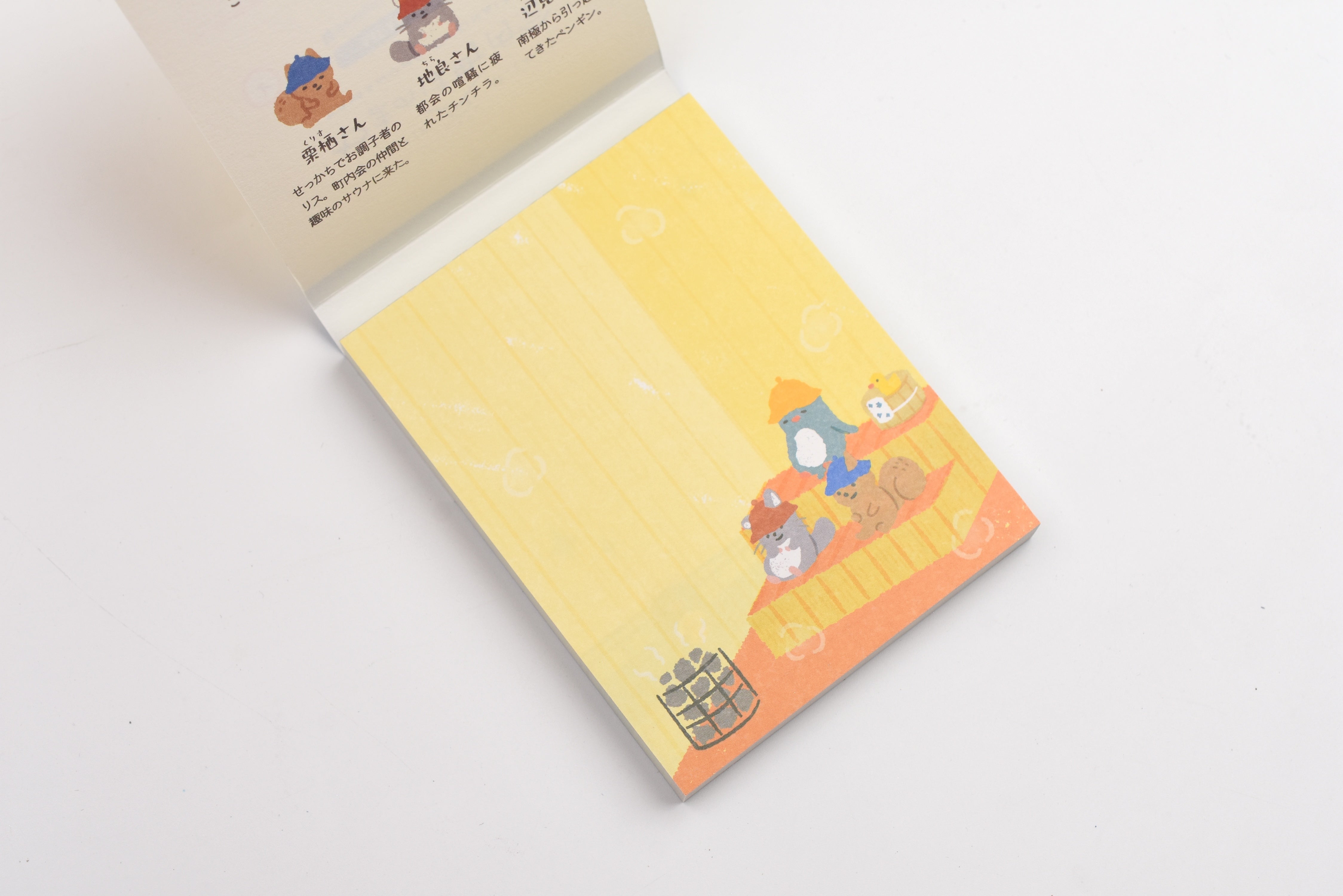 This memo pad features the charming animal characters from the "Yamanoha Chonaikai" (Yamanoha Neighborhood Association) series. With adorable illustrations of animals enjoying a relaxing sauna session, it brings a cozy, feel-good vibe to your notes, reminders, and everyday messages