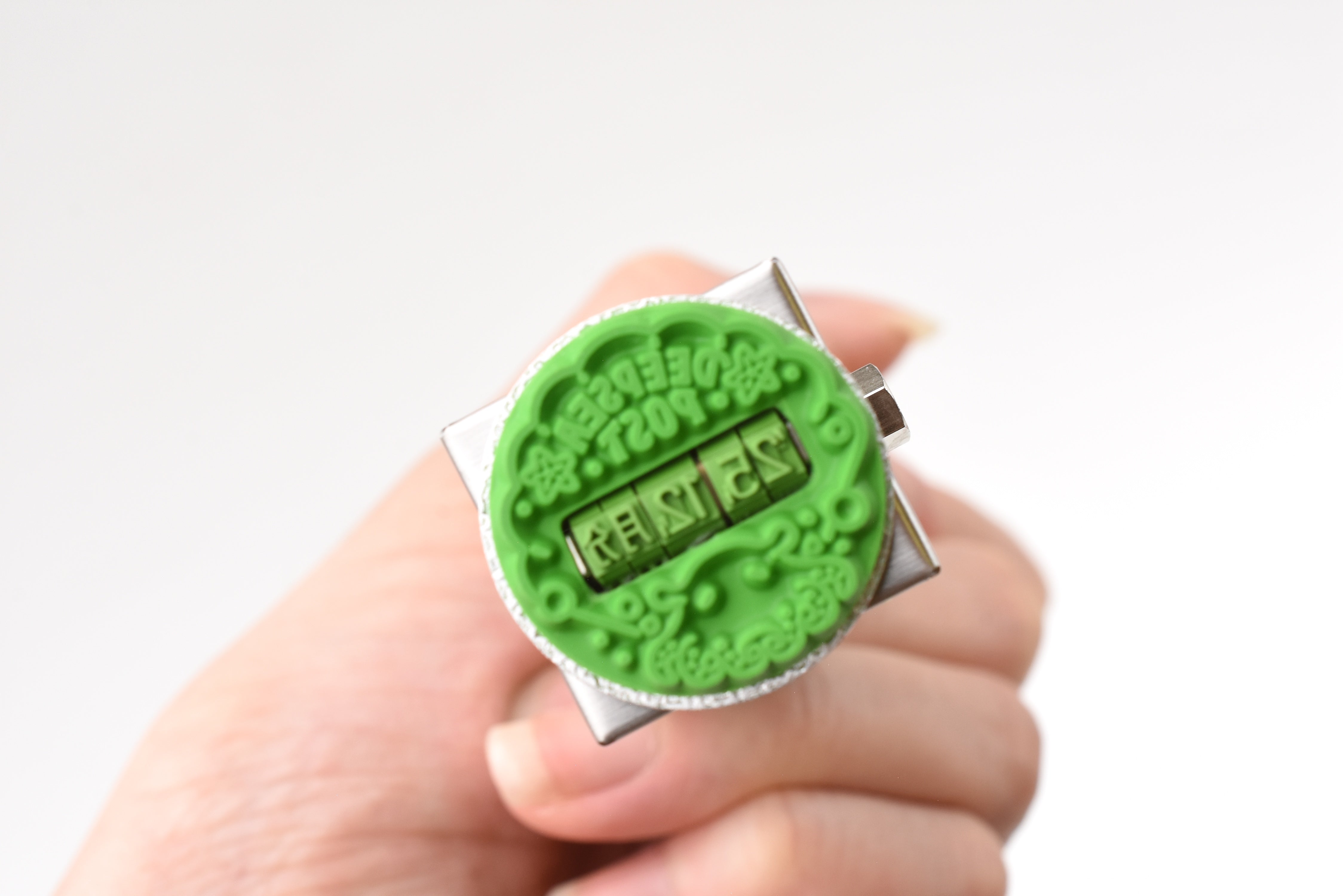 Turn the side gear to adjust the date, or leave it blank and fill in the space yourself. Whether you’re journaling, scrapbooking, or decorating happy mail, this compact stamp brings a pop of personality to your everyday pages.