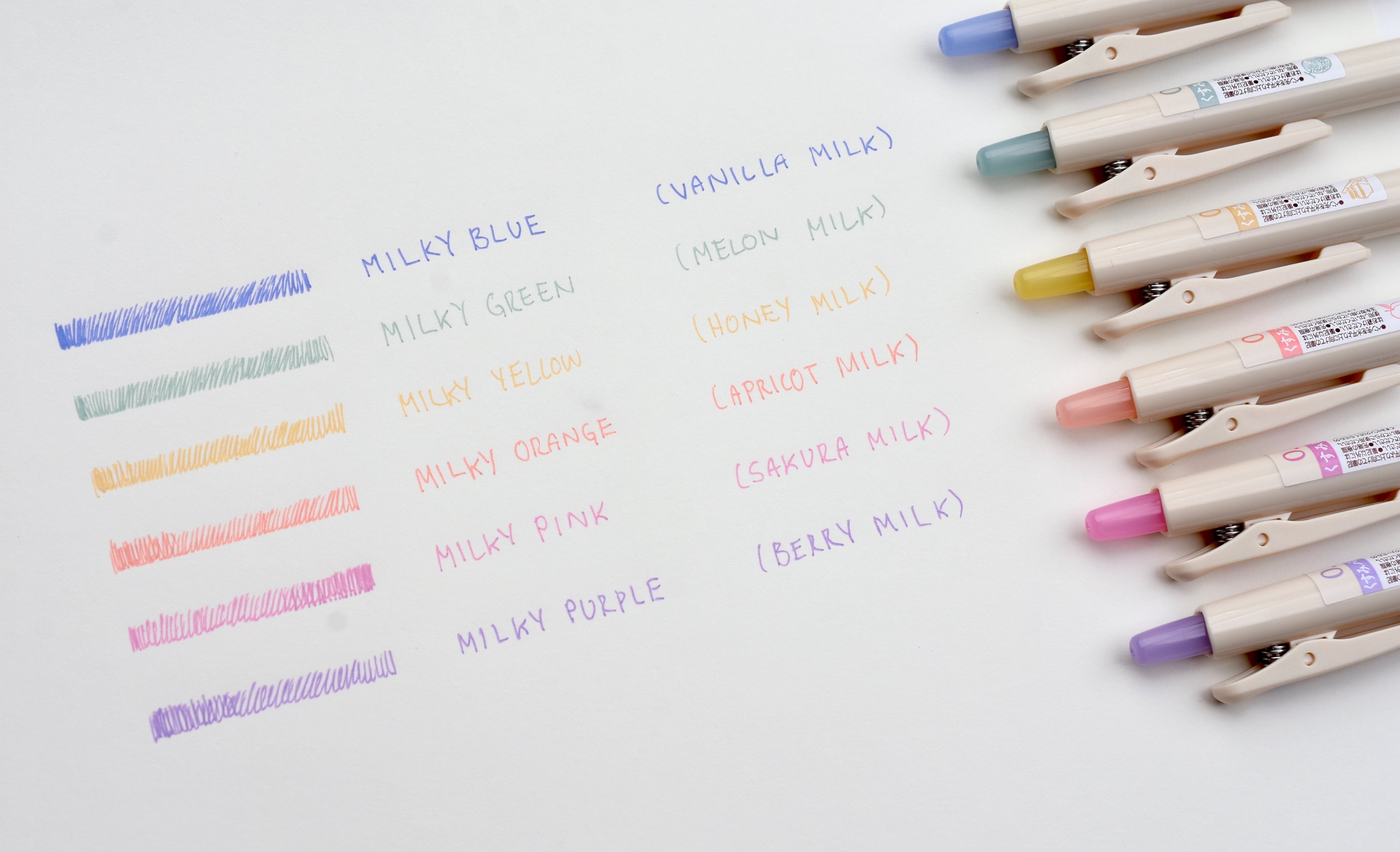 Following the first “Juice Classic Color” released in December last year , this second series is titled “Sweet Milk” with six gentle dusty Limited Edition colors. These pens have a redesigned beige body with transparent colored pressing caps. The sturdy pen tips write smoothly and creates vivid lines, and the gel ink will be water resistant once dried. These colors are slightly opaque, and can be used to write on darker surfaces, too! Each color in this series is inspired by a different-flavored sweet milk, and contains a cute illustration on the label to indicate the flavor.