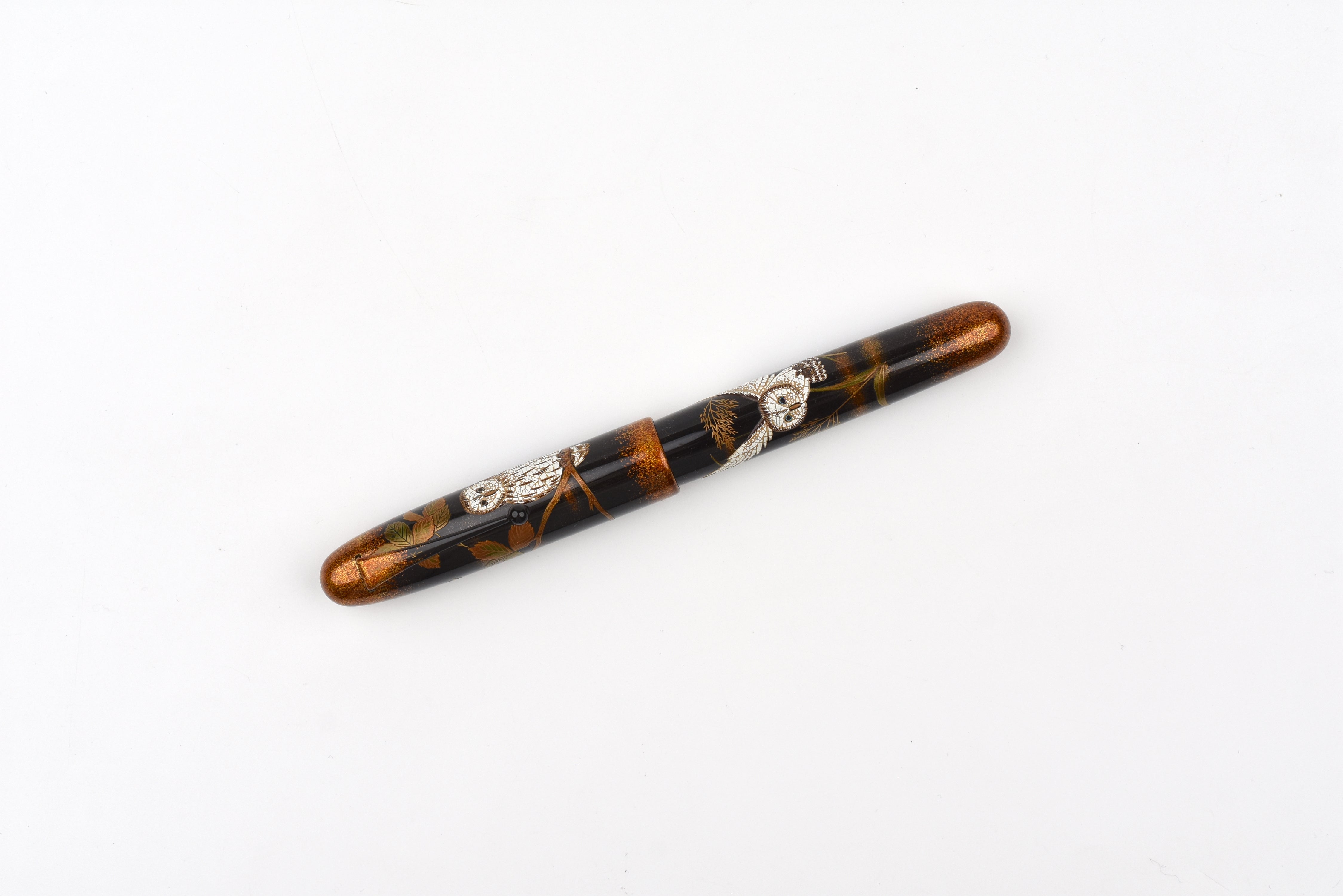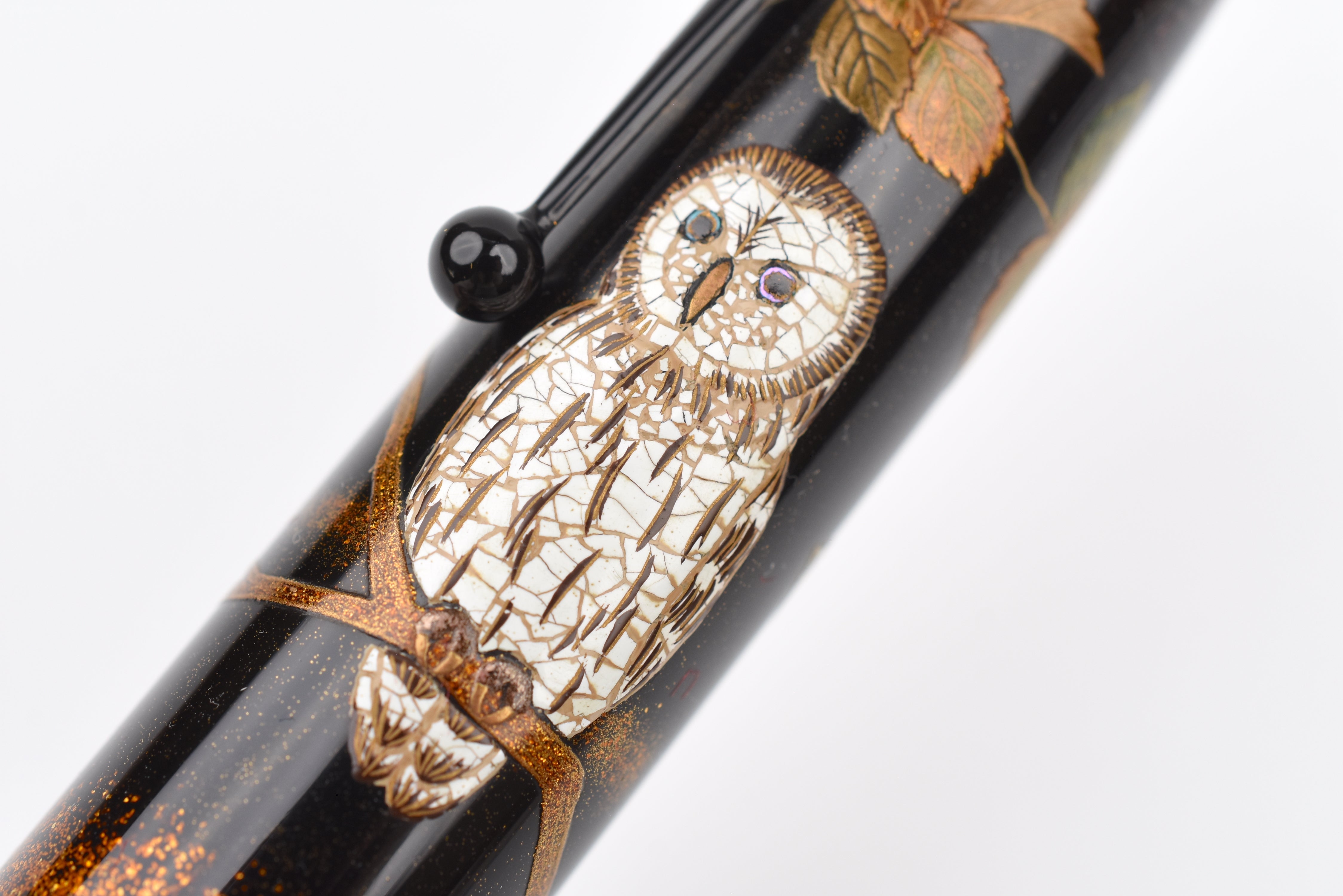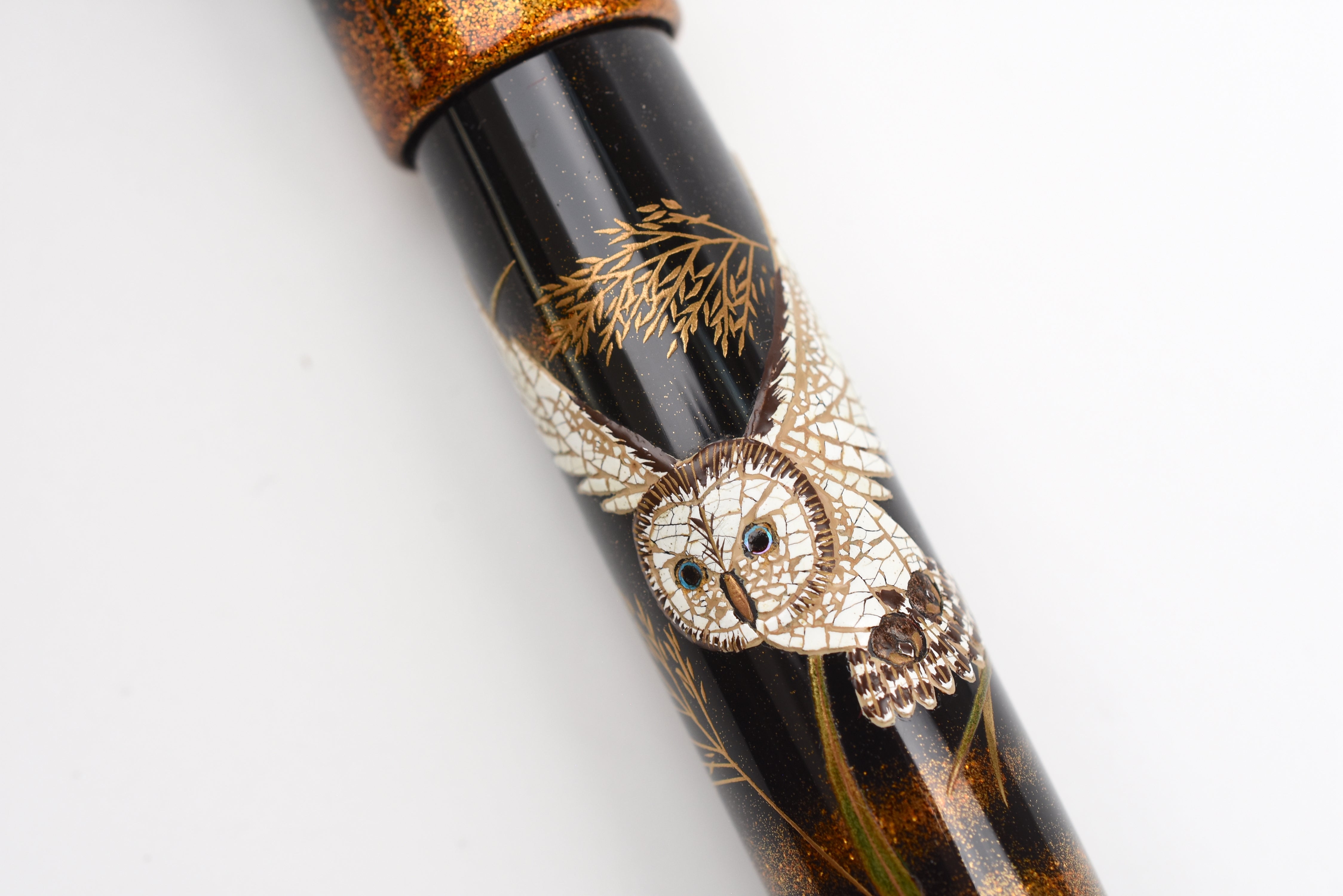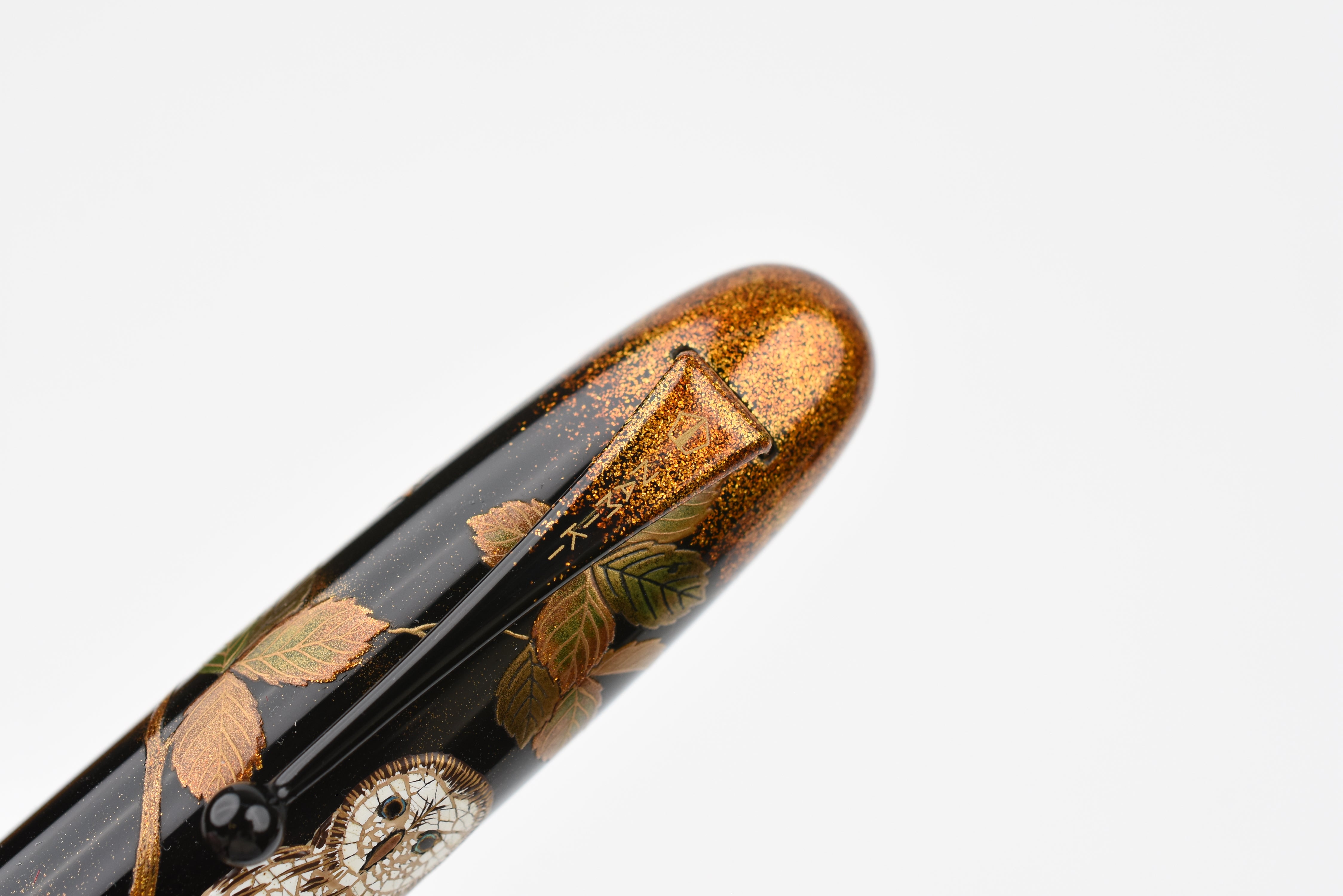 Created by master maki-e artisan Yutaka, this design showcases the refined Togidashi-Taka Maki-e technique. In Japanese culture, the owl (fukuro) symbolizes good fortune and protection, a theme elegantly expressed throughout the artwork. Crafted on an ebonite base, two owls are rendered using the rare Rankaku technique, in which quail eggshell fragments are inlaid and burnished to create remarkable depth and texture. Meanwhile, the Raden technique adds finely cut abalone shell to the owls’ eyes for a subtle, luminous sparkle. One owl perches quietly on the cap atop a Quercus serrata tree, while the other is depicted mid-flight on the barrel, capturing the bird’s silent precision. Multiple layers of clear urushi lacquer protect the surface and give the pen its deep, lustrous finish, highlighting the exceptional craftsmanship and detail.