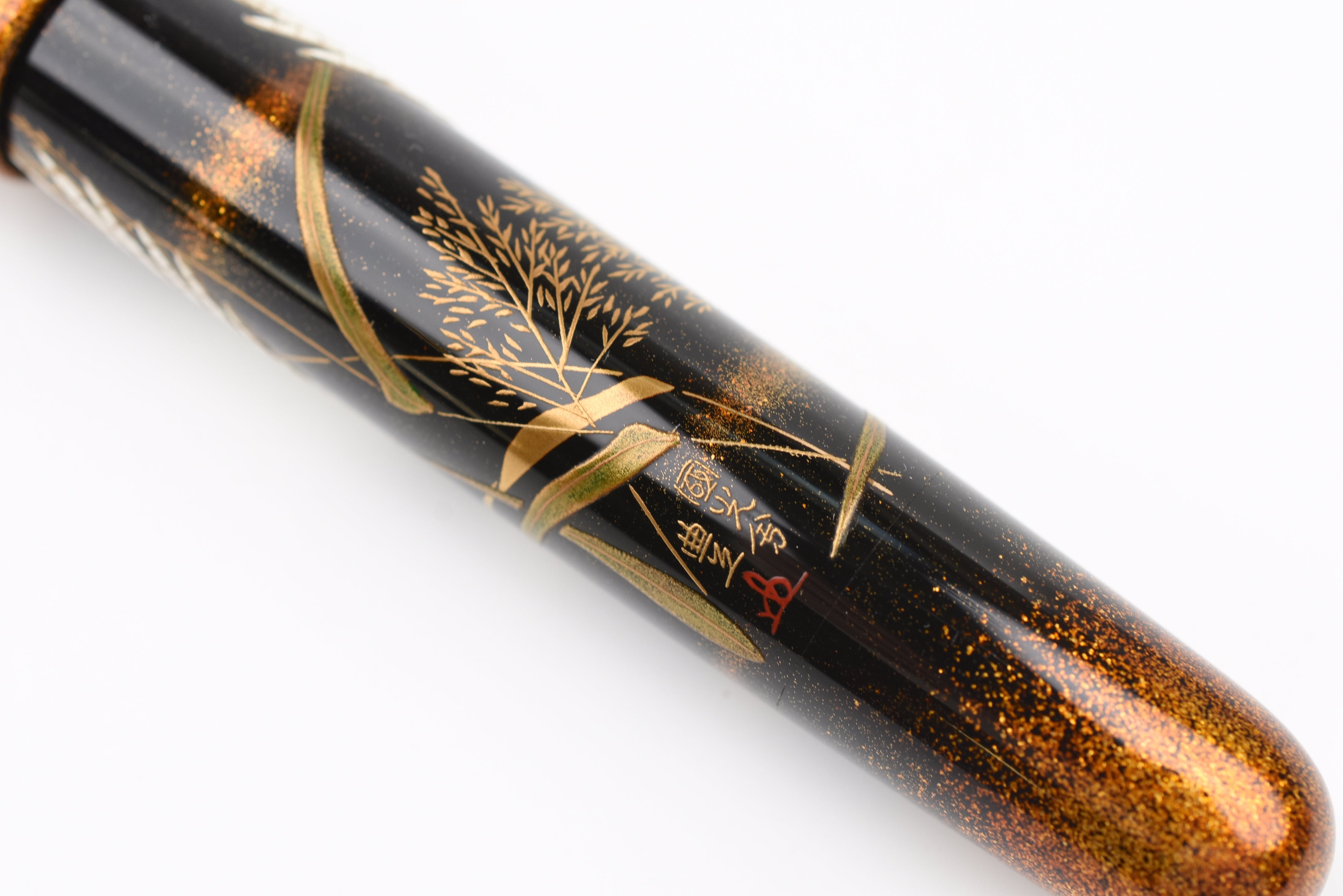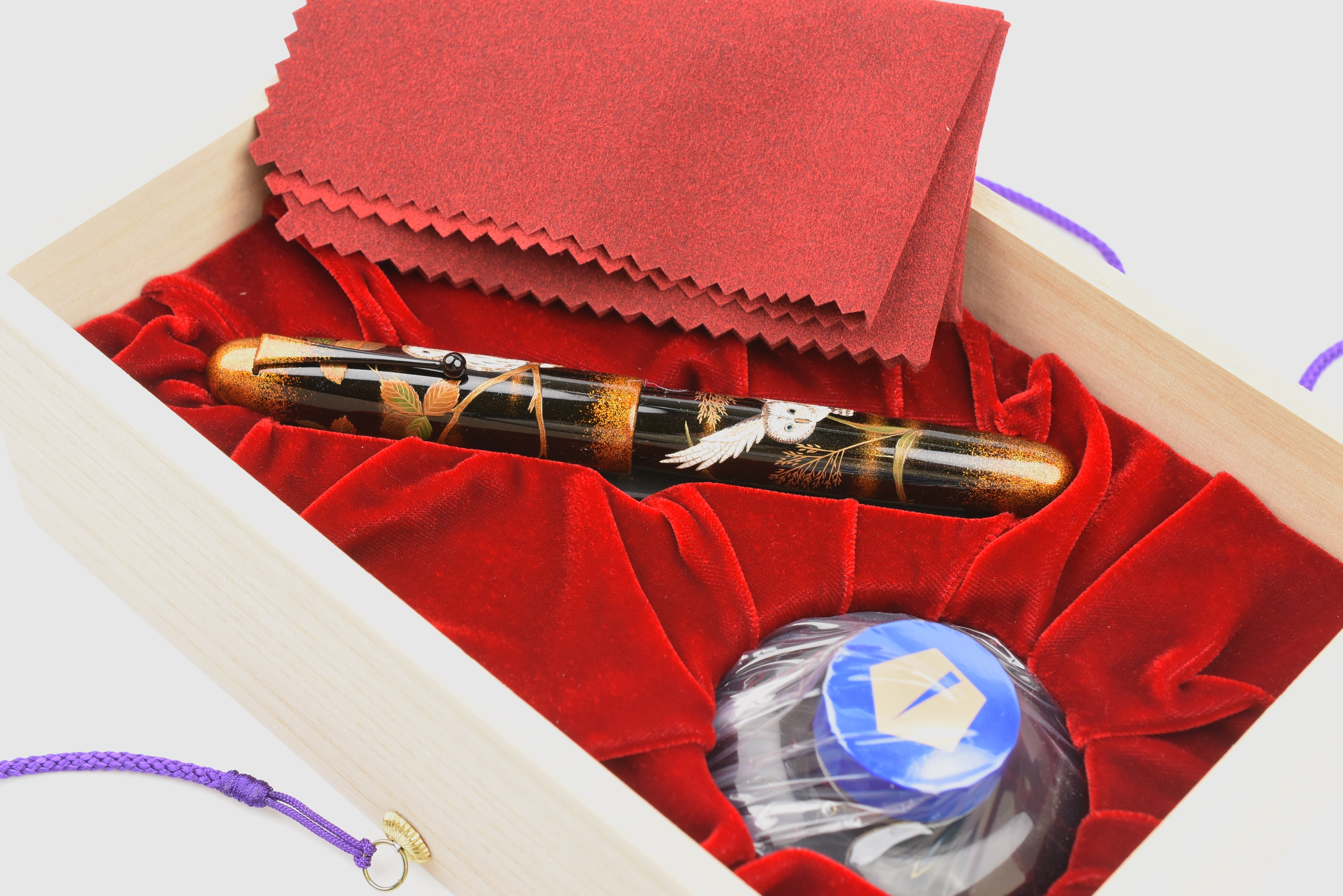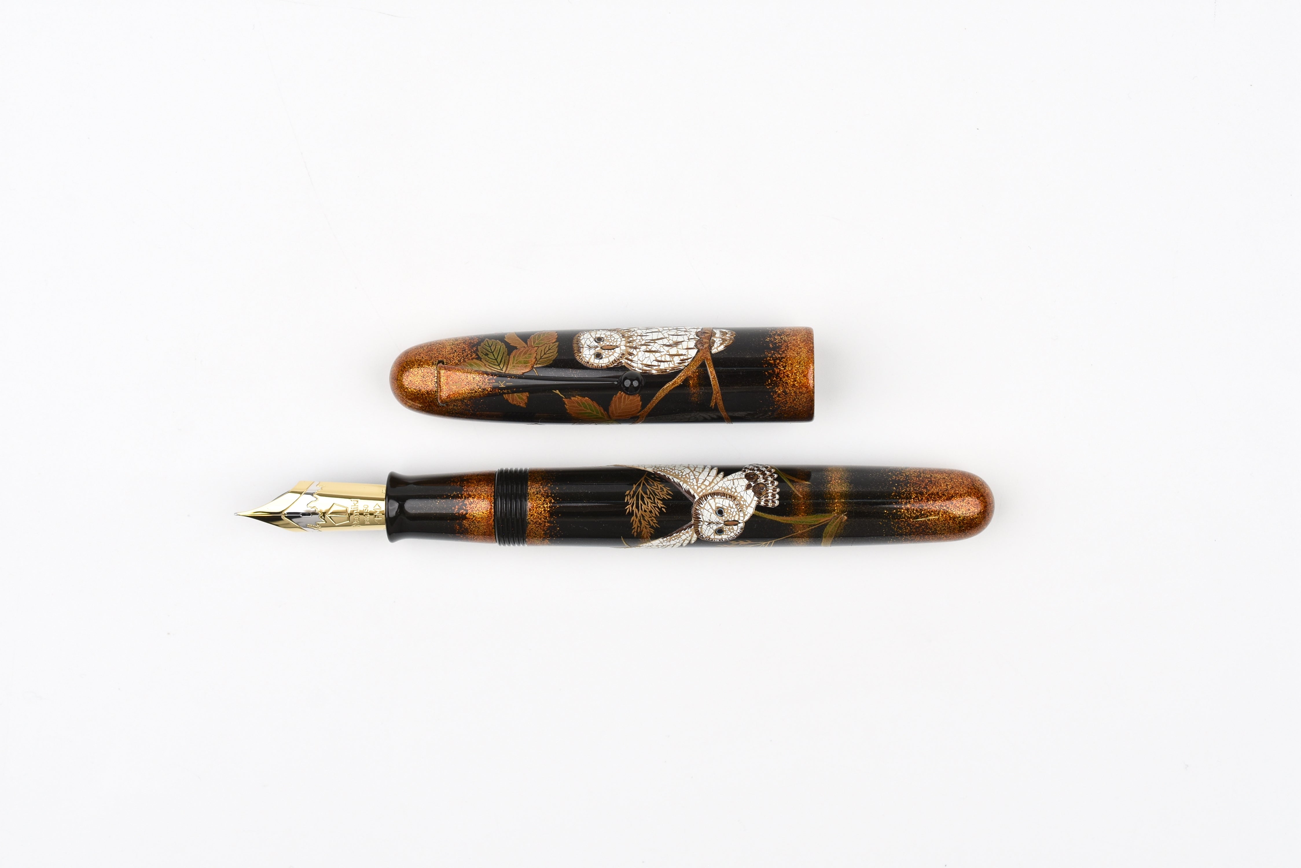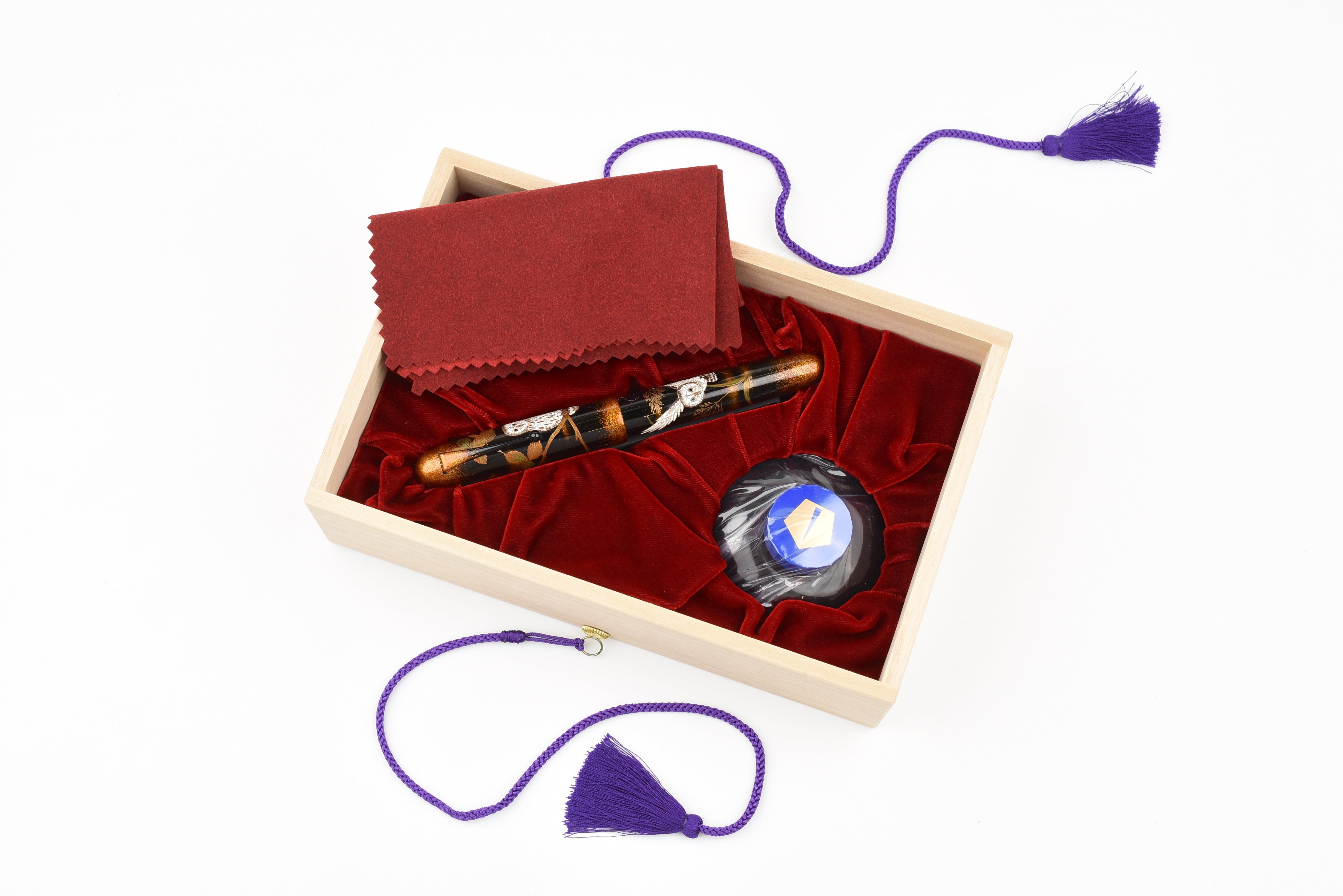 Created by master maki-e artisan Yutaka, this design showcases the refined Togidashi-Taka Maki-e technique. In Japanese culture, the owl (fukuro) symbolizes good fortune and protection, a theme elegantly expressed throughout the artwork. Crafted on an ebonite base, two owls are rendered using the rare Rankaku technique, in which quail eggshell fragments are inlaid and burnished to create remarkable depth and texture. Meanwhile, the Raden technique adds finely cut abalone shell to the owls’ eyes for a subtle, luminous sparkle. One owl perches quietly on the cap atop a Quercus serrata tree, while the other is depicted mid-flight on the barrel, capturing the bird’s silent precision. Multiple layers of clear urushi lacquer protect the surface and give the pen its deep, lustrous finish, highlighting the exceptional craftsmanship and detail.