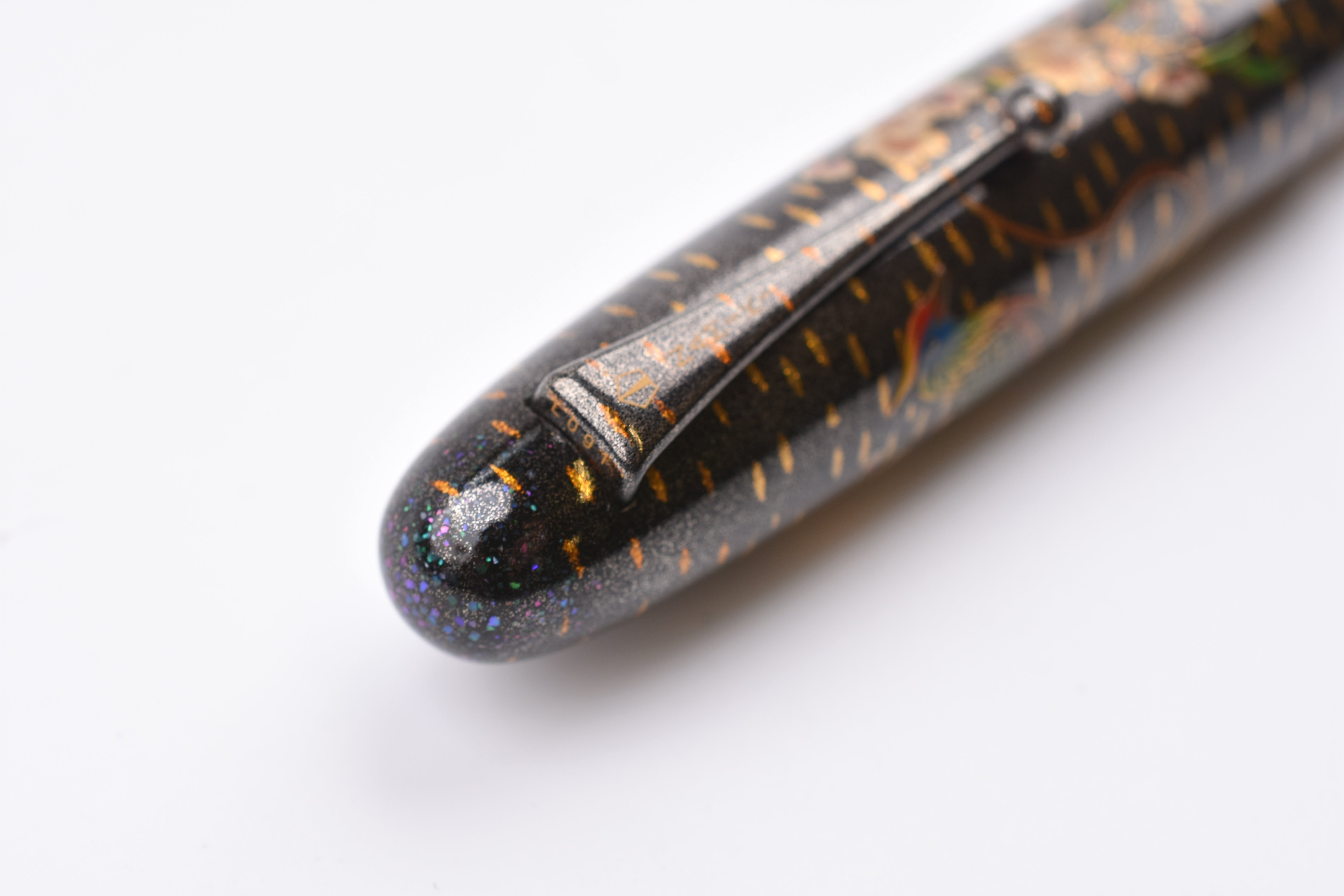 The Emperor Collection is Namiki's highest ranking series, representing the pinnacle of artistry, tradition, and luxury. Each pen is made from ebonite and fitted with a massive No. 50 (Jumbo) 18k gold nib, reminiscent of Namiki’s historic Maki-e pens from a century ago. The collection includes two types of pens: one without a clip, allowing you to enjoy the design uninterrupted around the entire barrel, and one with a clip for added functionality. It fills via eyedropper and includes an ink stopping mechanism for precise ink flow.