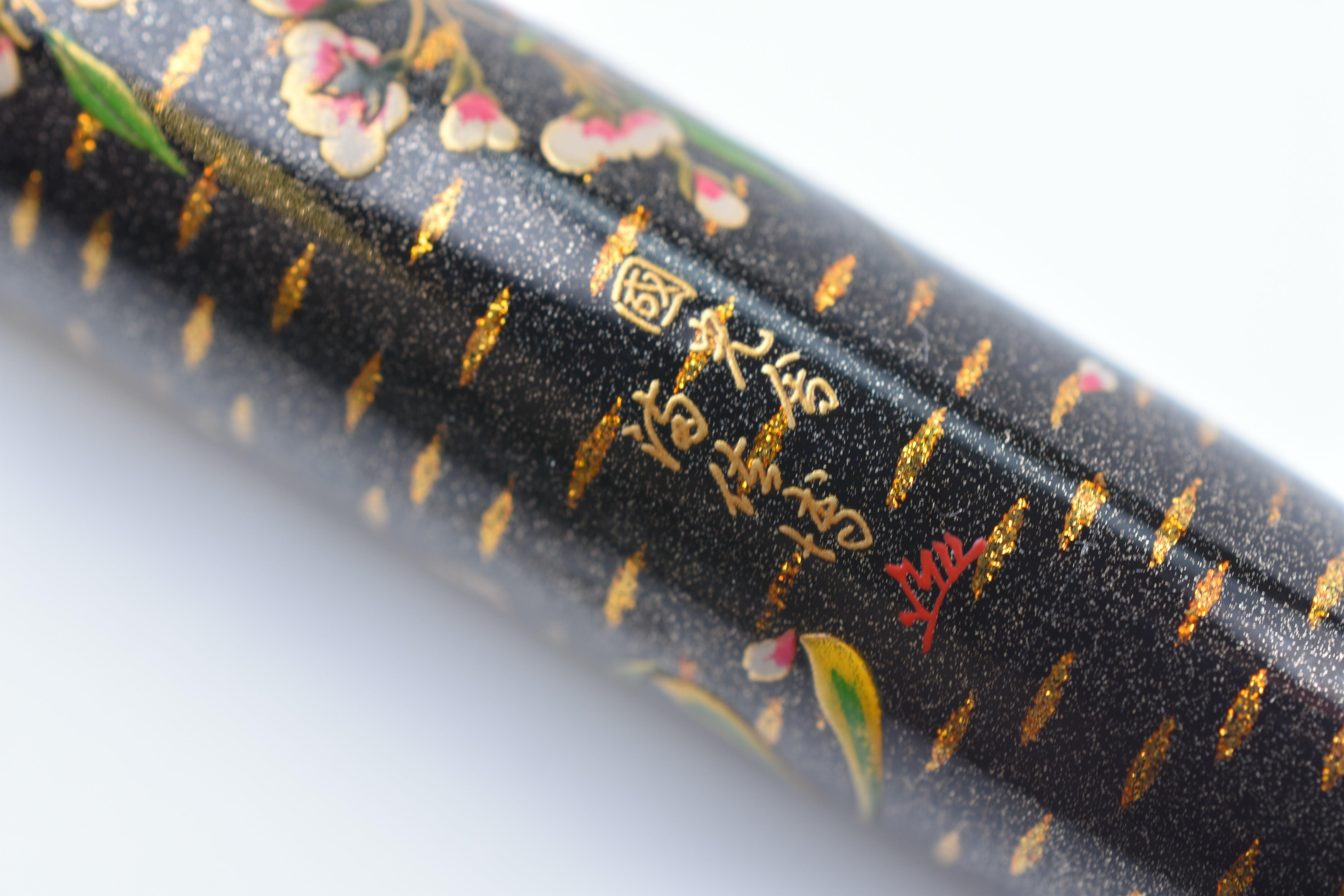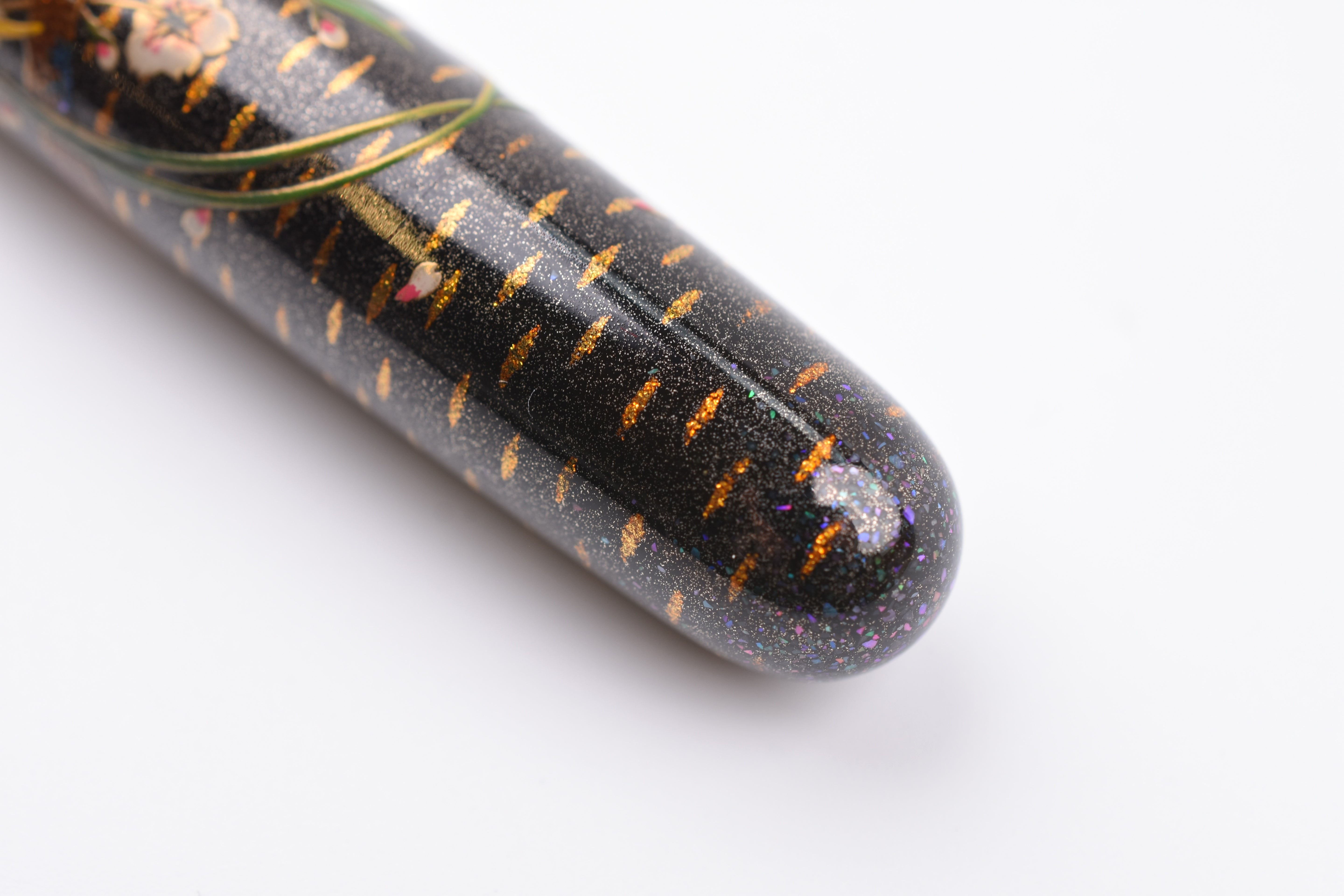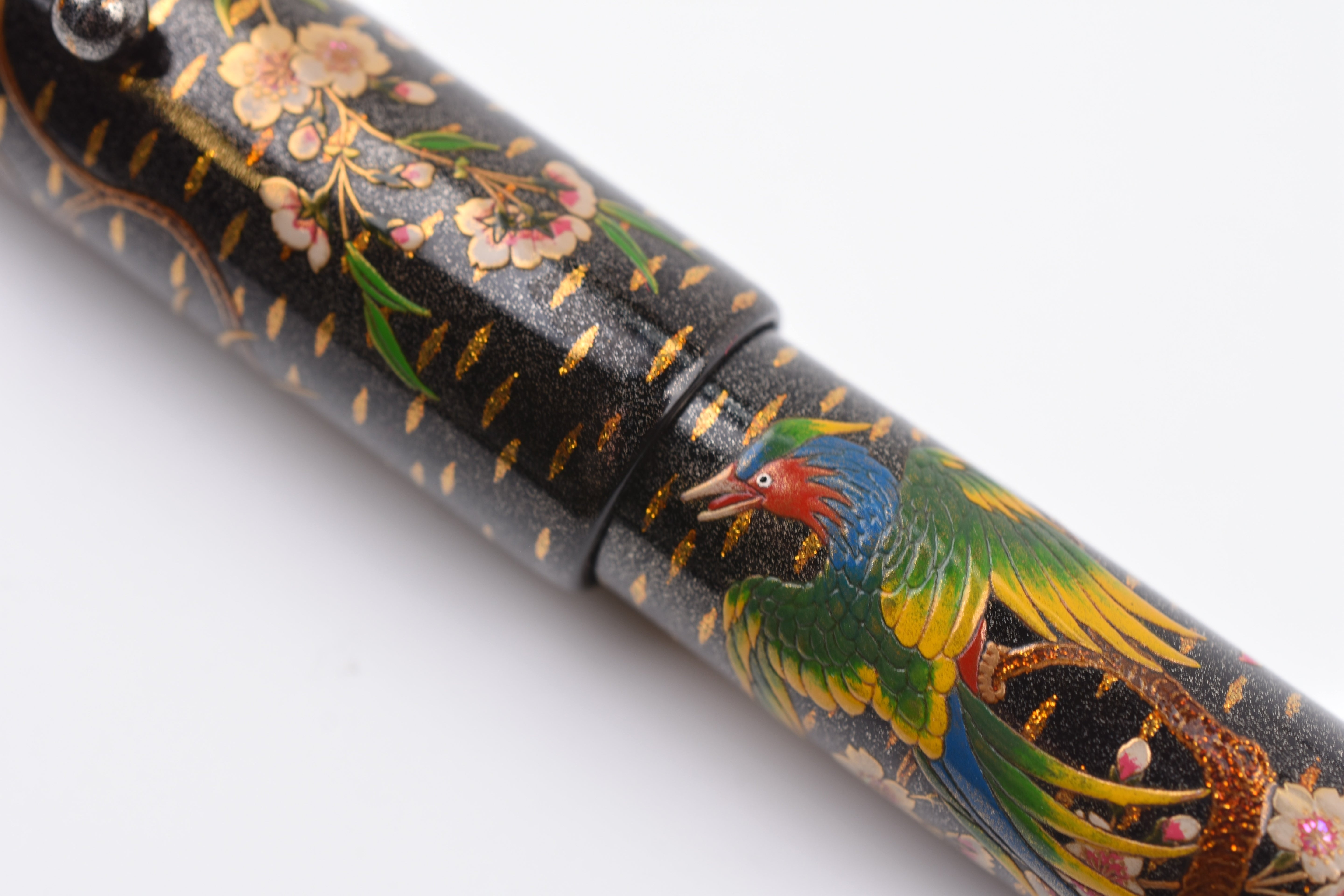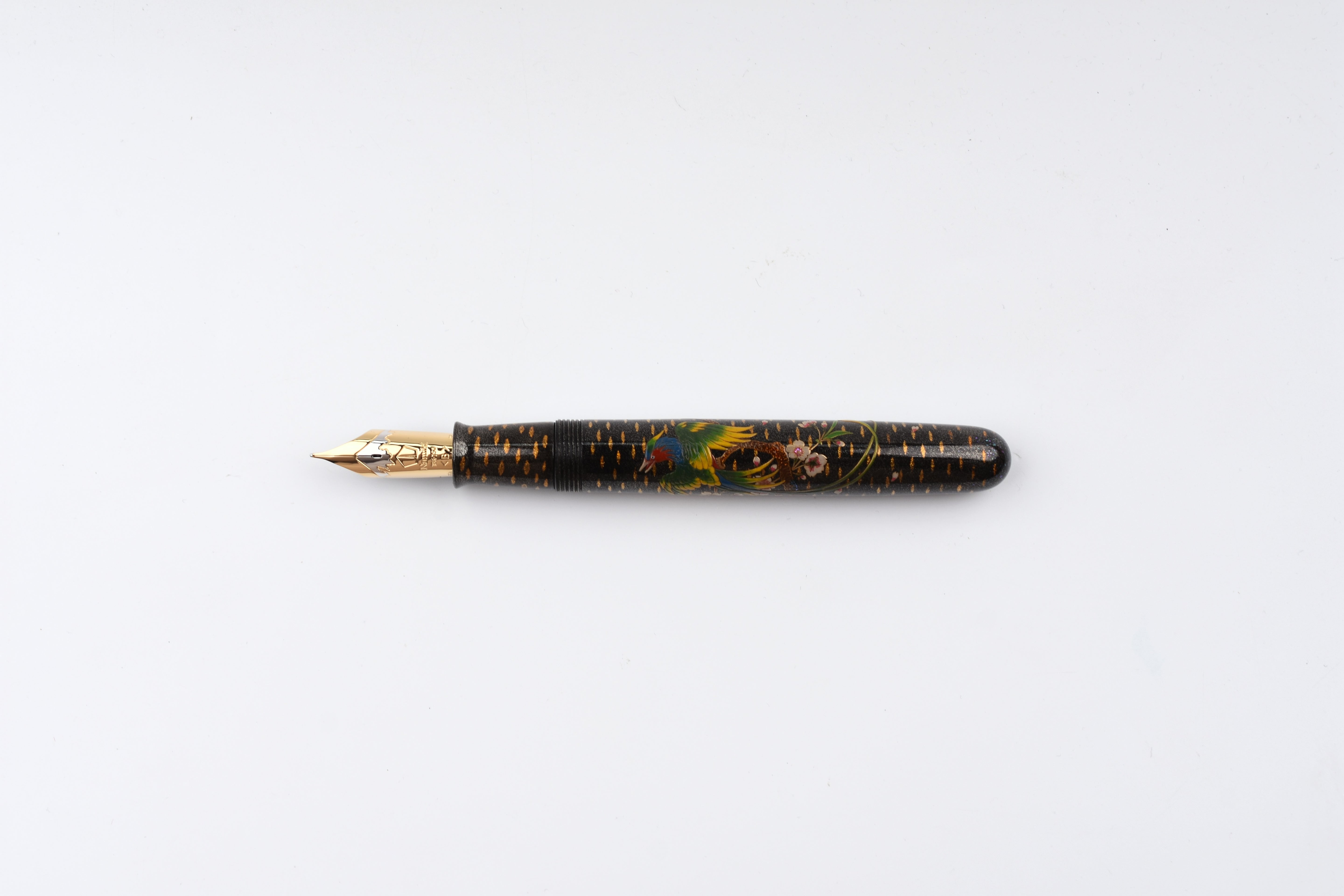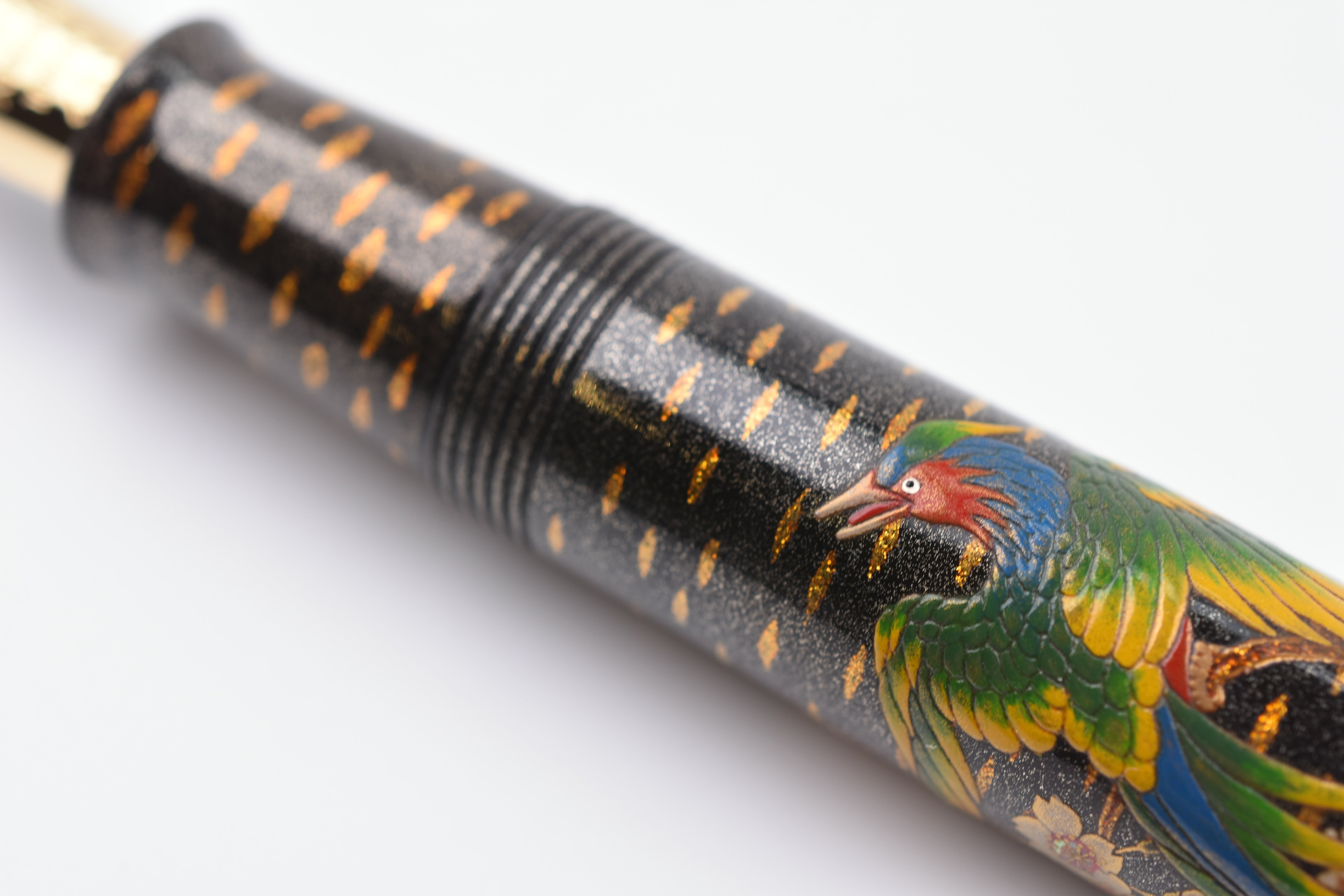 Designed by renowned artisan Mashiro Yamada, this fountain pen is a breathtaking celebration of love, serenity, and tradition. Inspired by the mythical Rakucho—phoenix-like birds said to soar through a heavenly paradise and symbolize peace—it features two of these elegant creatures representing eternal love and a happy marriage. Rendered using the traditional Togidashi Taka Maki-e technique, the Rakucho are depicted in vibrant color and textured detail as they fly gracefully among weeping cherry blossom branches. The background mimics the deep, charcoal-toned texture of cherry blossom bark, achieved through Oh-hi-nuri, a complex form of Kawari-nuri never before seen on Namiki’s Maki-e pens. Delicate cherry blossom petals, inlaid with shimmering mother-of-pearl and polished to a radiant finish, complete this exceptional work of art.