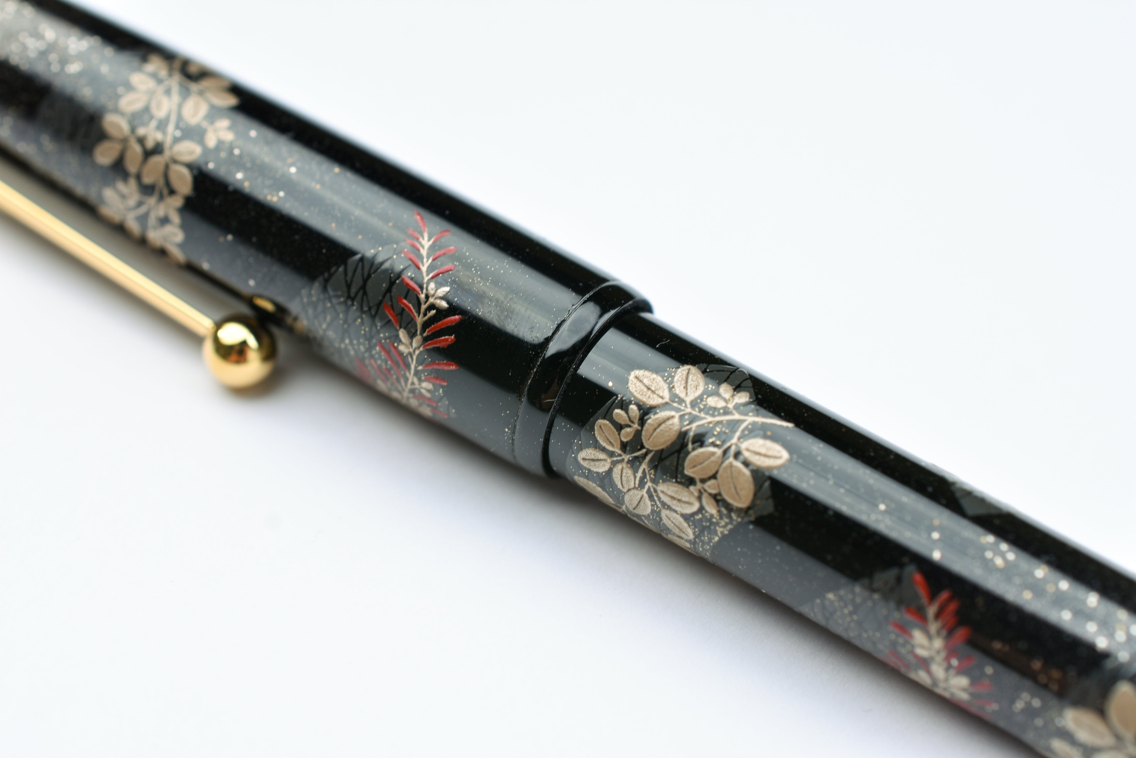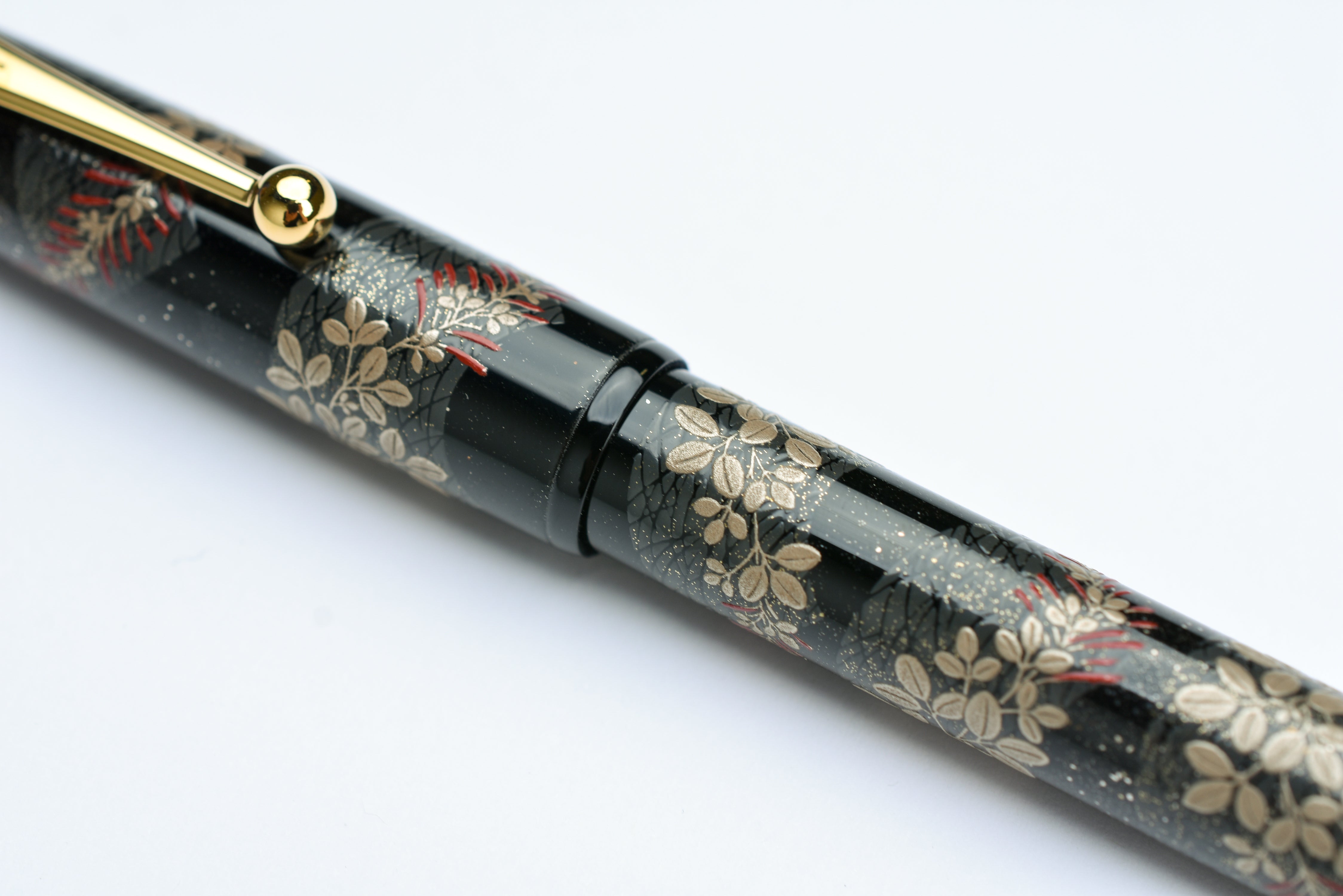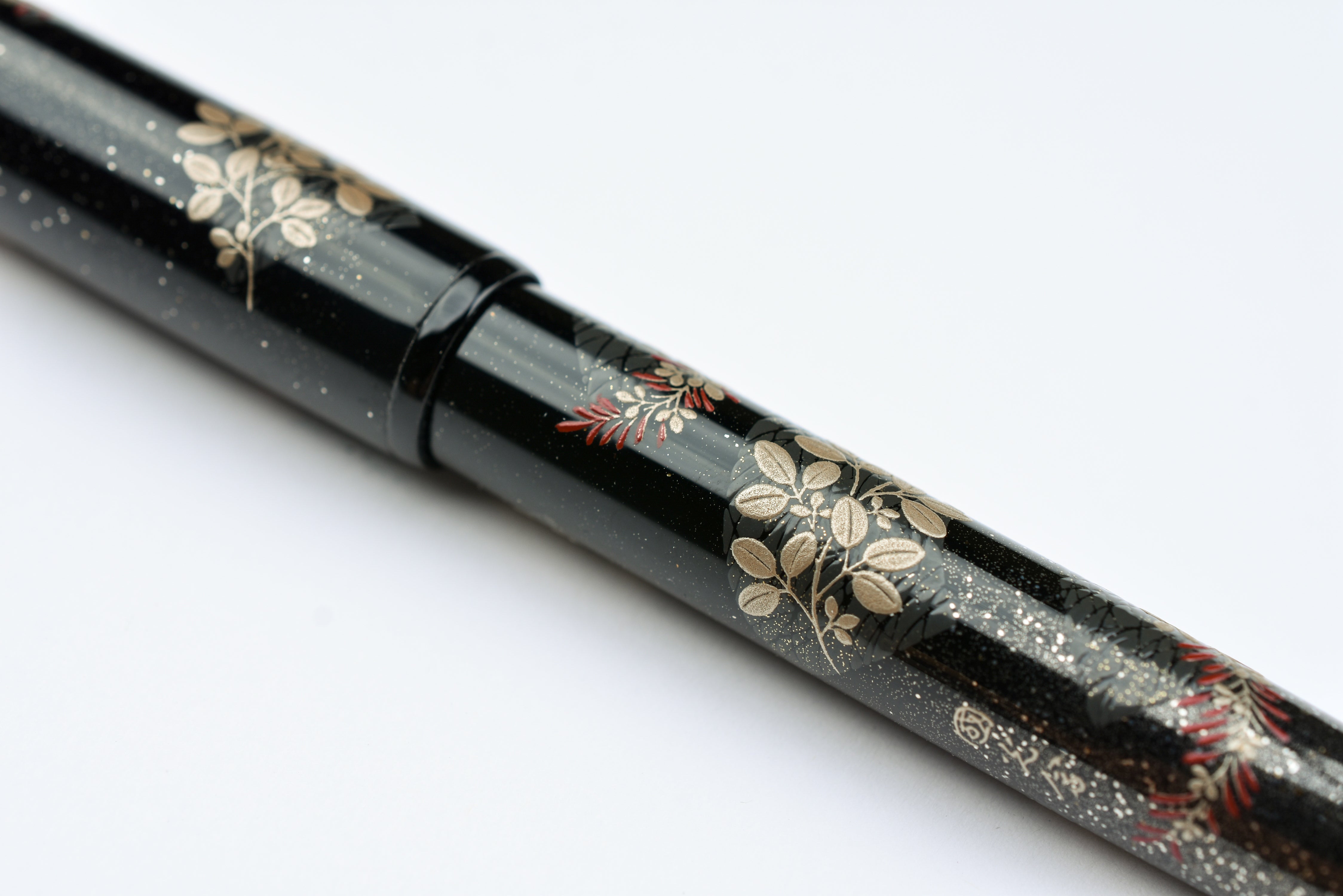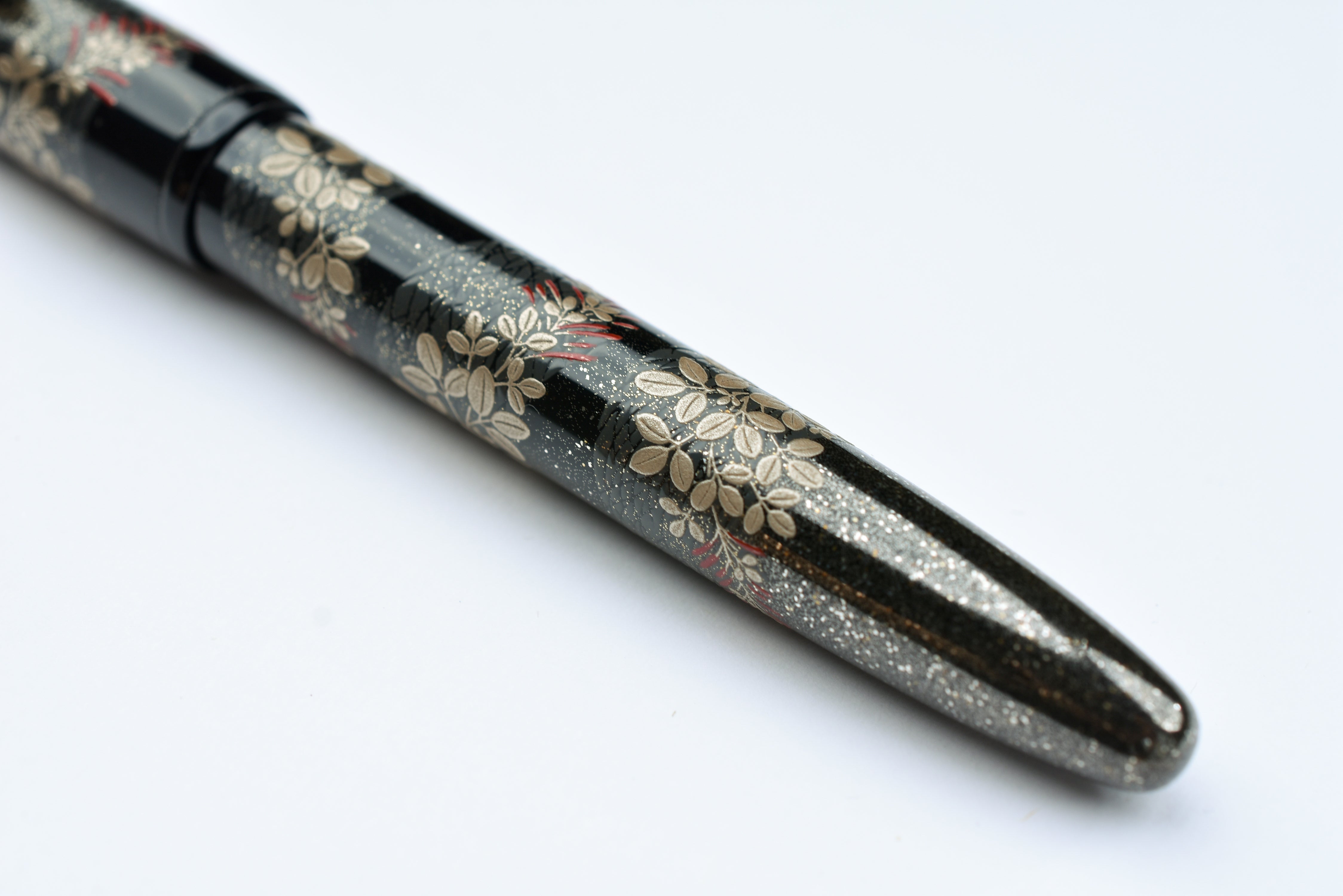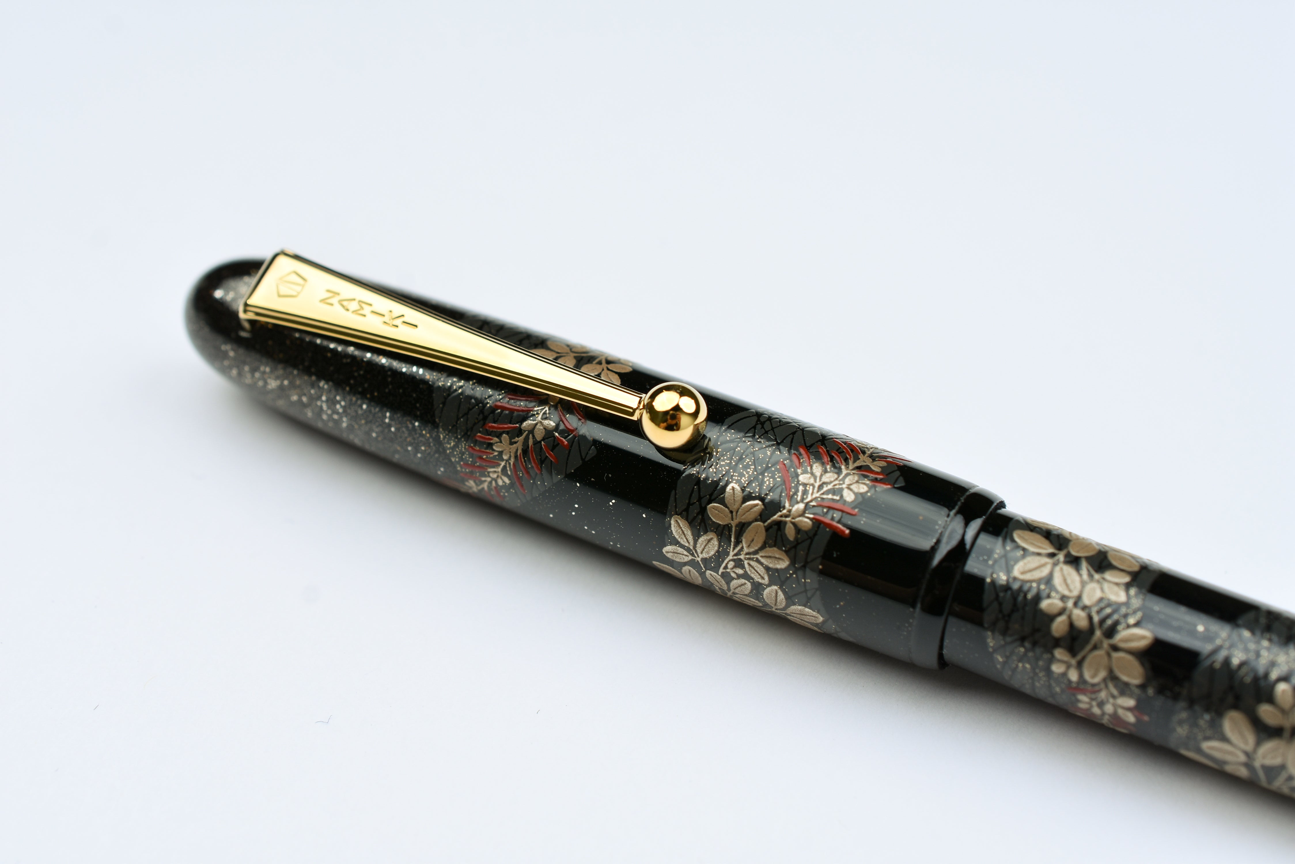 Pilot Namiki Yukari Maki-e Fountain Pen - Bush Clover. The Bush Clover, also known as Hagi, bud in the spring and reach full bloom in early fall. They are one of the seven flowers of autumn and often referenced in Japanese poems and books. The Bush Clover is often used to symbolize the deep contemplation that arises from gentle, assuming beauty.